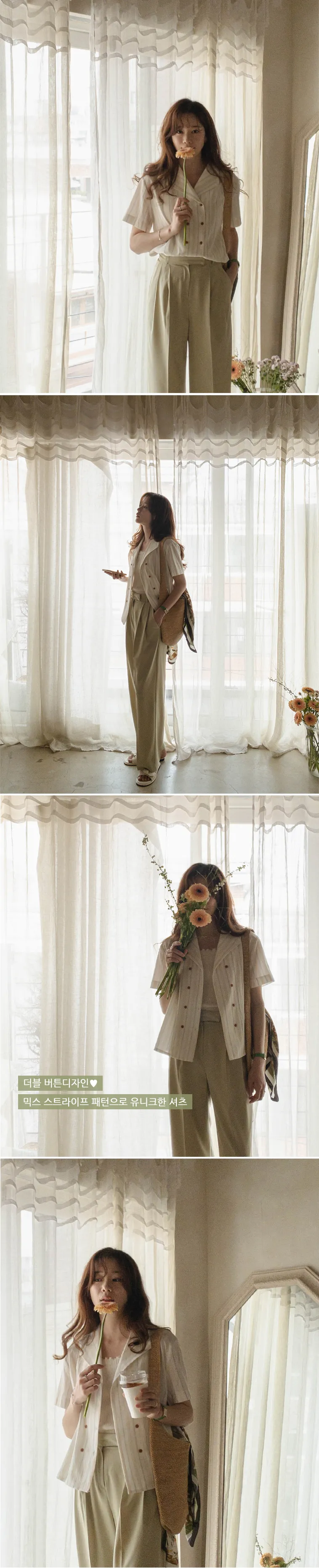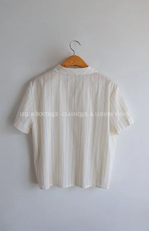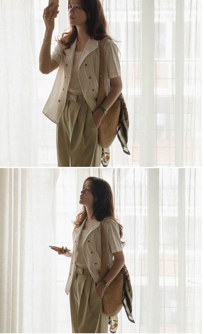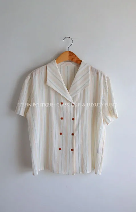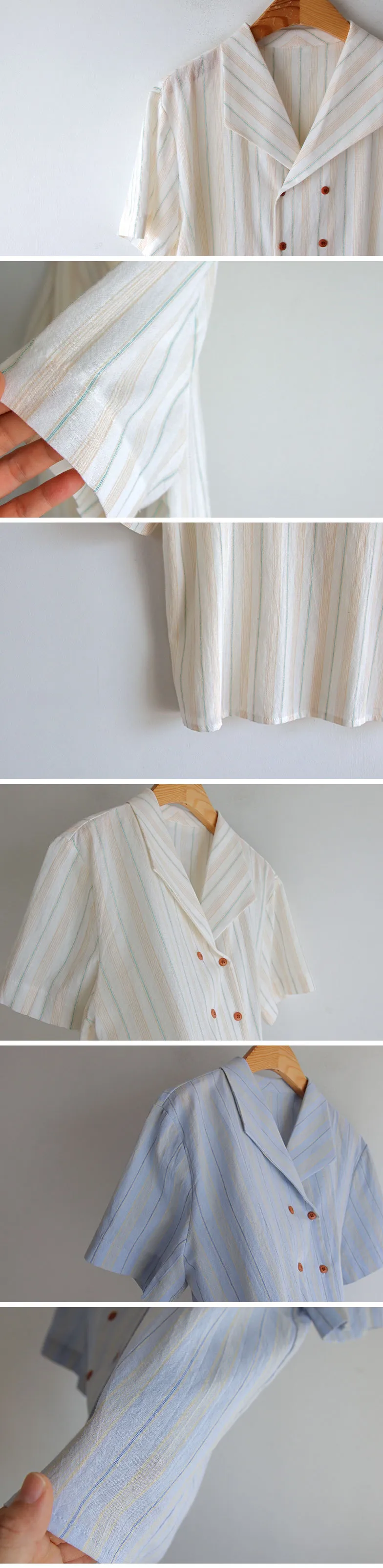 迷人混色條紋木色雙排扣短袖襯衫 乳白色穿搭照