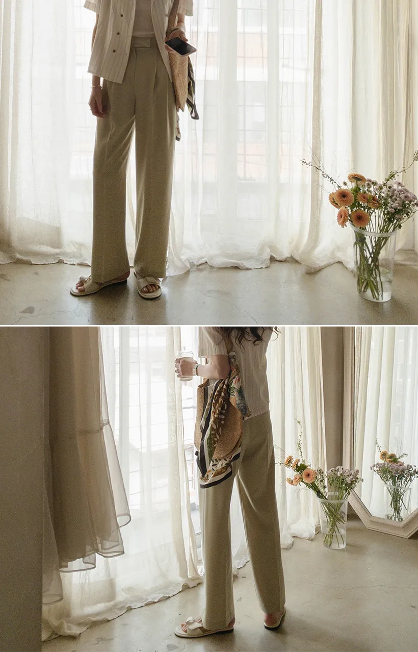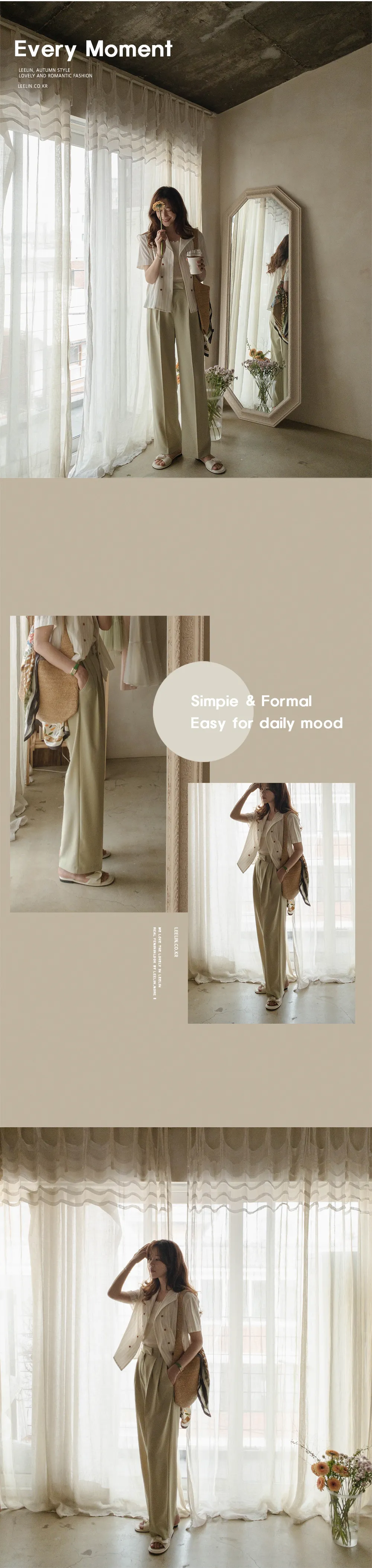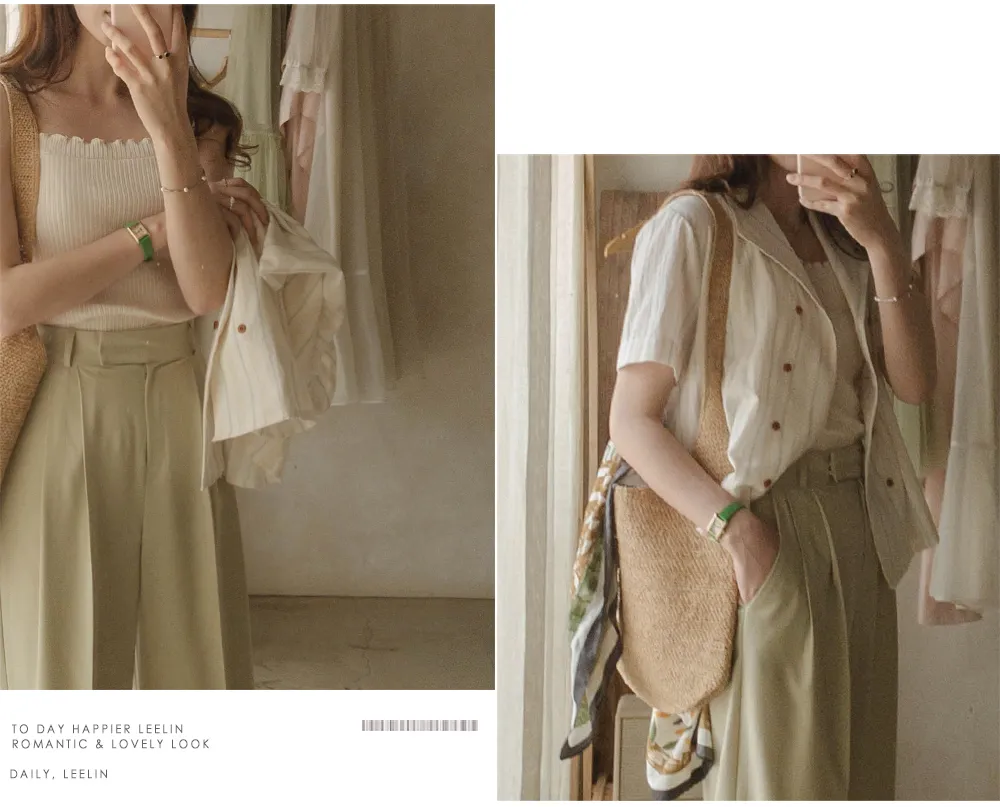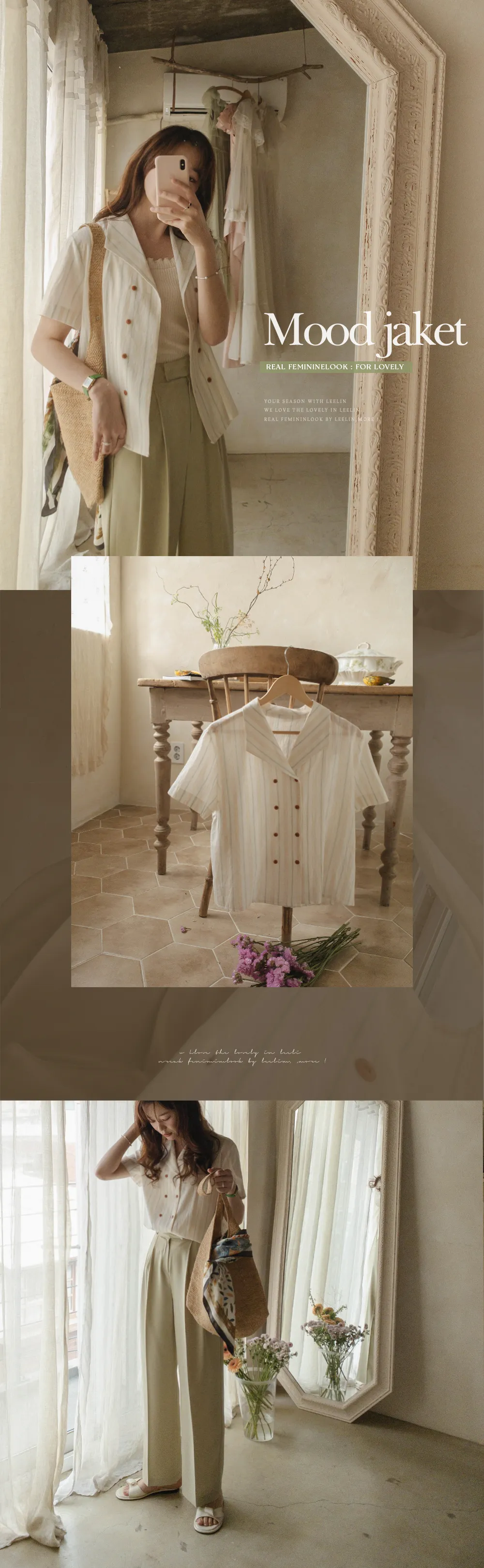 迷人混色條紋木色雙排扣短袖襯衫 乳白色穿搭照
