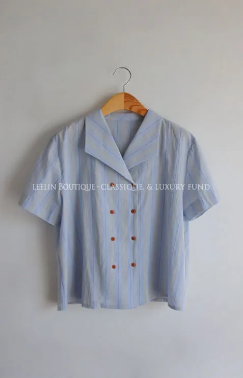 迷人混色條紋木色雙排扣短袖襯衫 淡藍色穿搭照