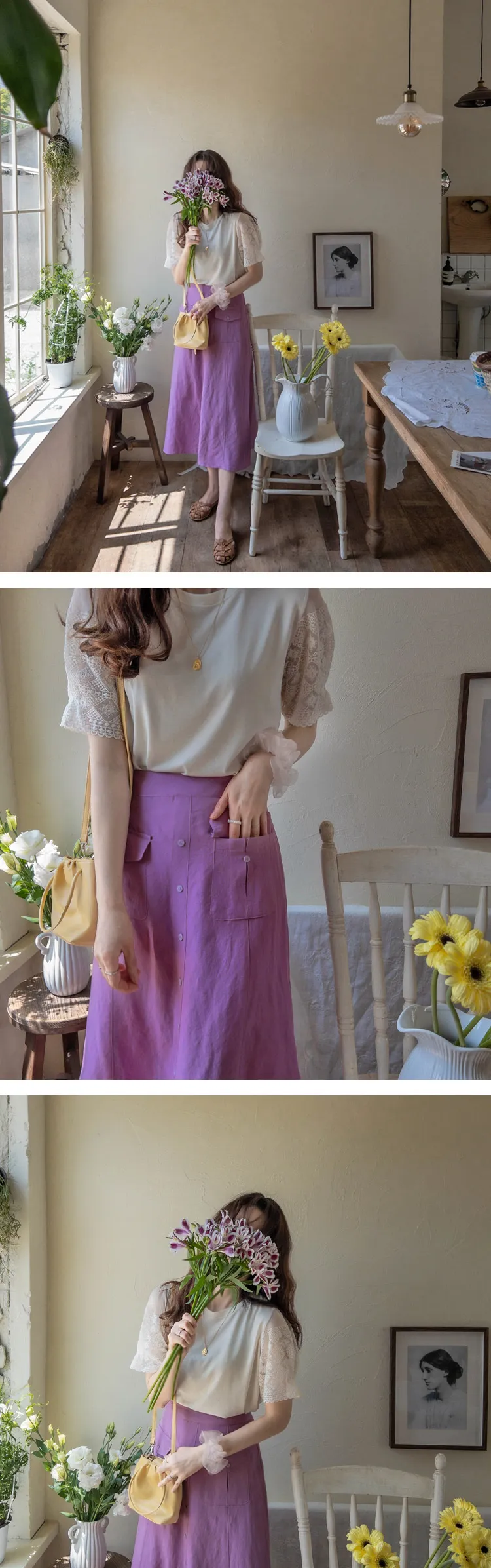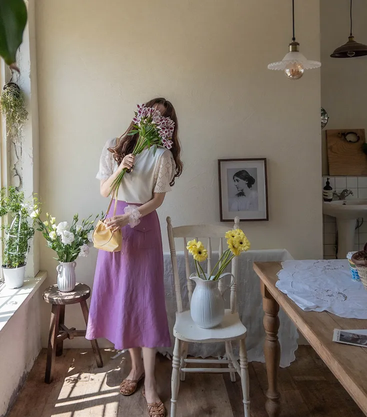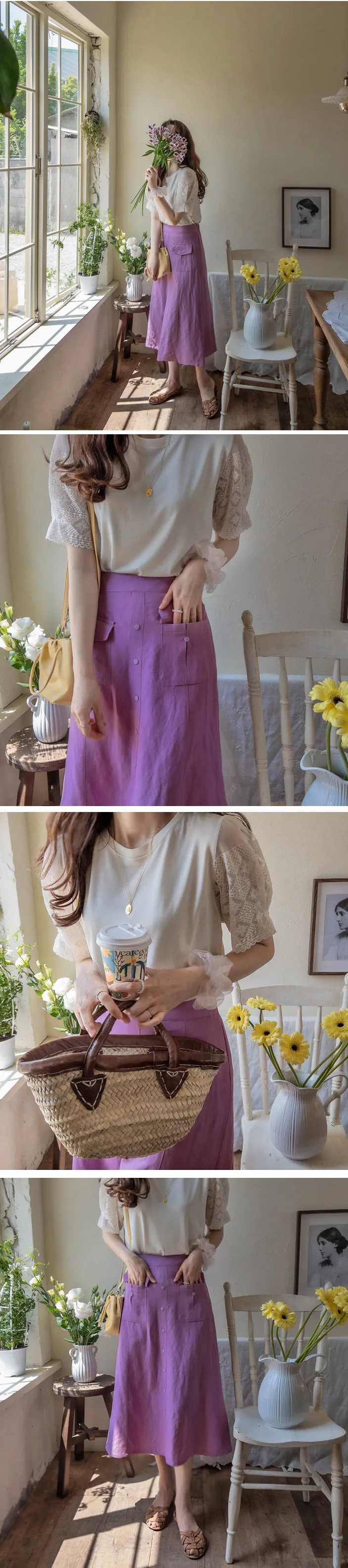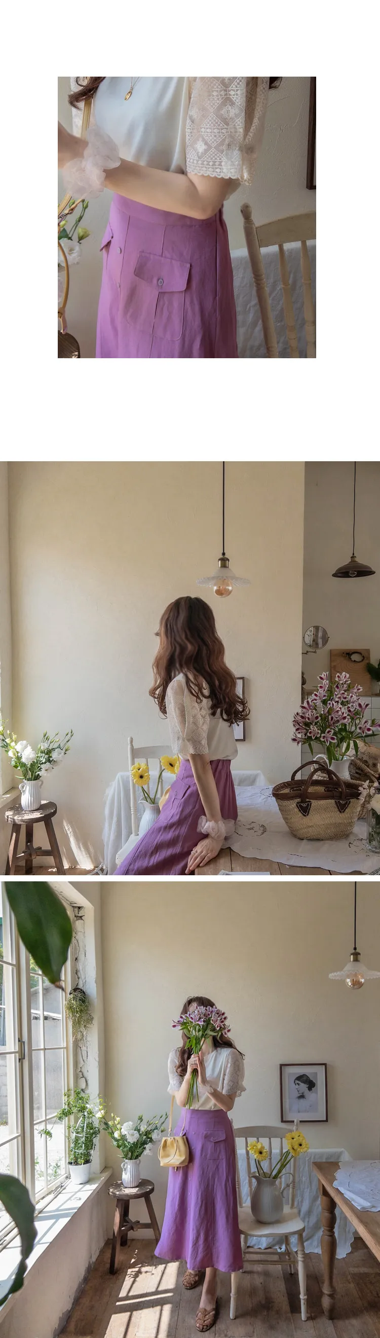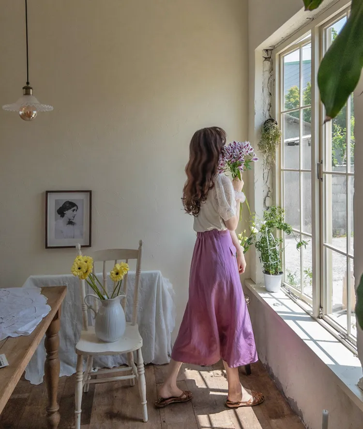 清新色彩口袋排扣造型設計腰部彈性中長裙
