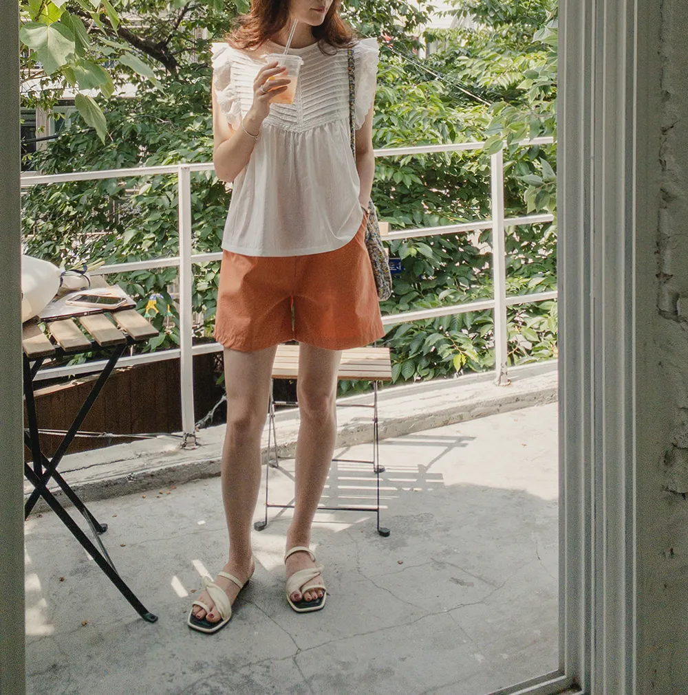 ] [輕盈的雙針褶邊短褲] [半A字形的修身輪廓] [背帶和高腰線的牢固貼合]