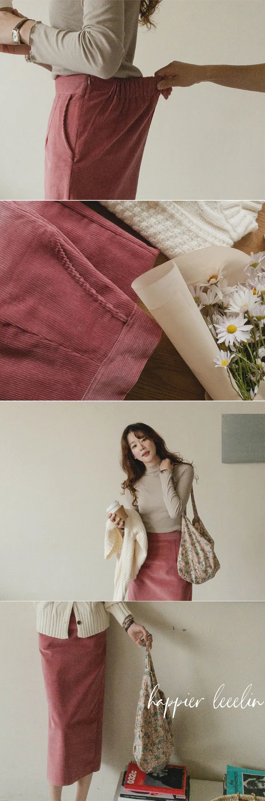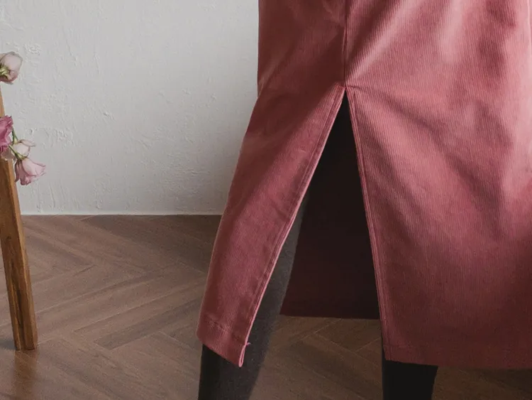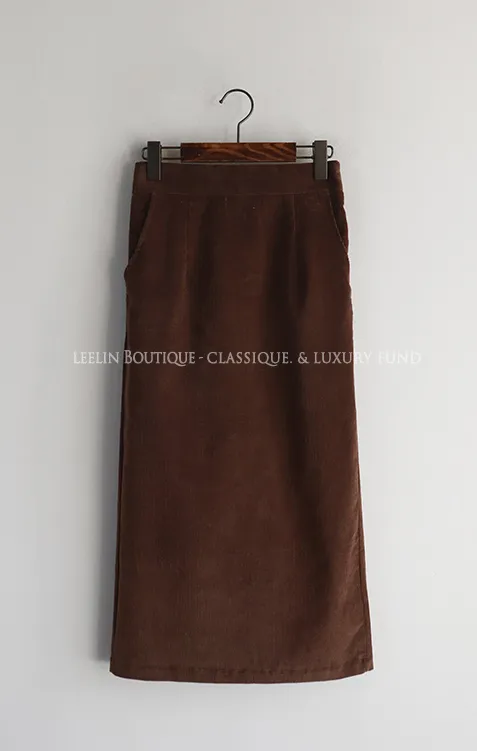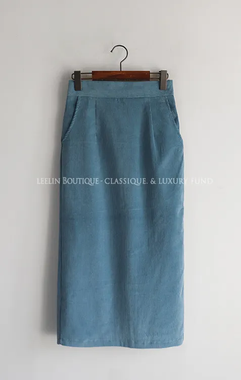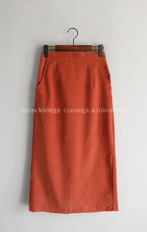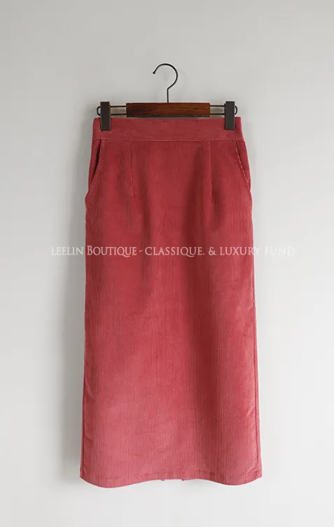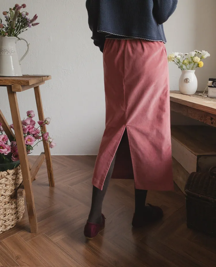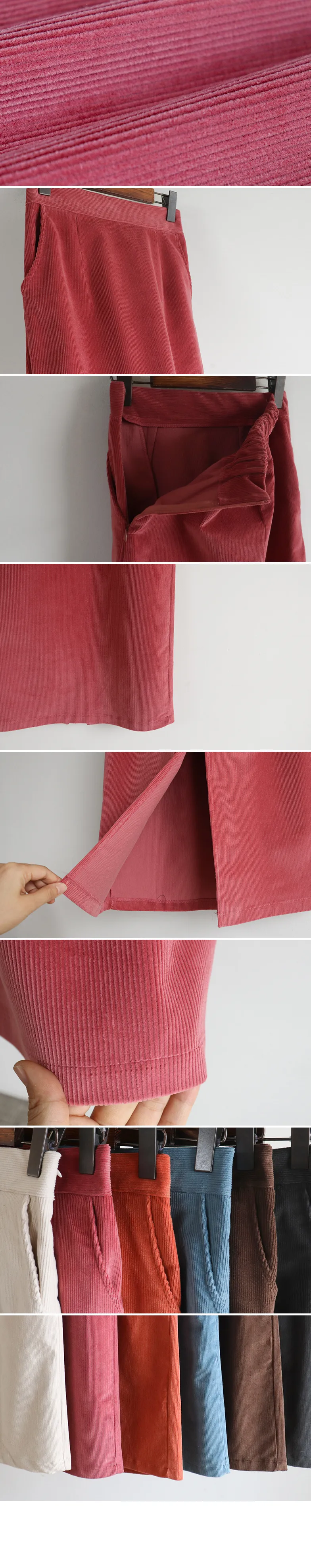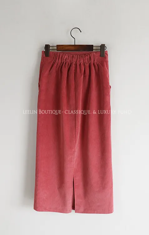 H剪裁後開衩腰部彈性燈芯絨中長裙