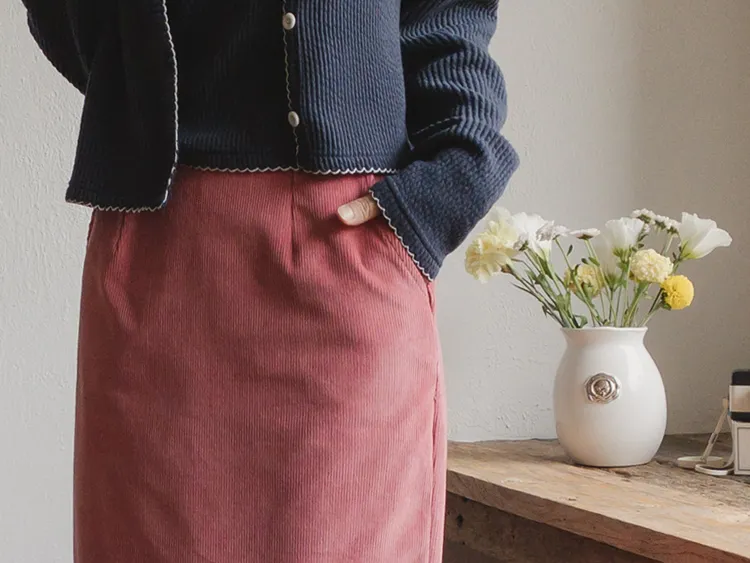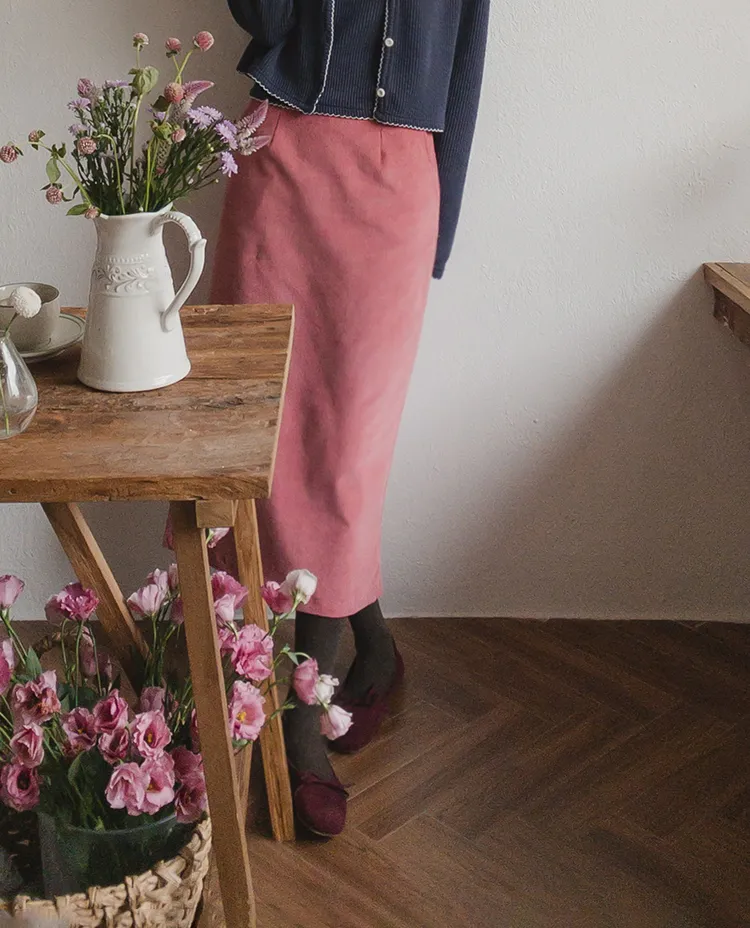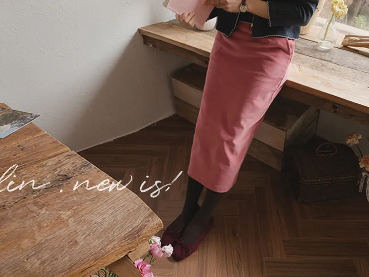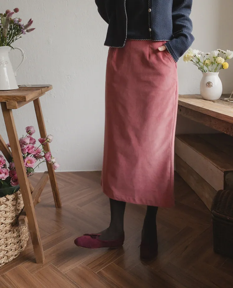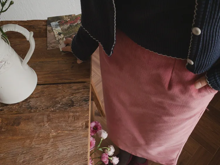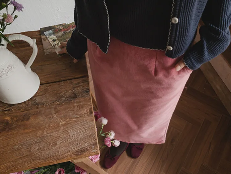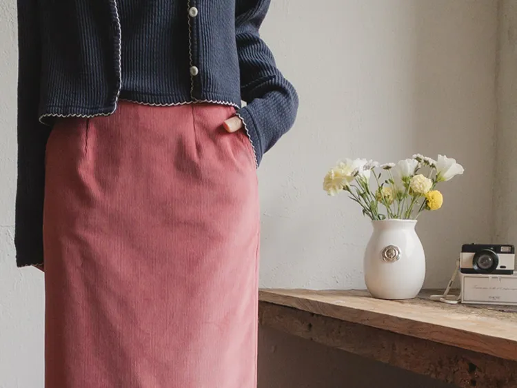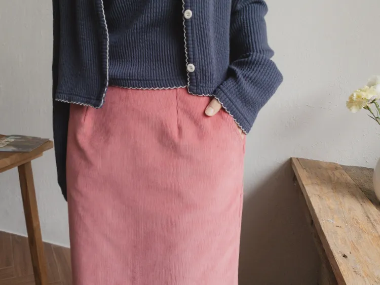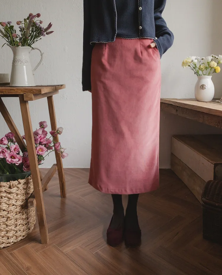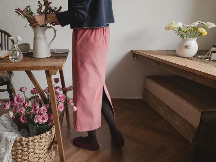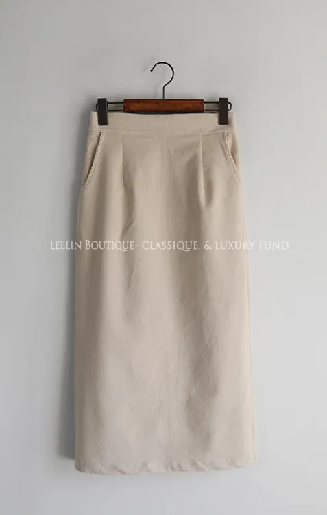 H剪裁後開衩腰部彈性燈芯絨中長裙