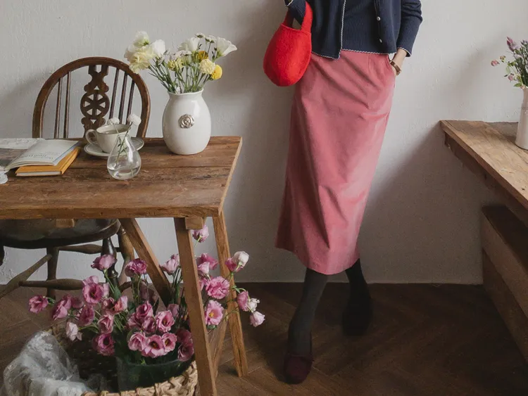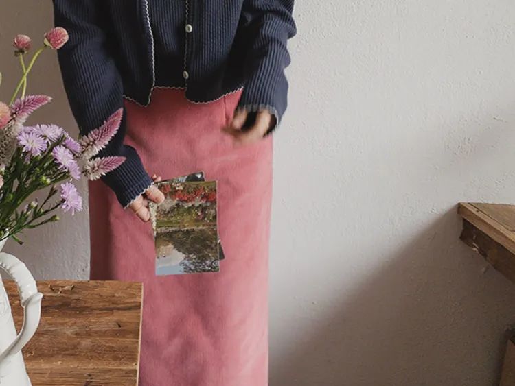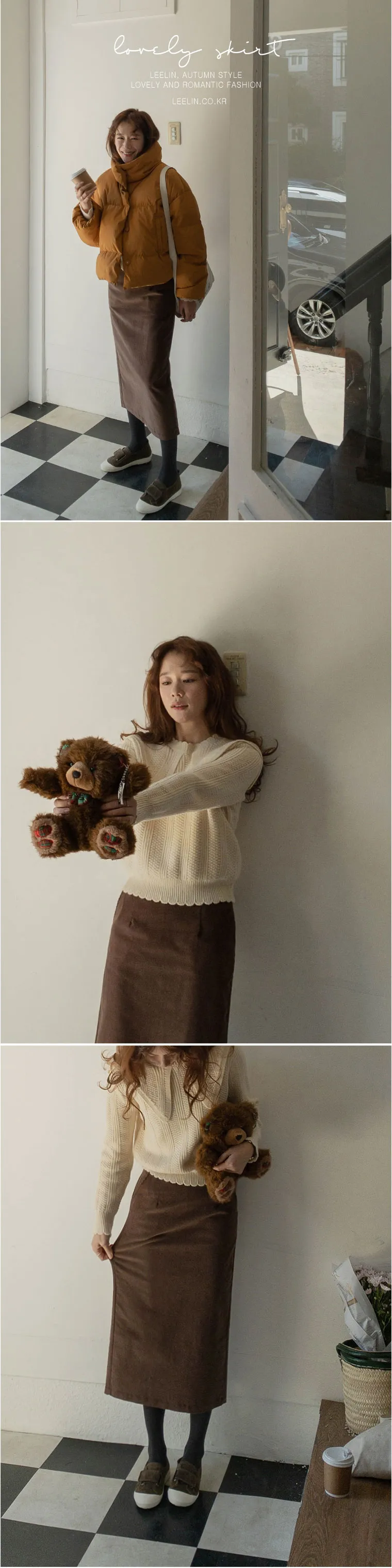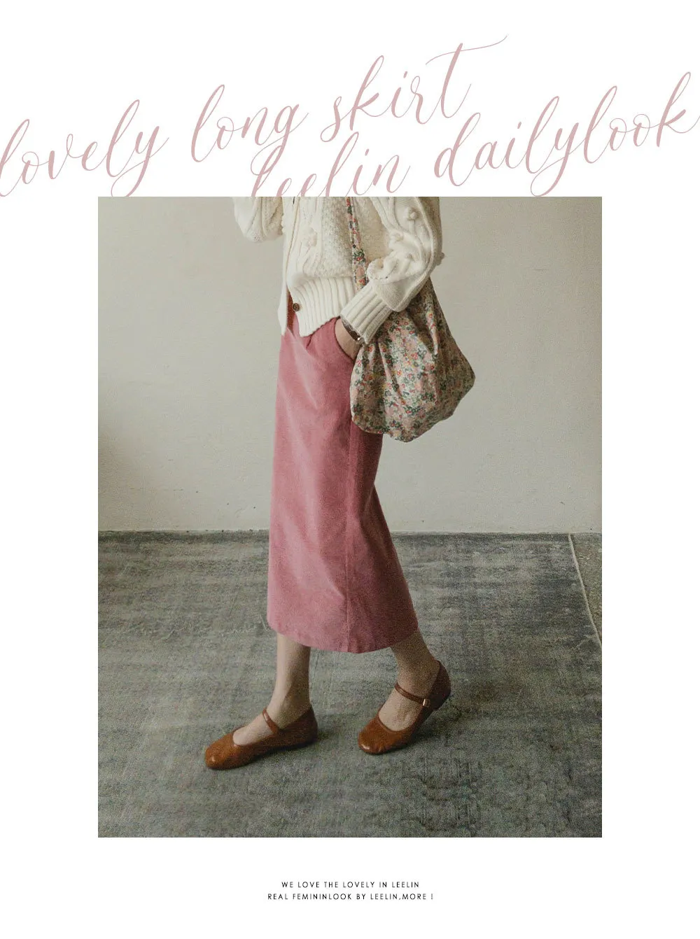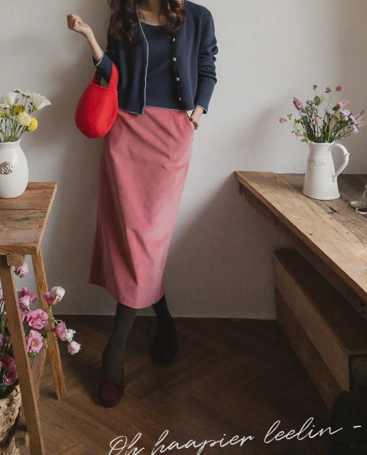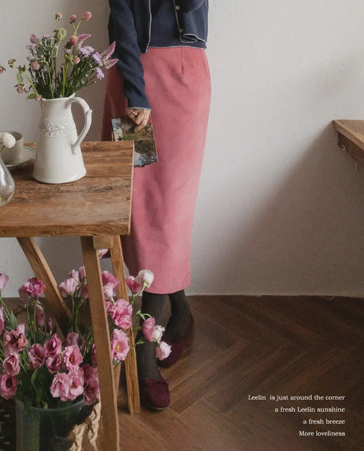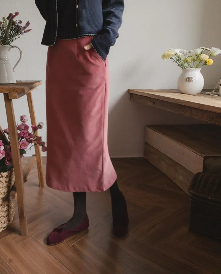 H剪裁後開衩腰部彈性燈芯絨中長裙