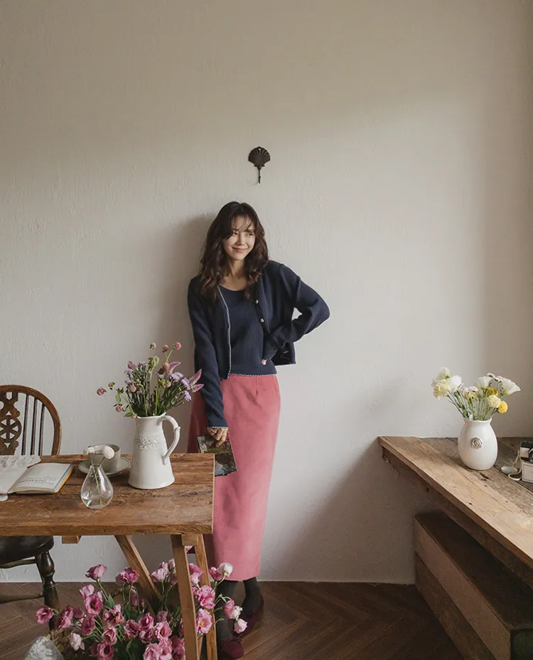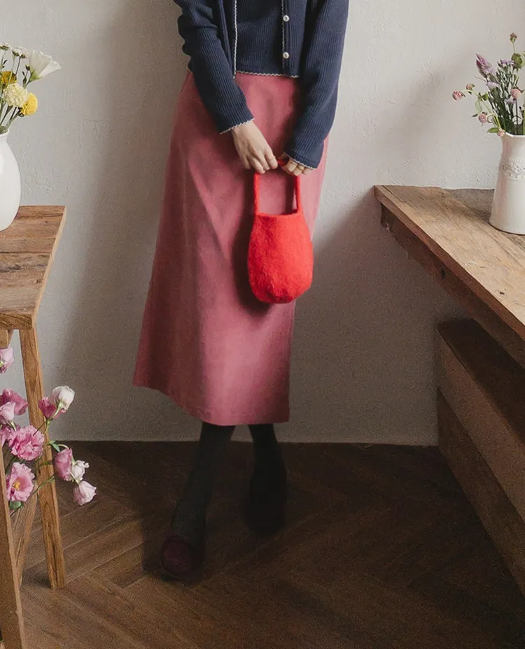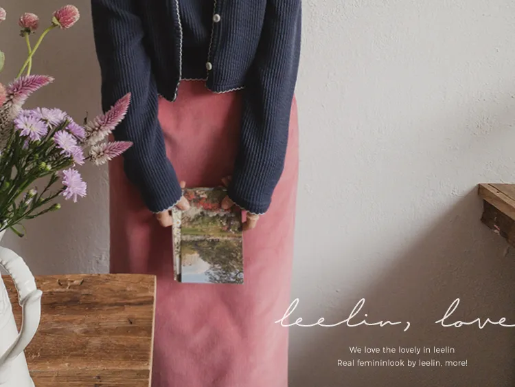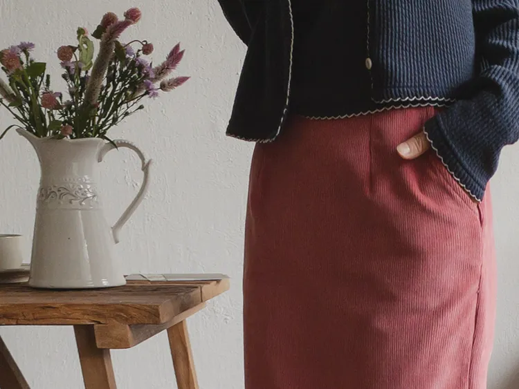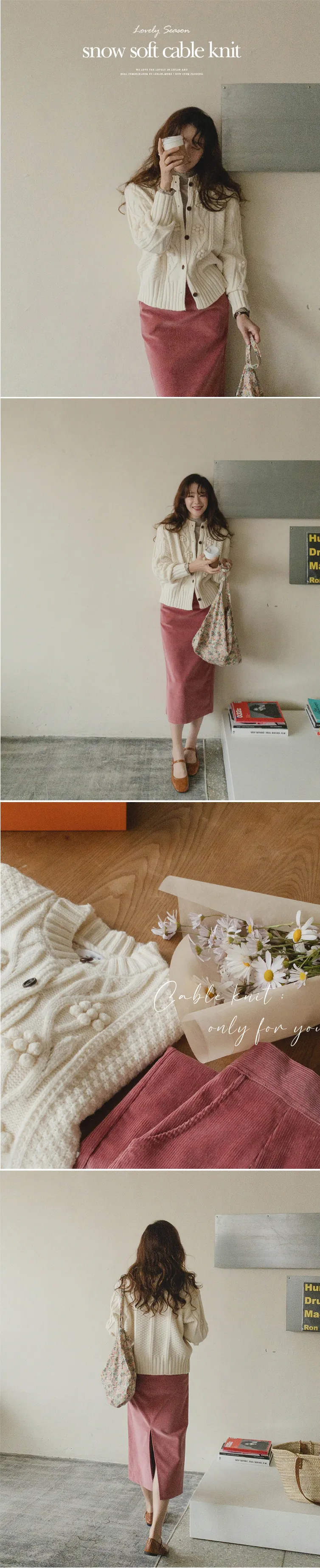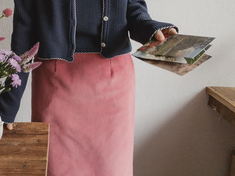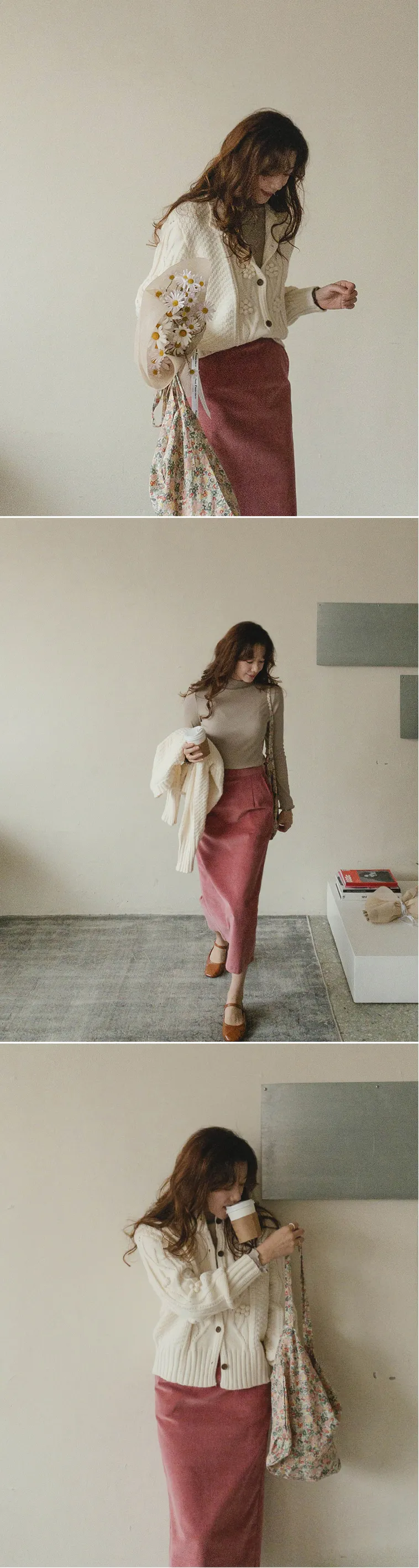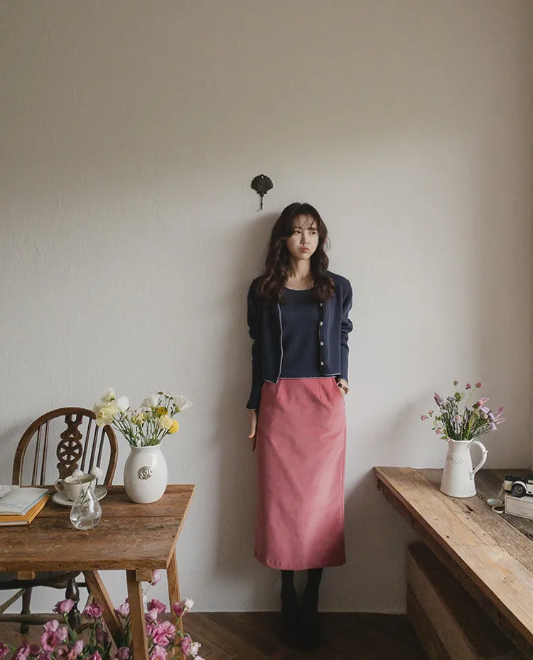 H剪裁後開衩腰部彈性燈芯絨中長裙