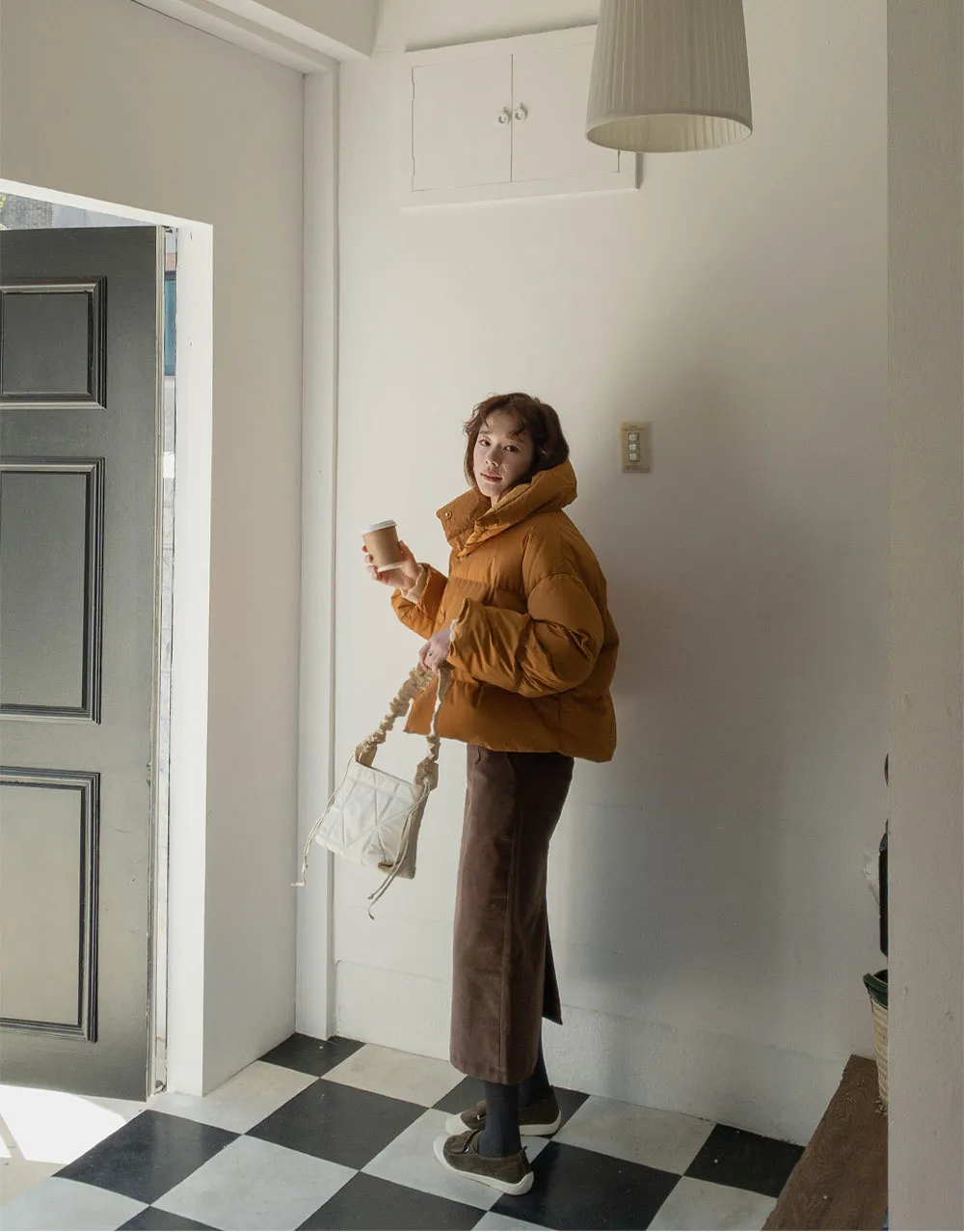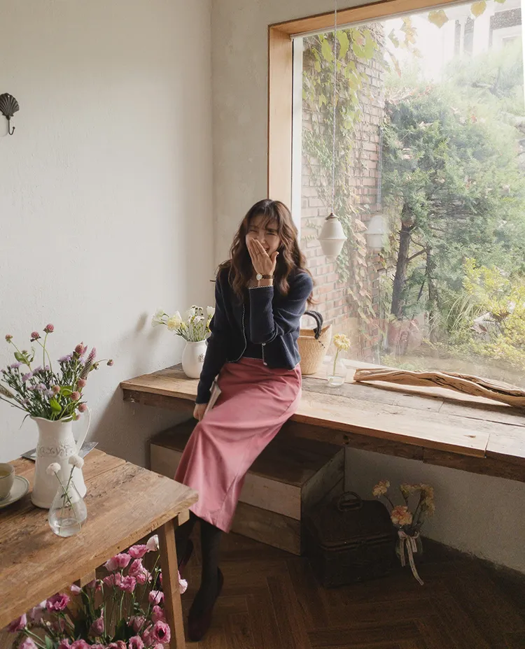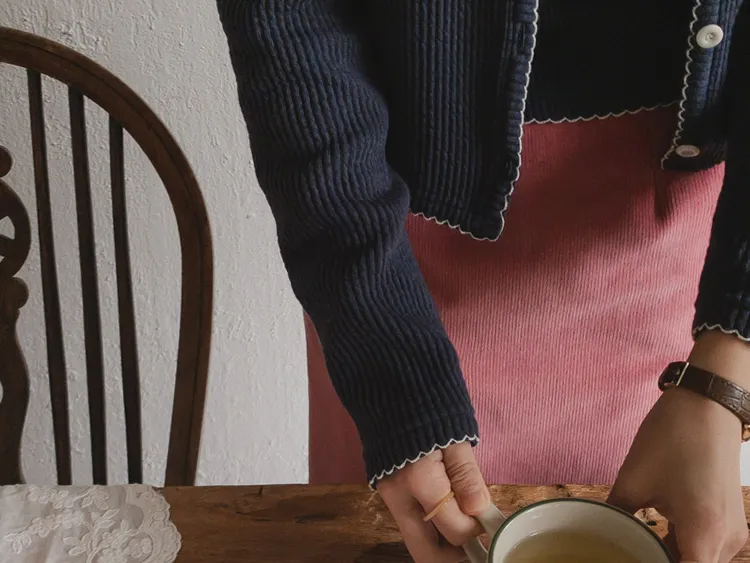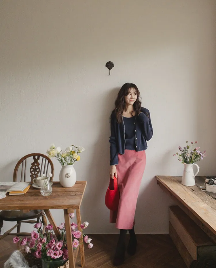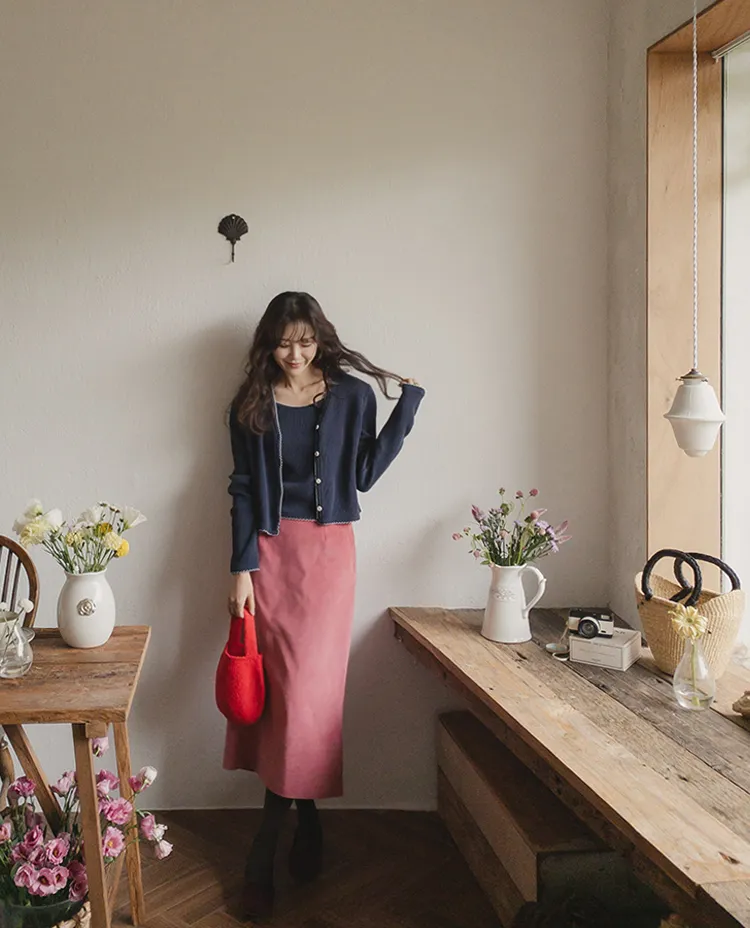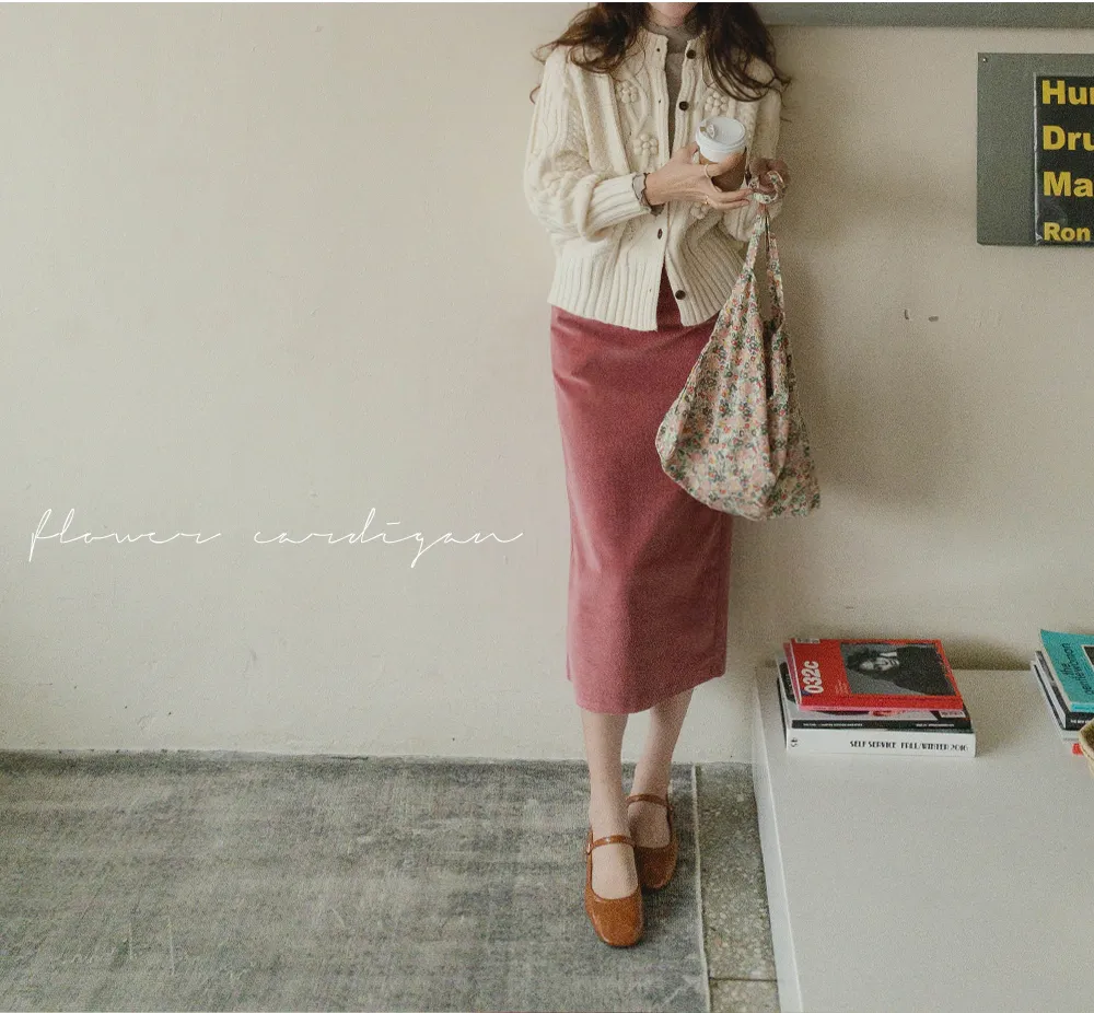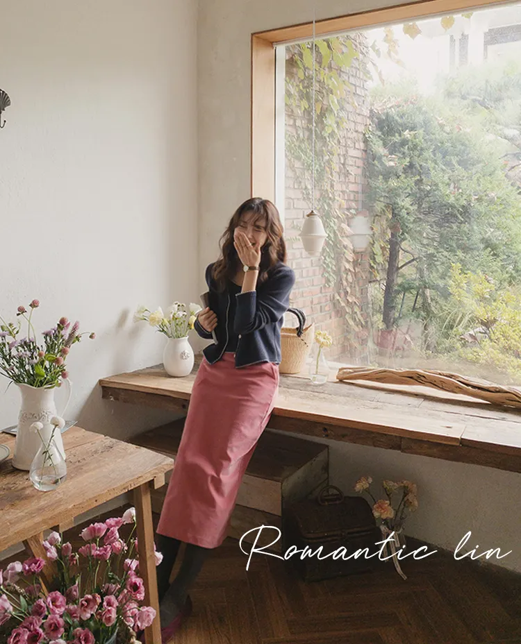 H剪裁後開衩腰部彈性燈芯絨中長裙
