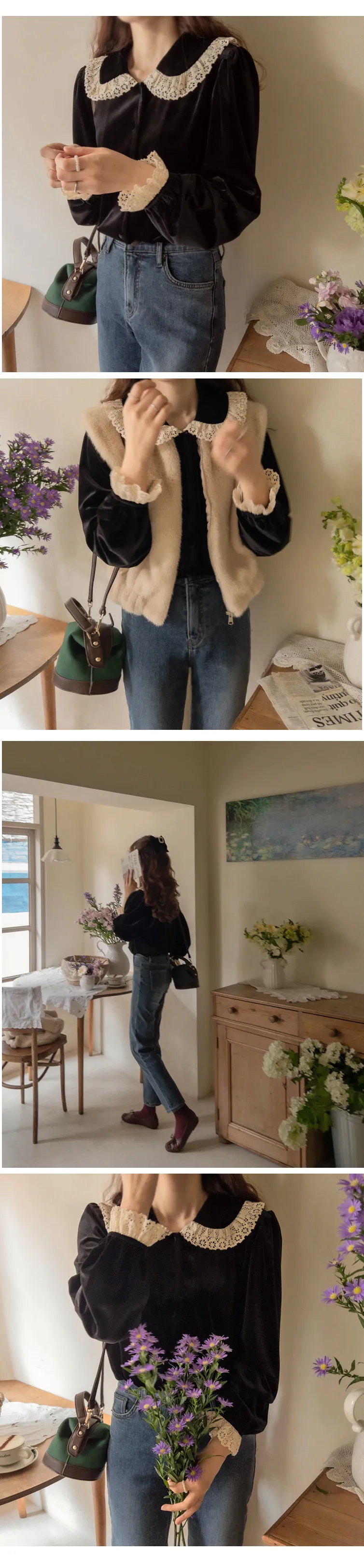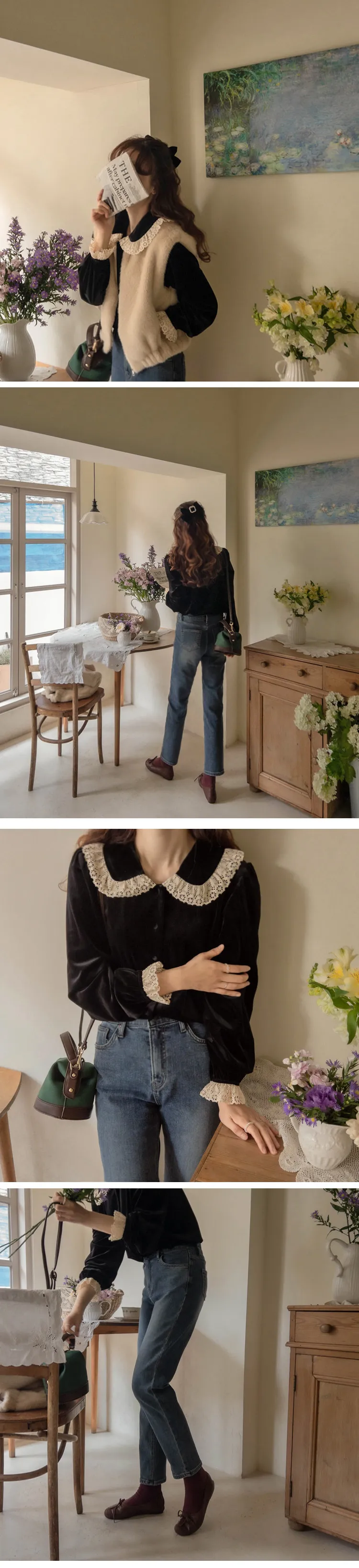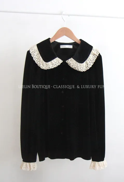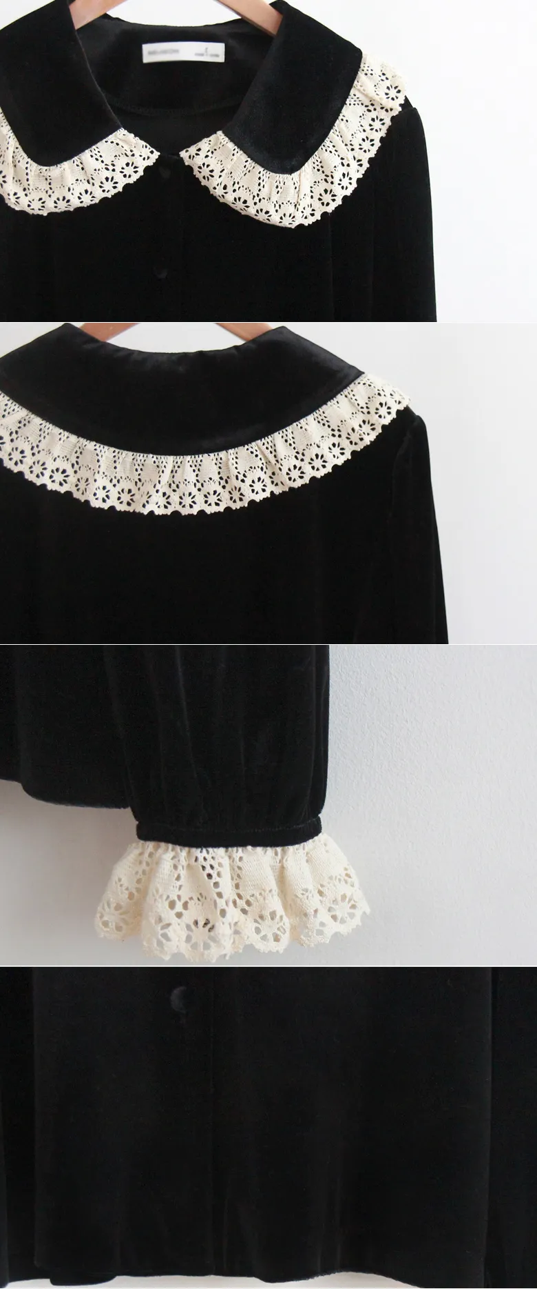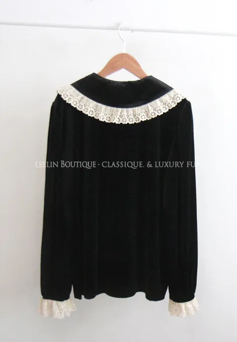 優雅蕾絲飾領邊袖天鵝絨排扣上衣