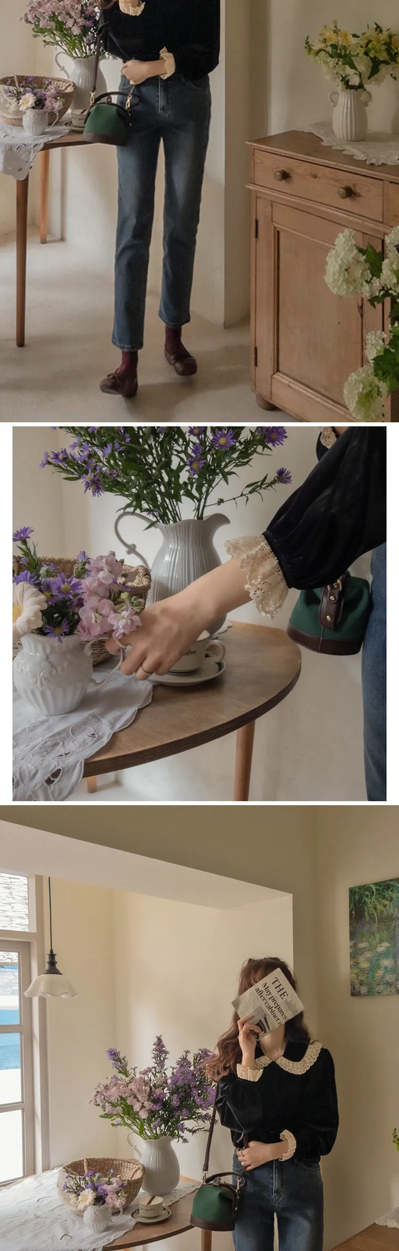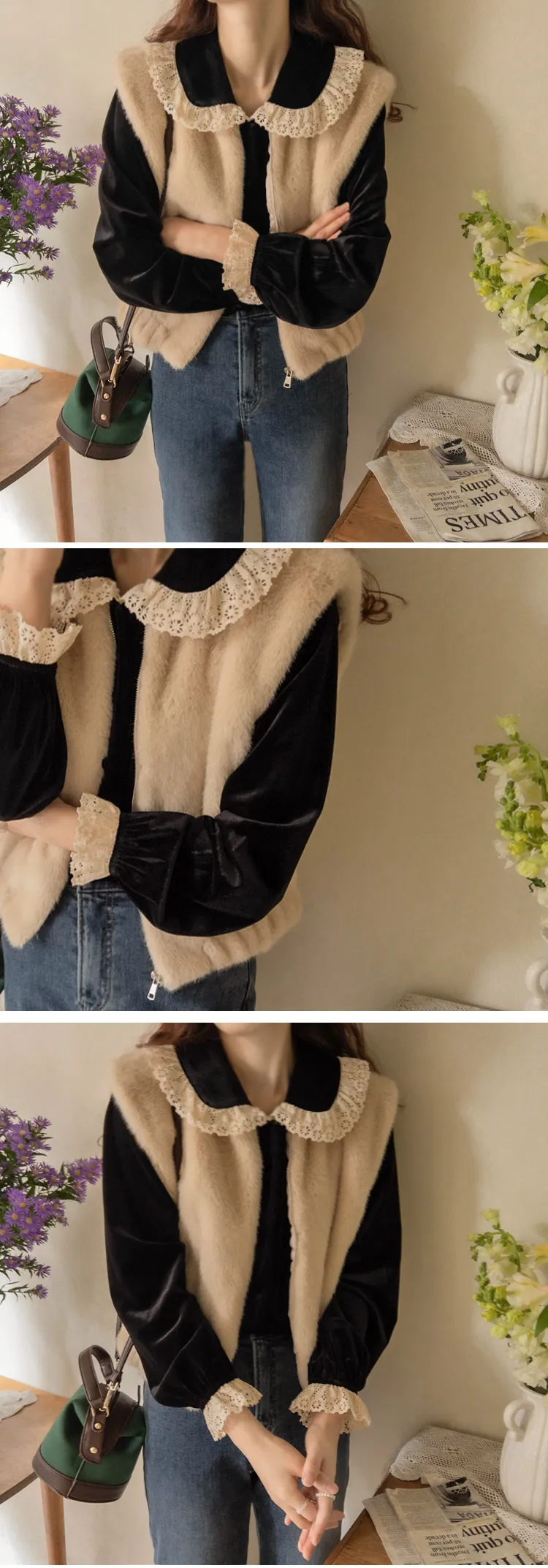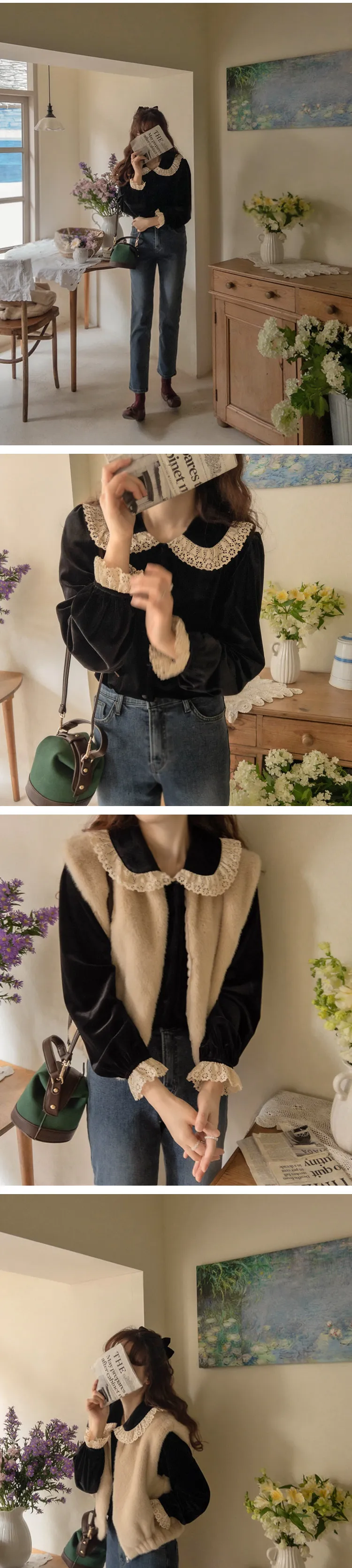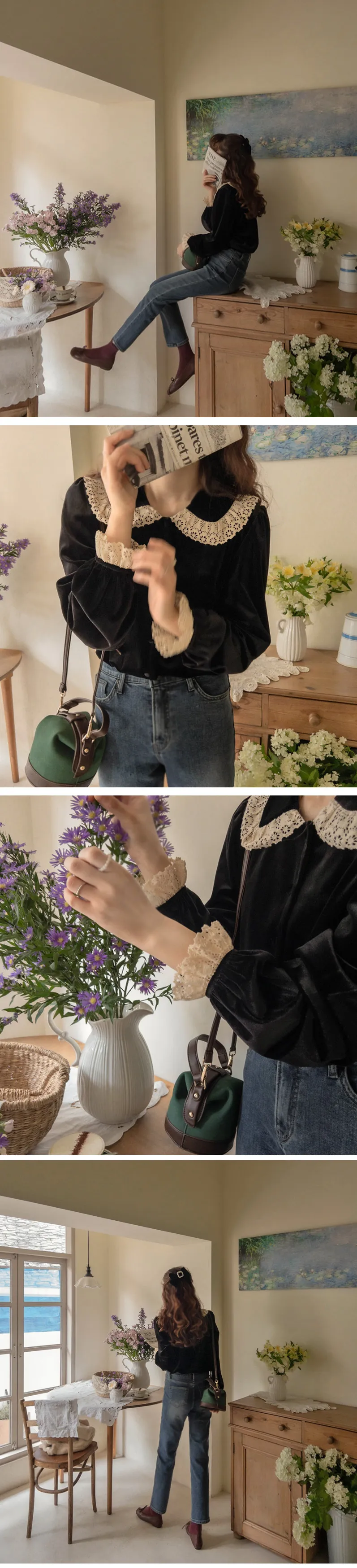 優雅蕾絲飾領邊袖天鵝絨排扣上衣