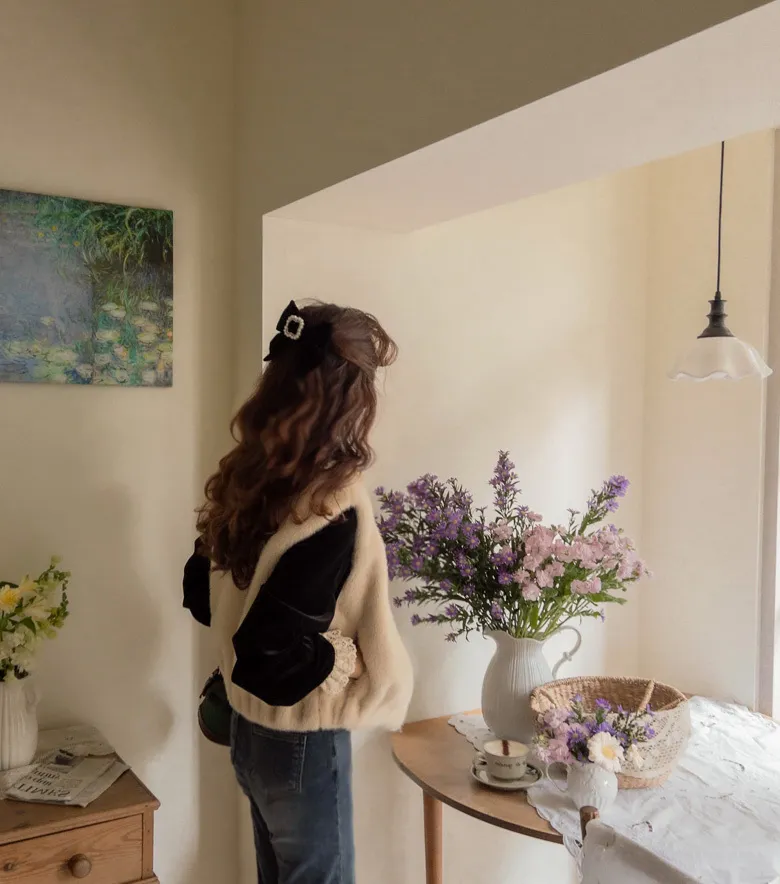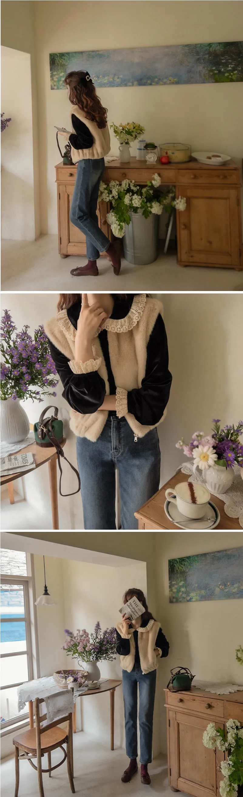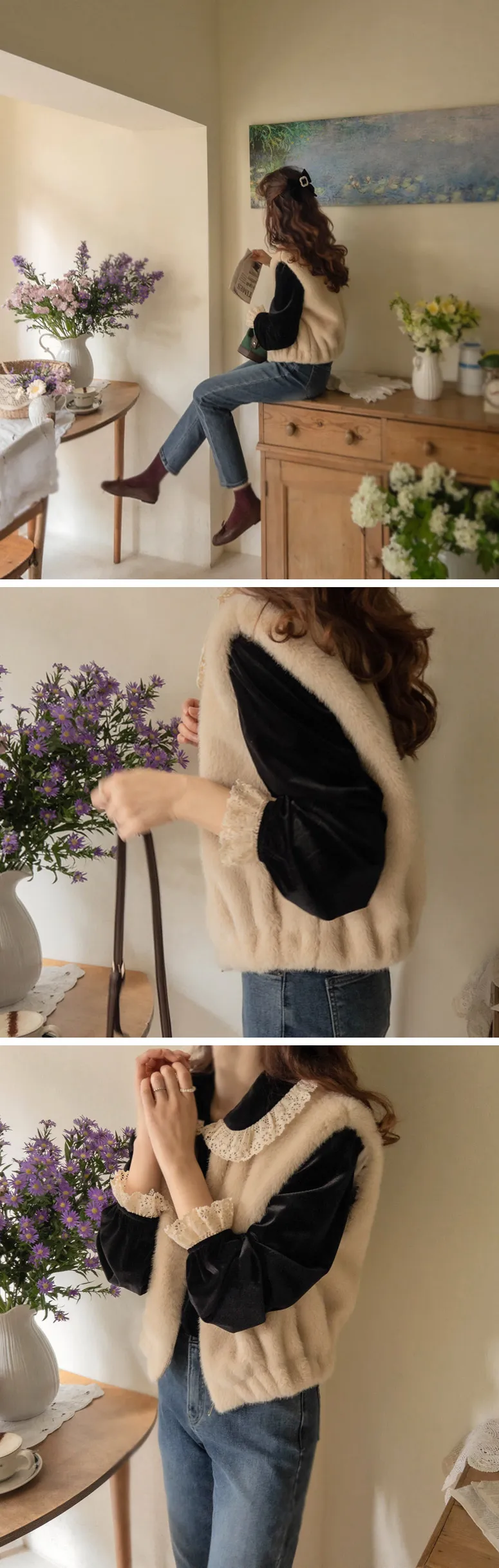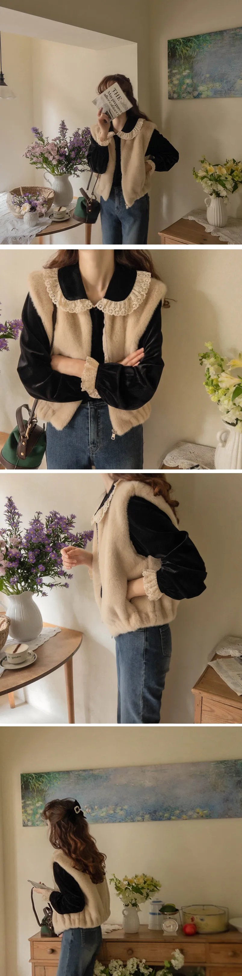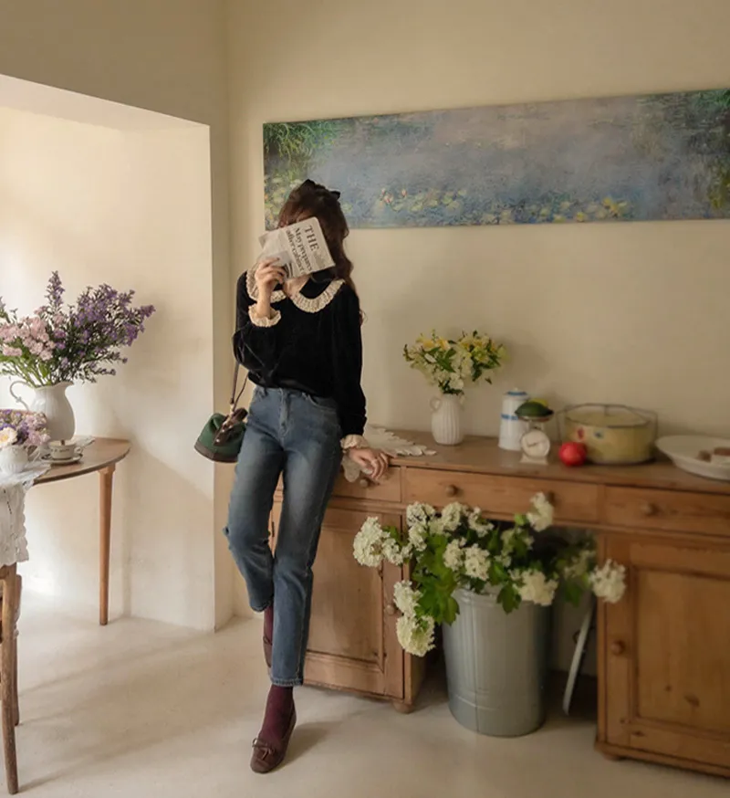 優雅蕾絲飾領邊袖天鵝絨排扣上衣