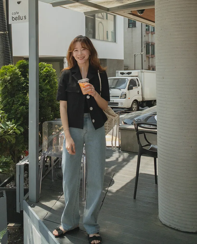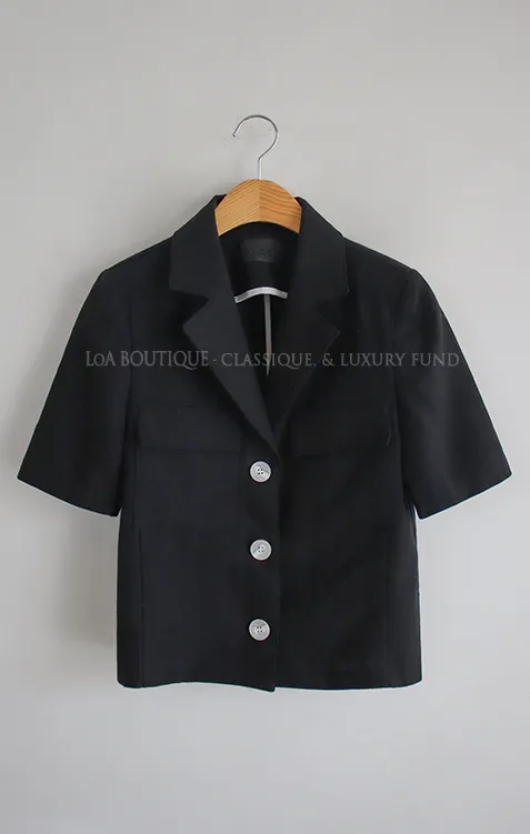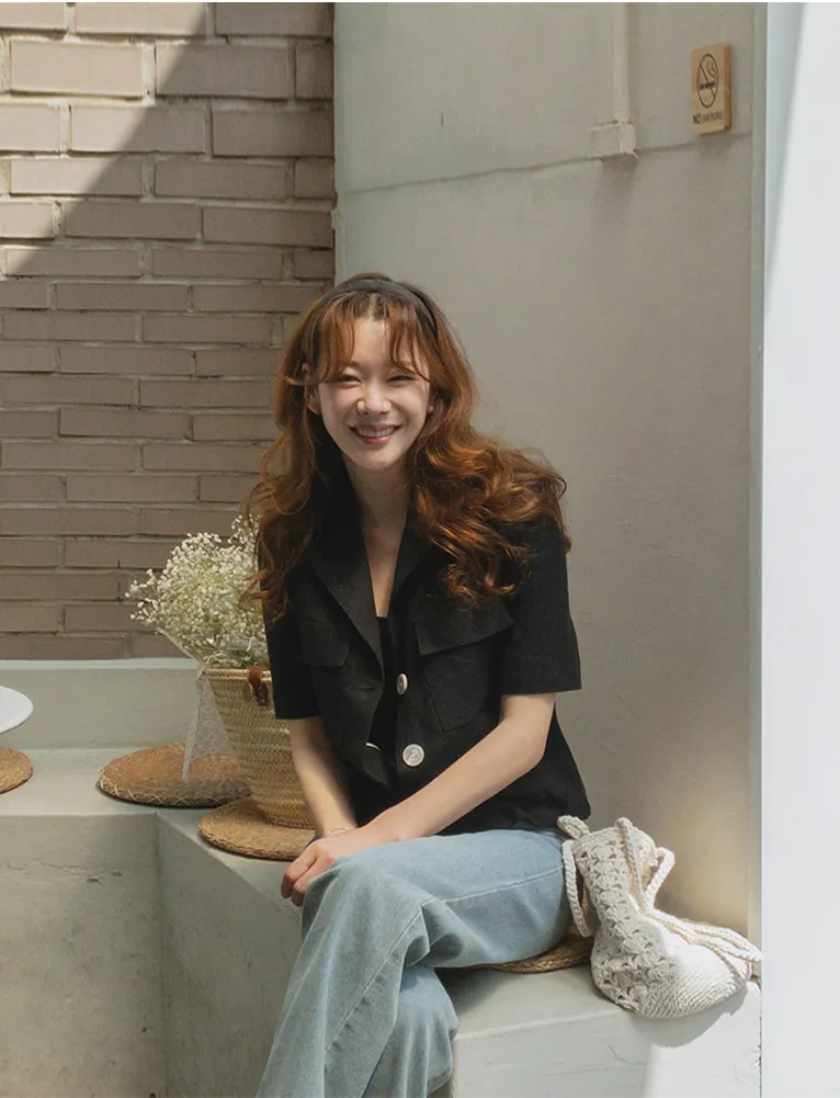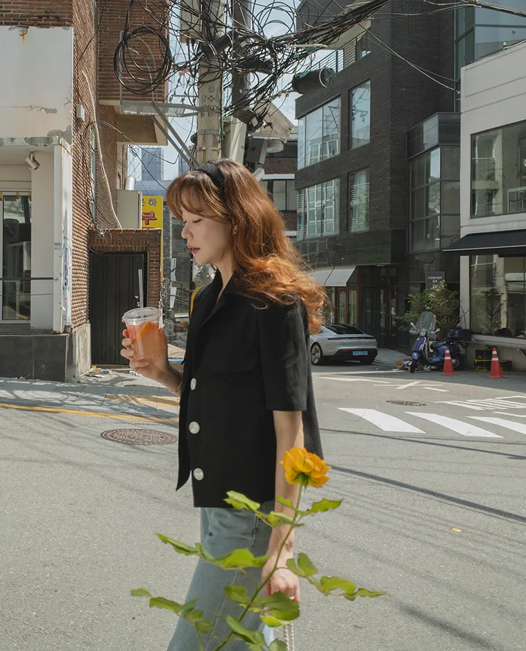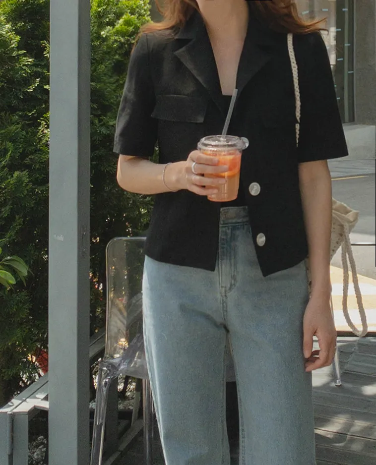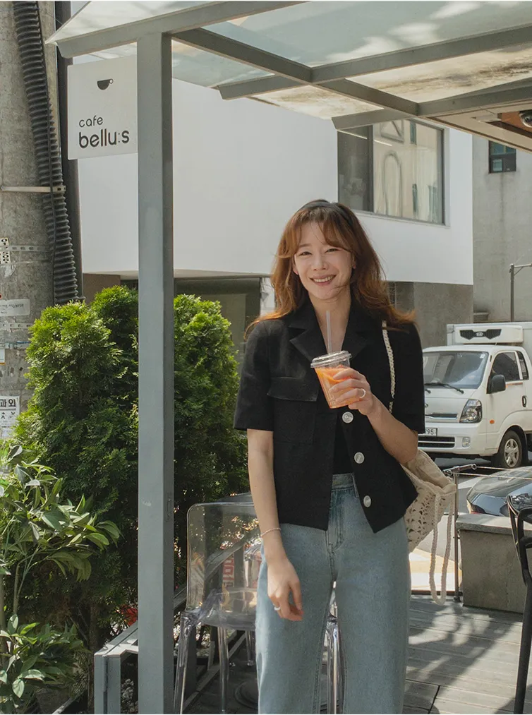 【兩個口袋和短袖領子,以大鈕扣為點的外套♡】【含有25%的涼爽材質亞麻】【齊肩,薄墊肩】【時尚半短款】【適合日常造型的萬能單品】 & 正式造型& 婚禮嘉賓造型]