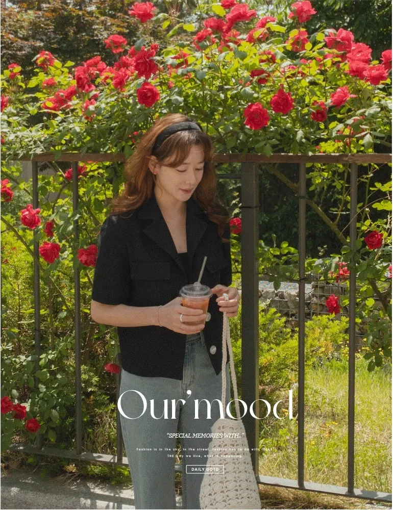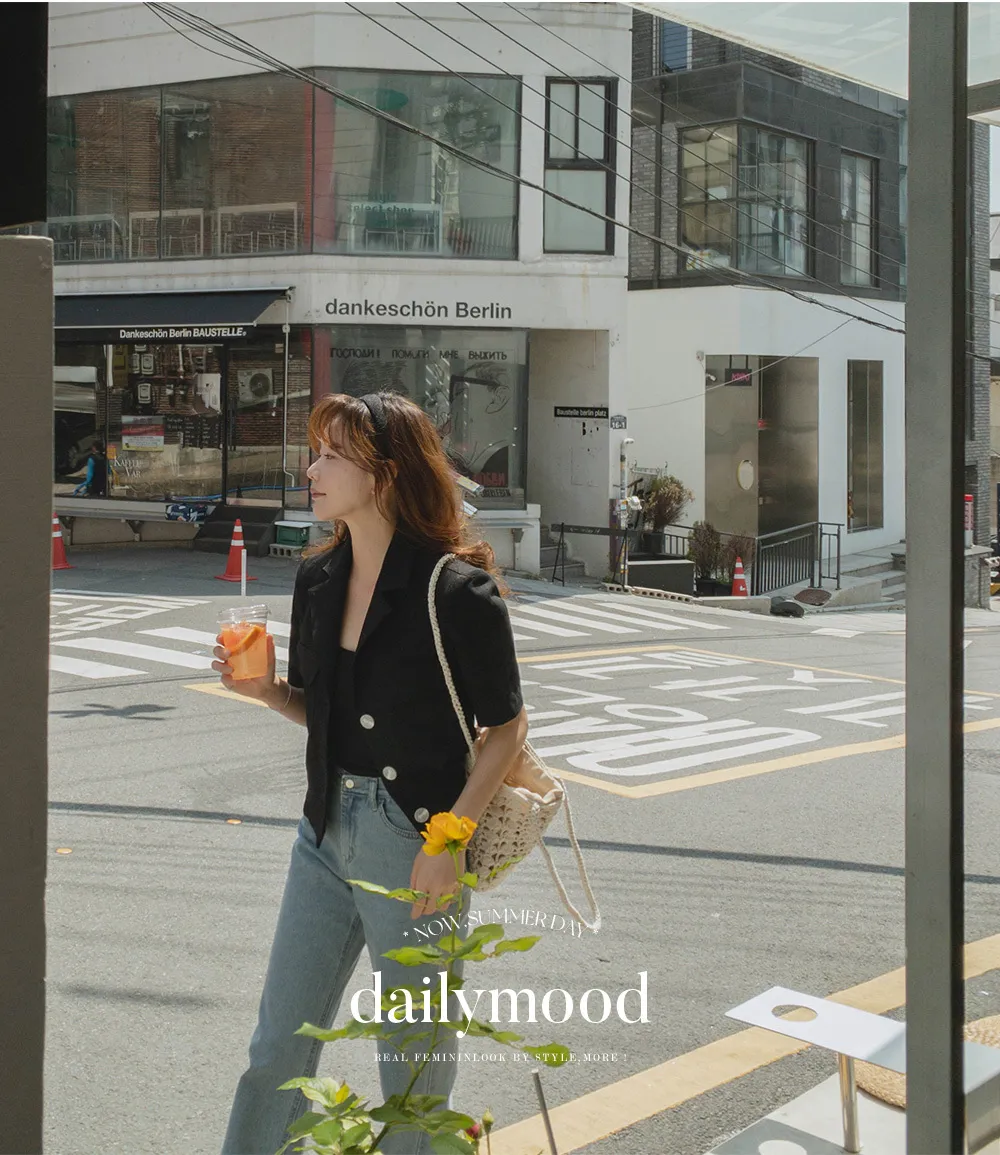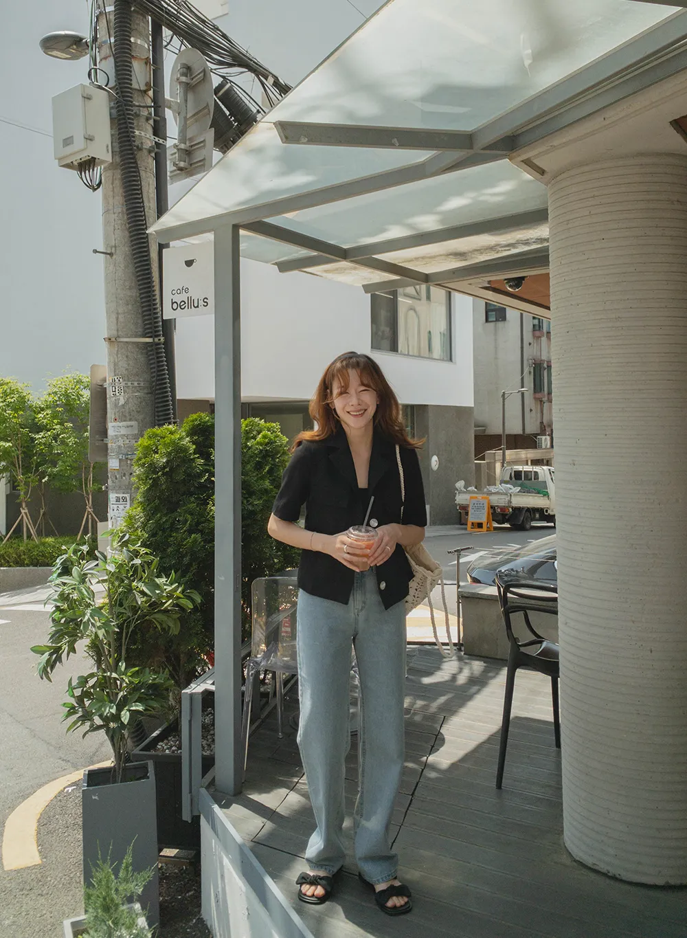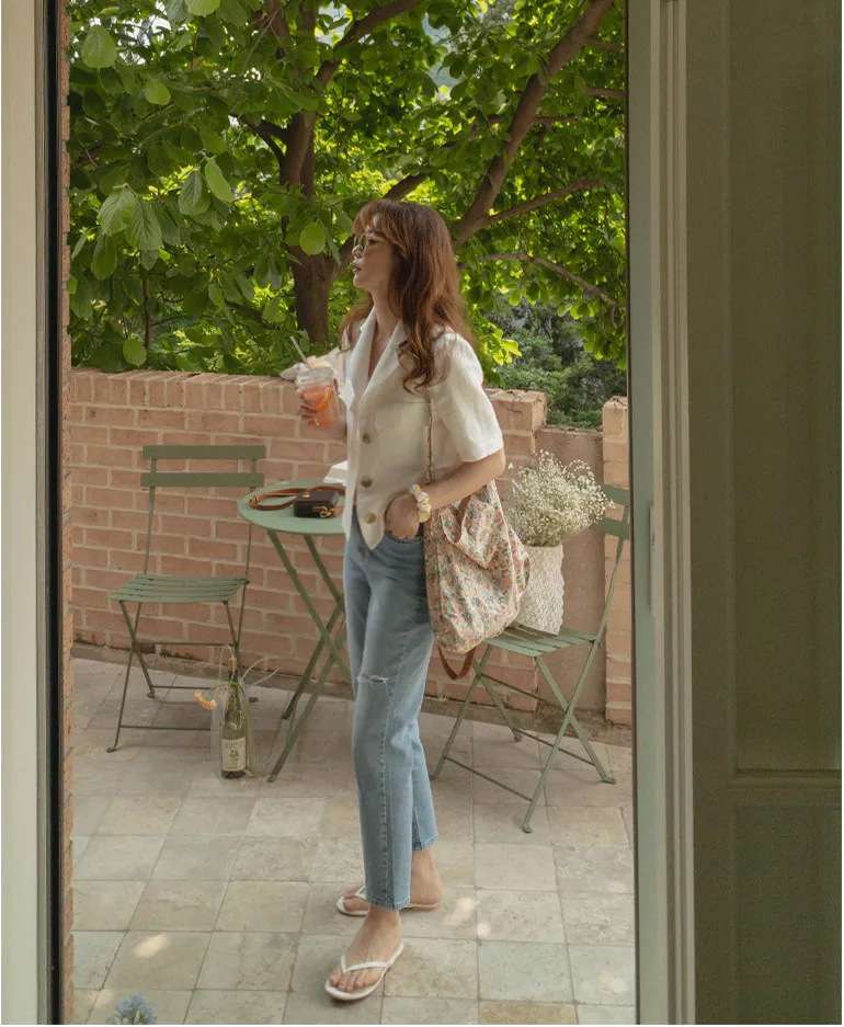 【兩個口袋和短袖領子,以大鈕扣為點的外套♡】【含有25%的涼爽材質亞麻】【齊肩,薄墊肩】【時尚半短款】【適合日常造型的萬能單品】 & 正式造型& 婚禮嘉賓造型]