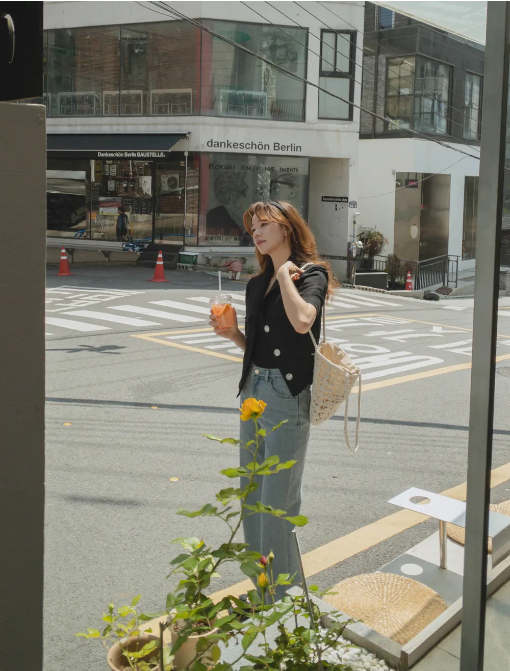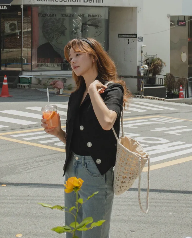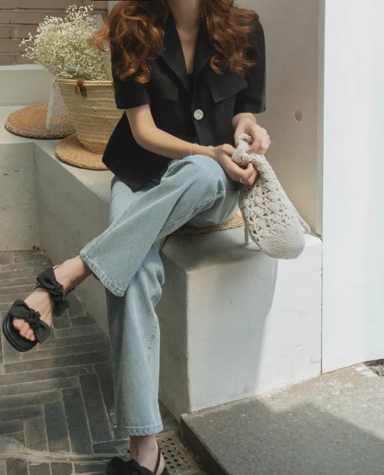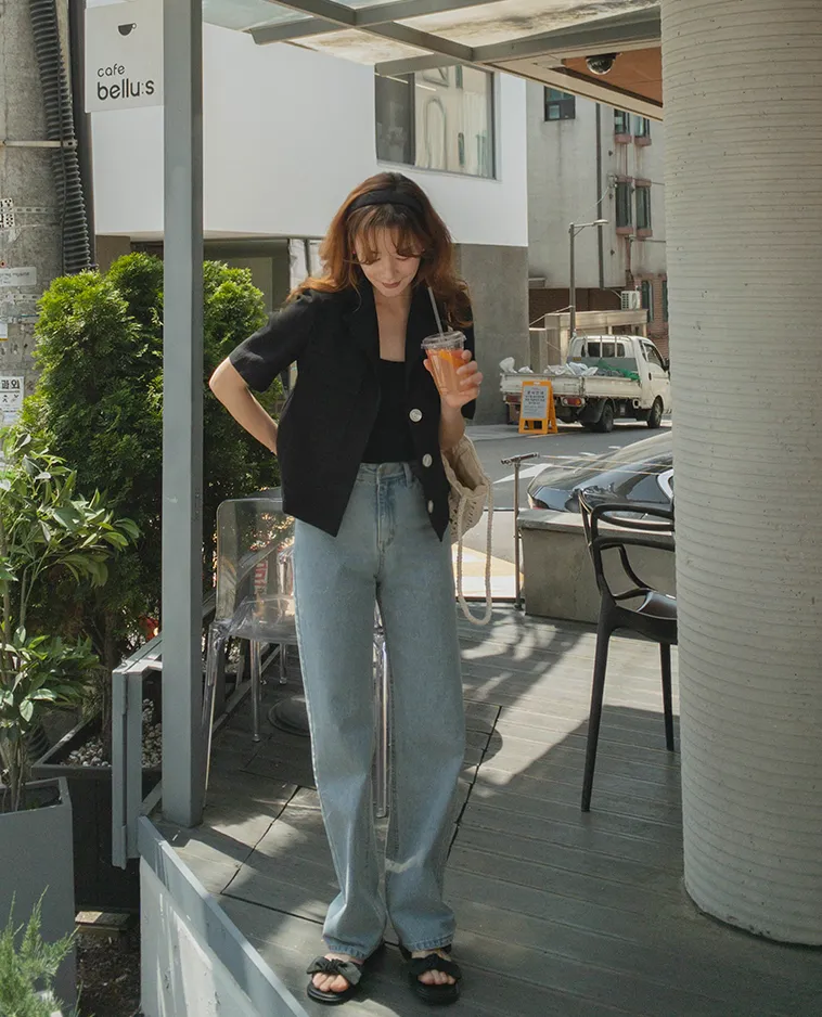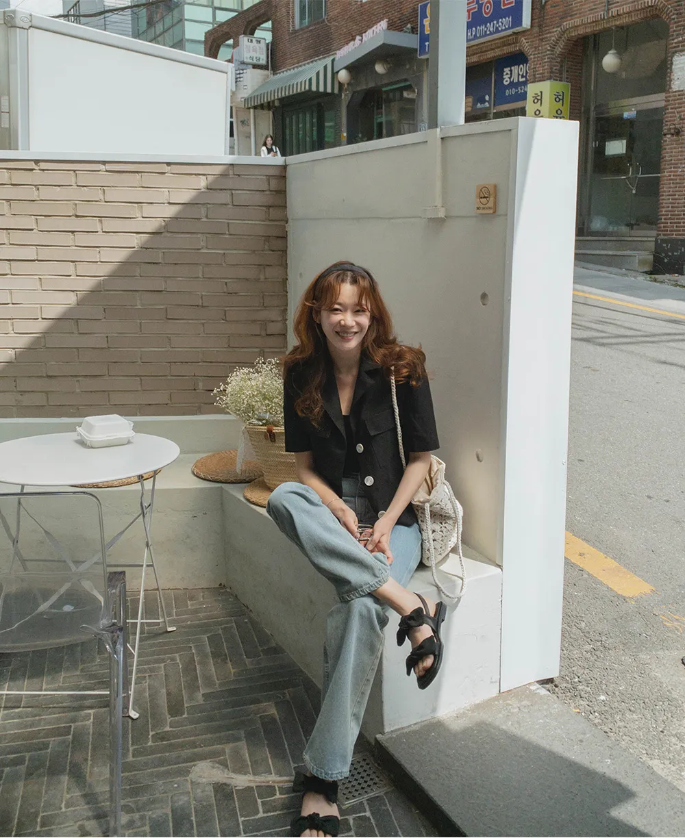 【兩個口袋和短袖領子,以大鈕扣為點的外套♡】【含有25%的涼爽材質亞麻】【齊肩,薄墊肩】【時尚半短款】【適合日常造型的萬能單品】 & 正式造型& 婚禮嘉賓造型]