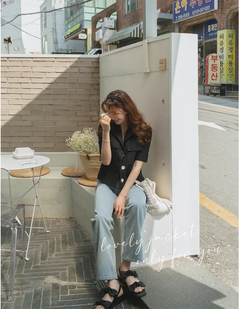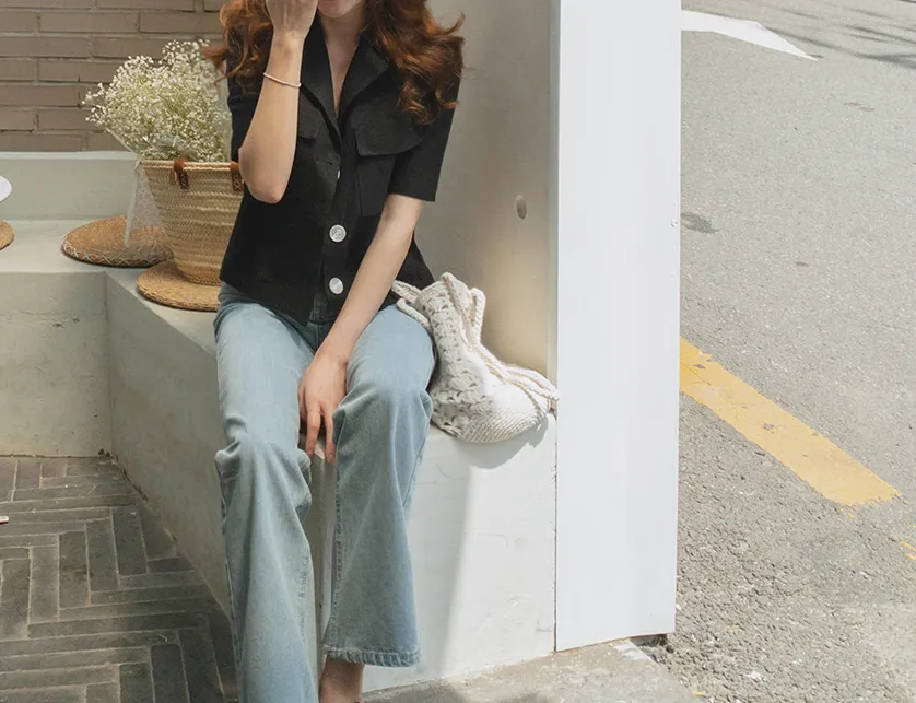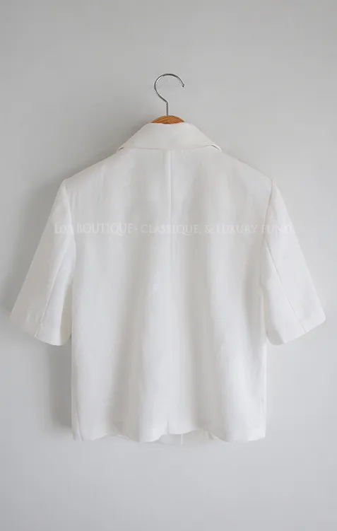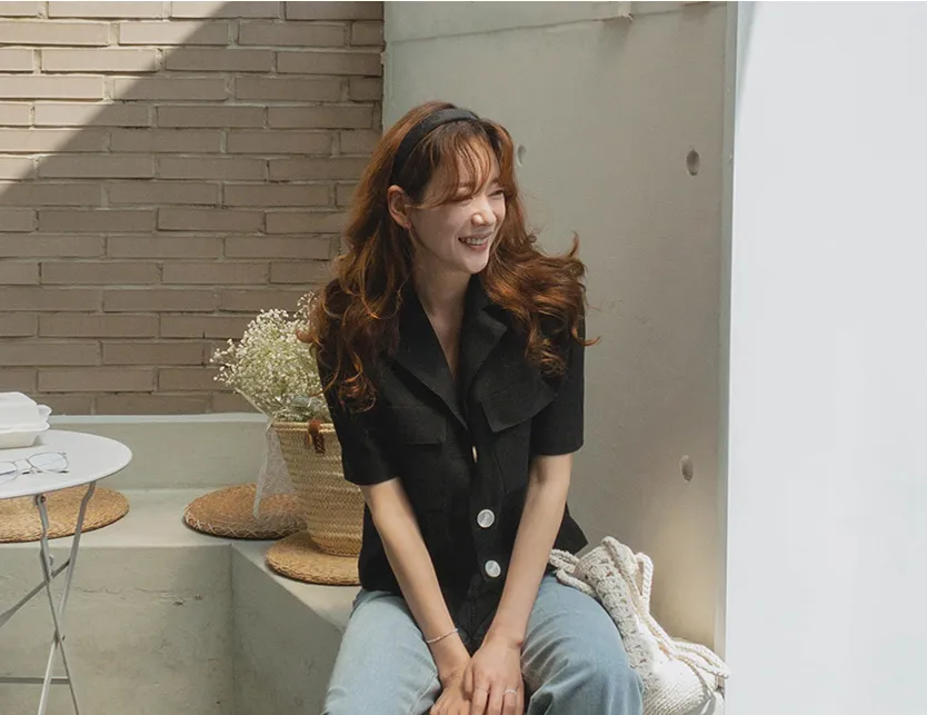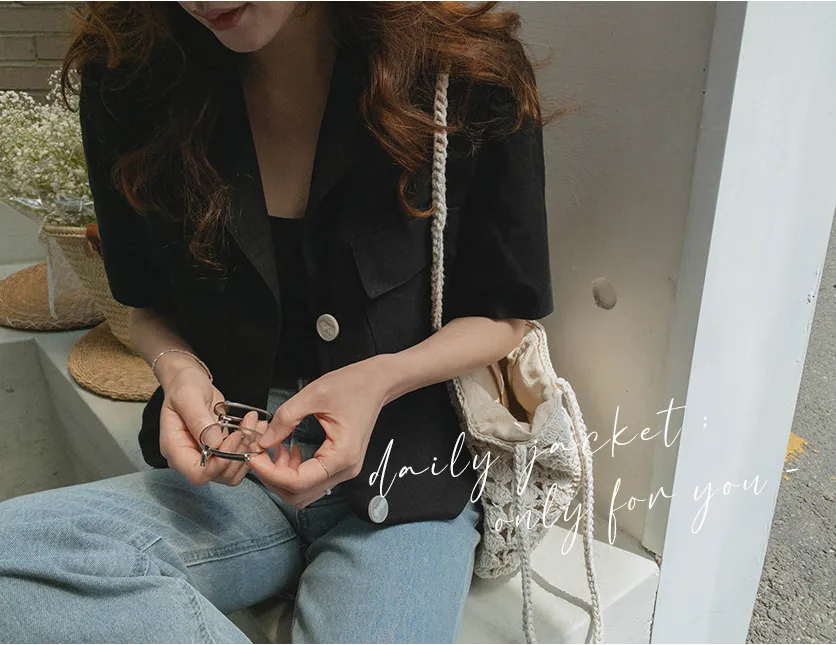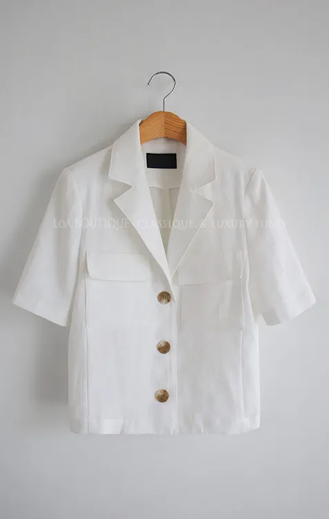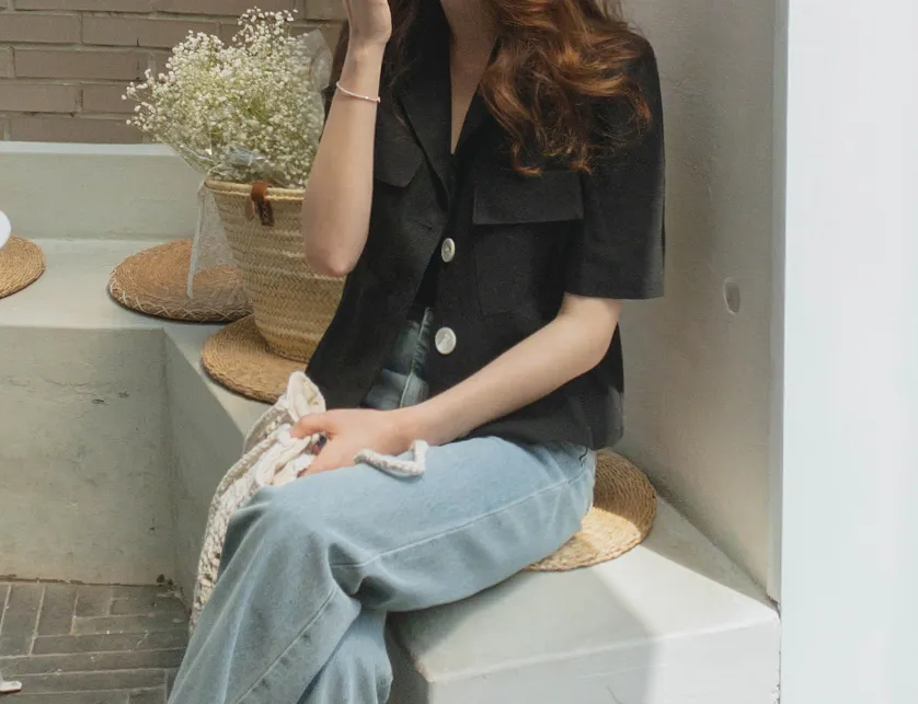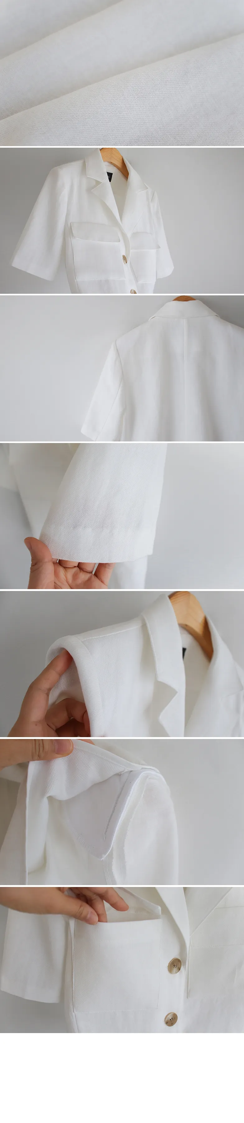 可愛率性大鈕扣設計口袋短袖亞麻外套