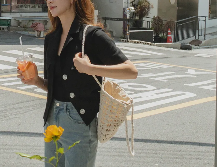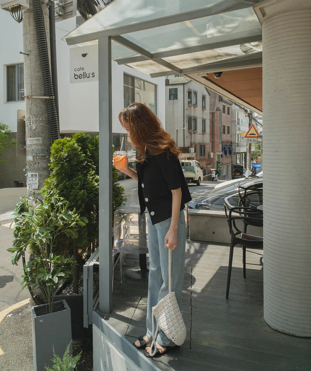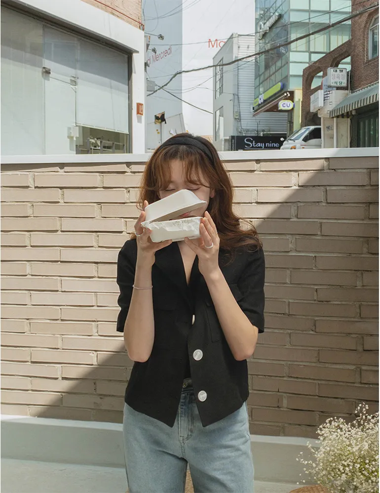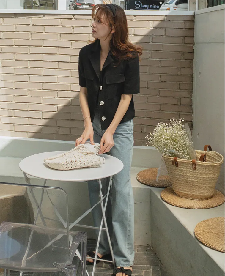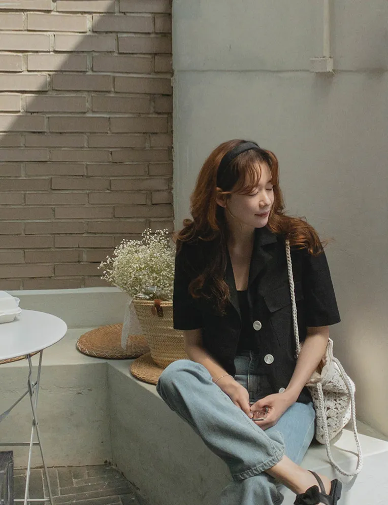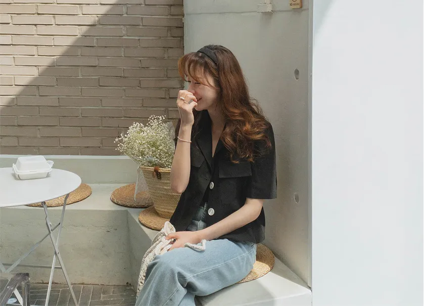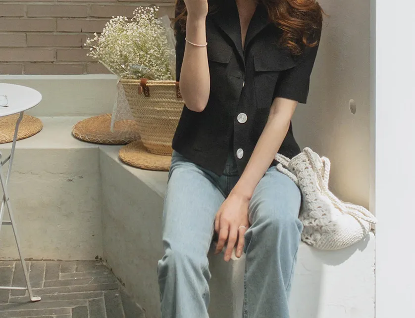 可愛率性大鈕扣設計口袋短袖亞麻外套