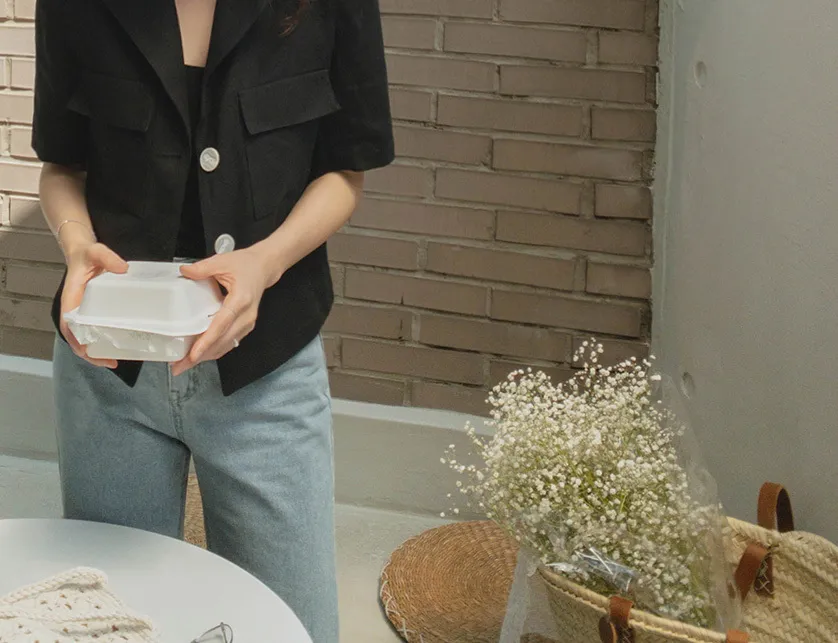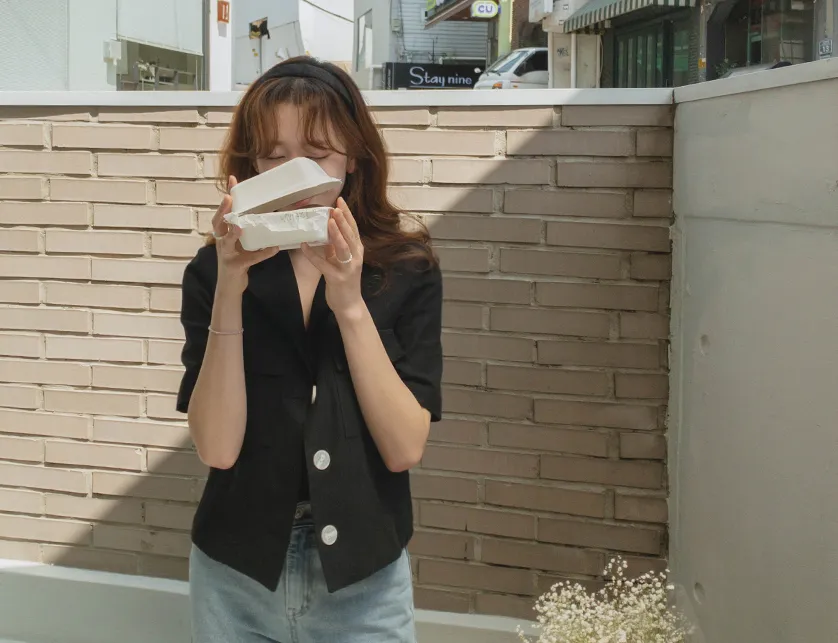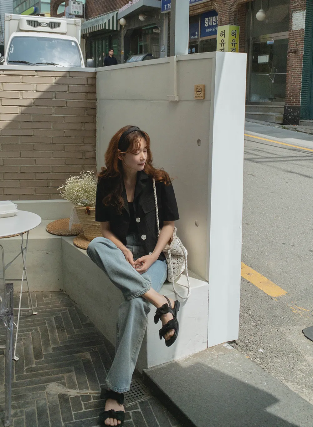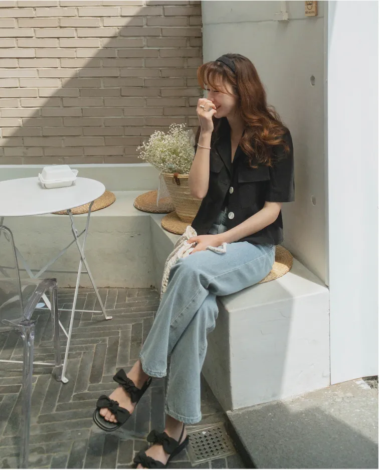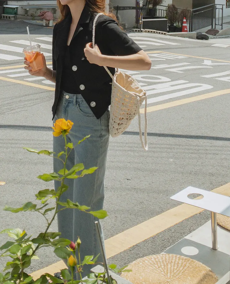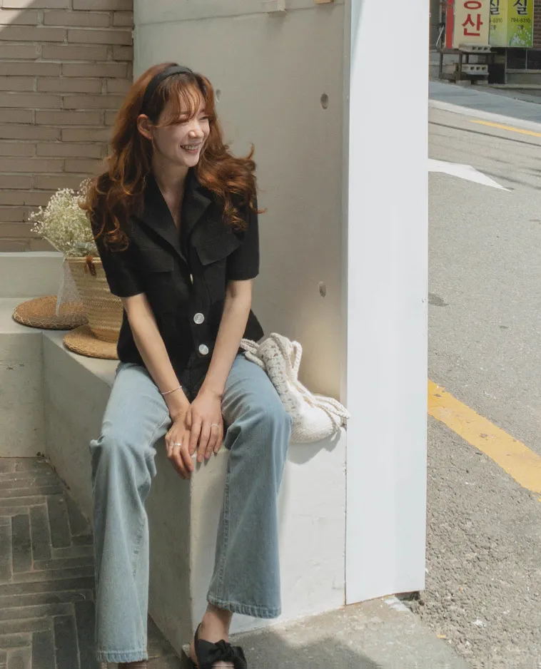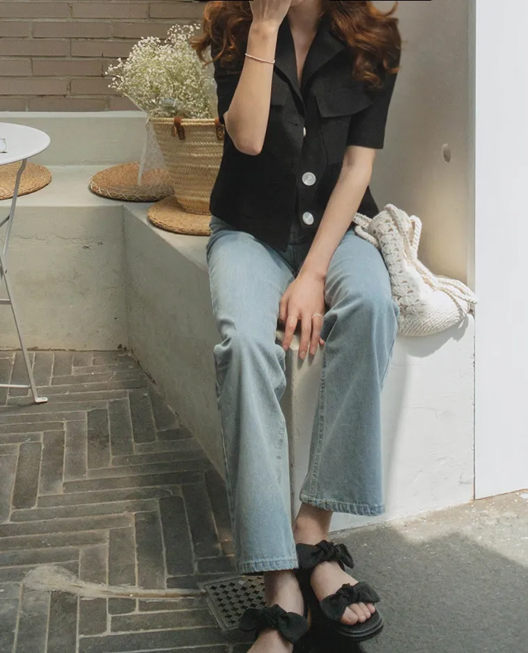 可愛率性大鈕扣設計口袋短袖亞麻外套