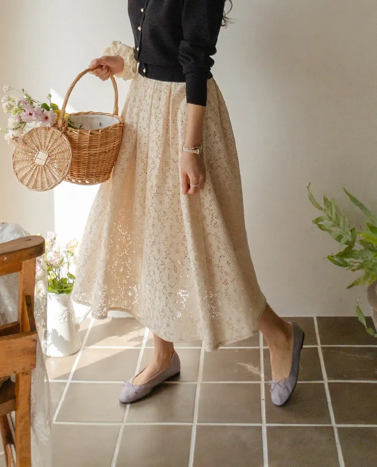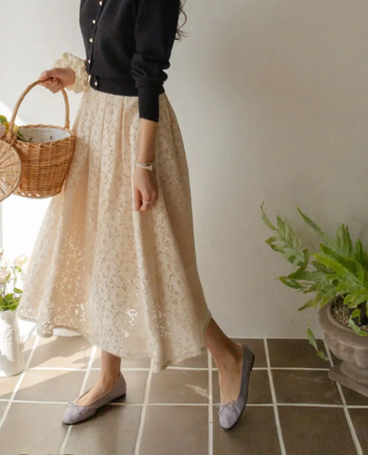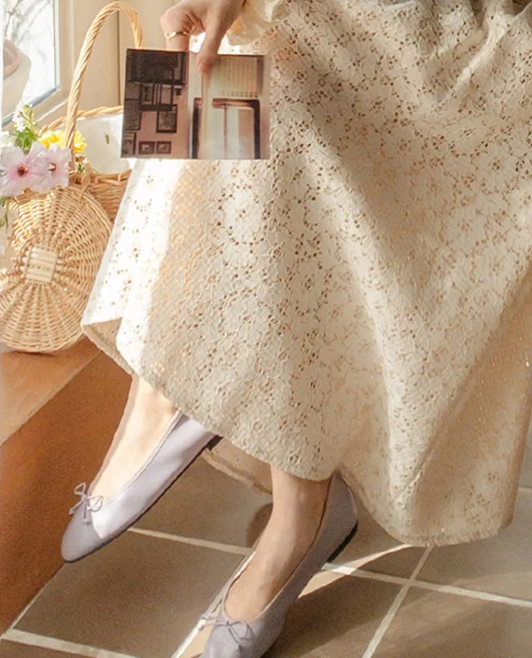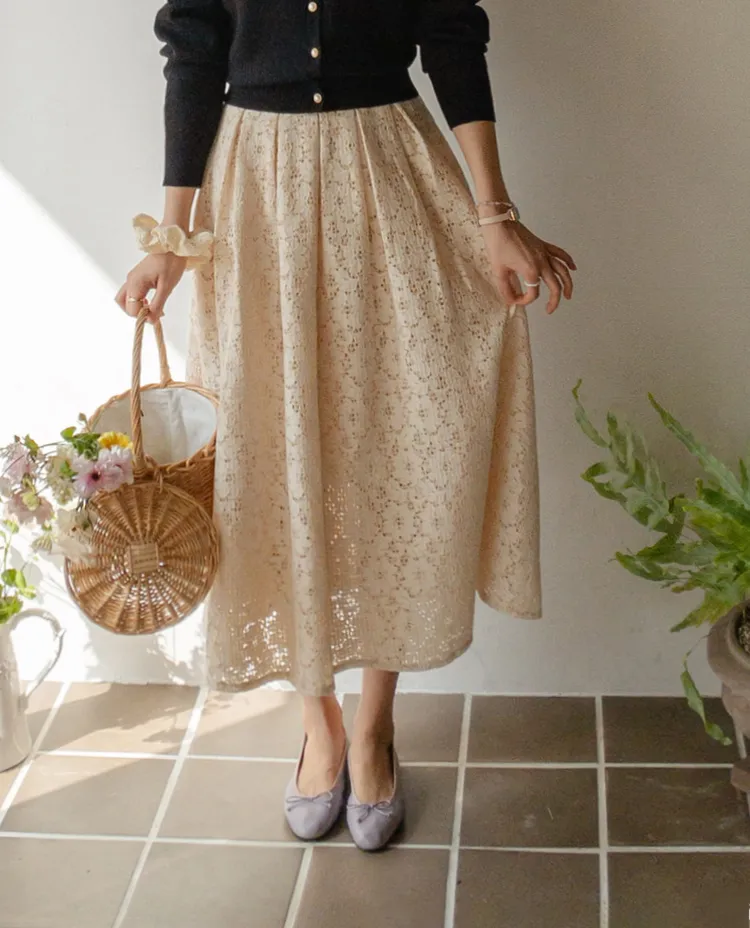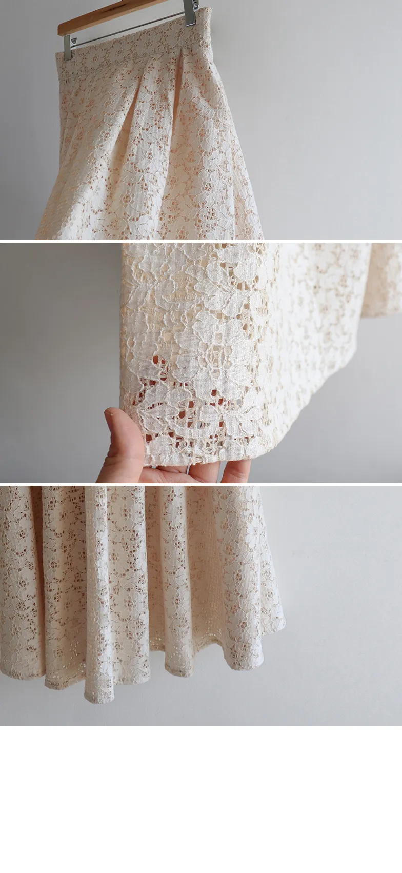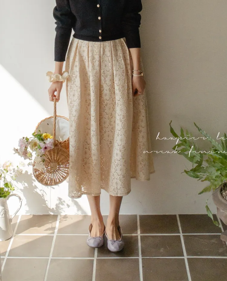 浪漫蕾絲花朵腰線針褶傘擺中長裙