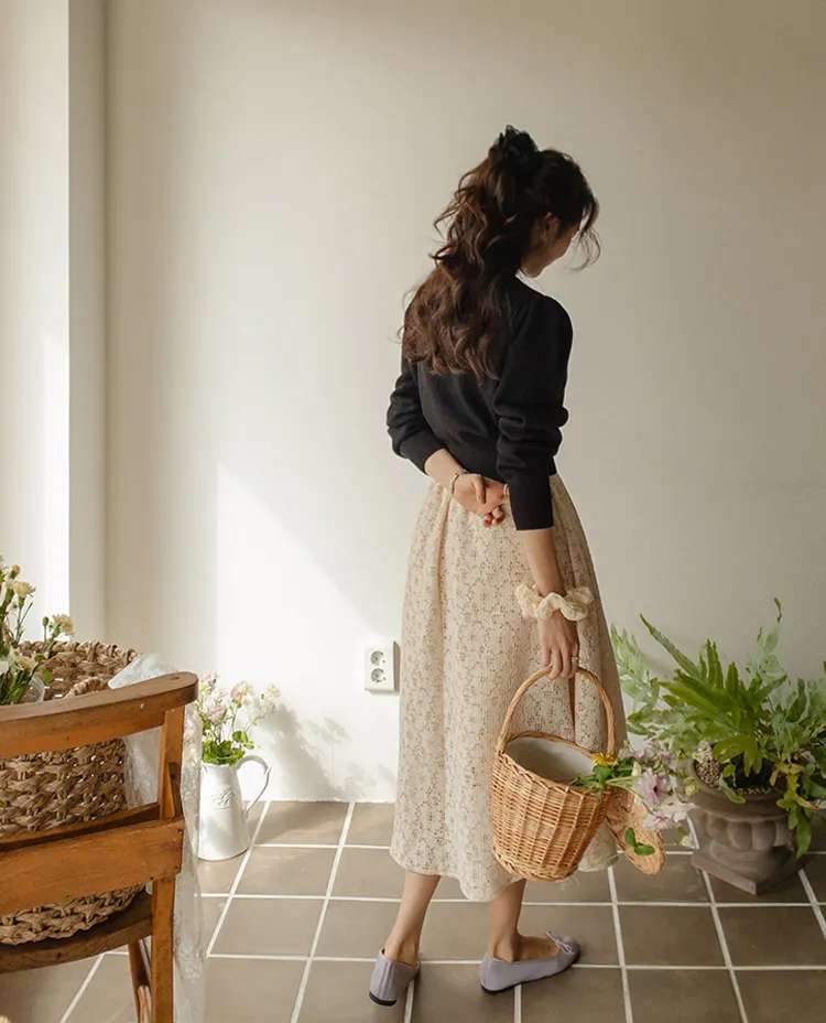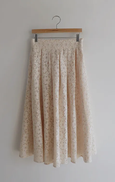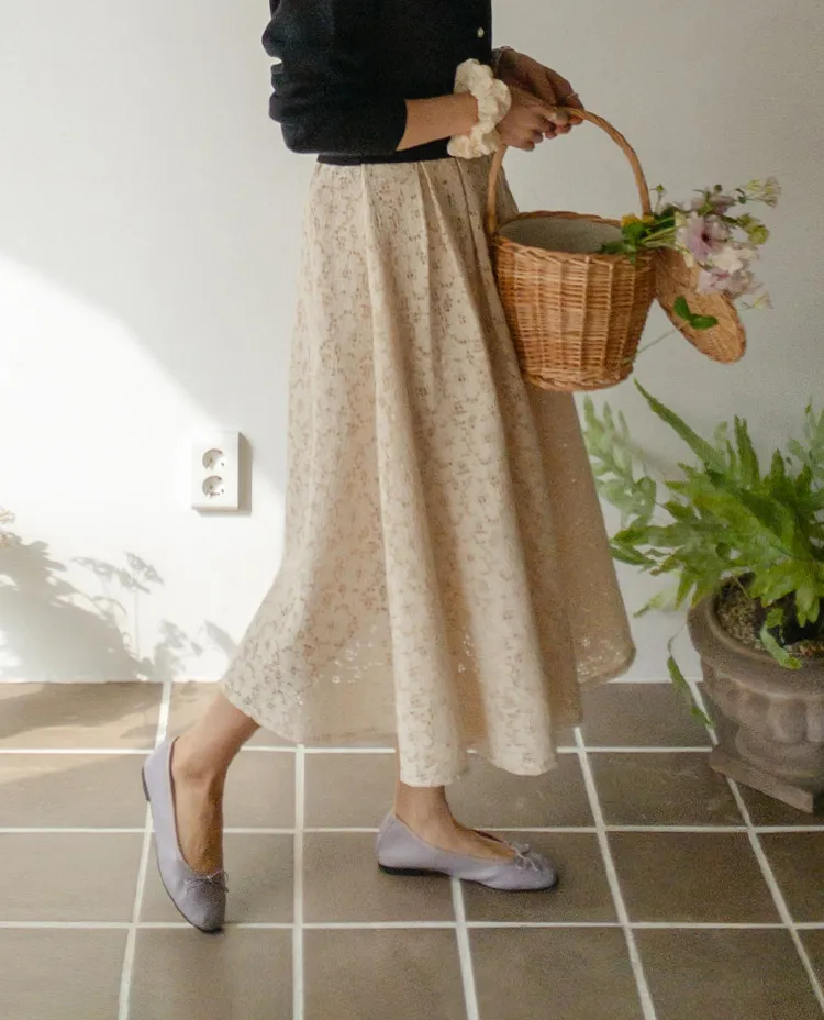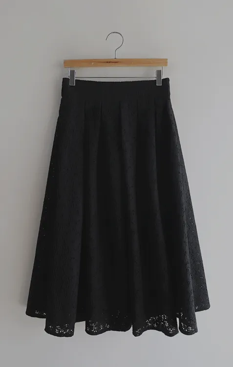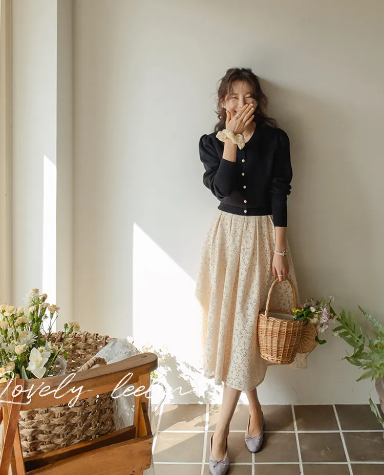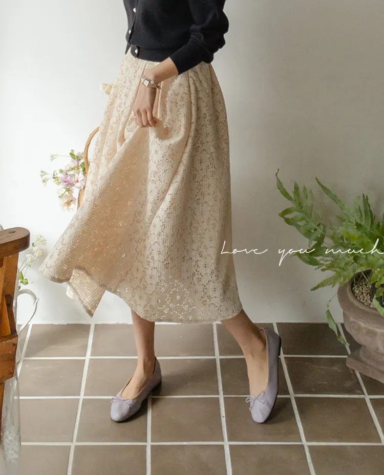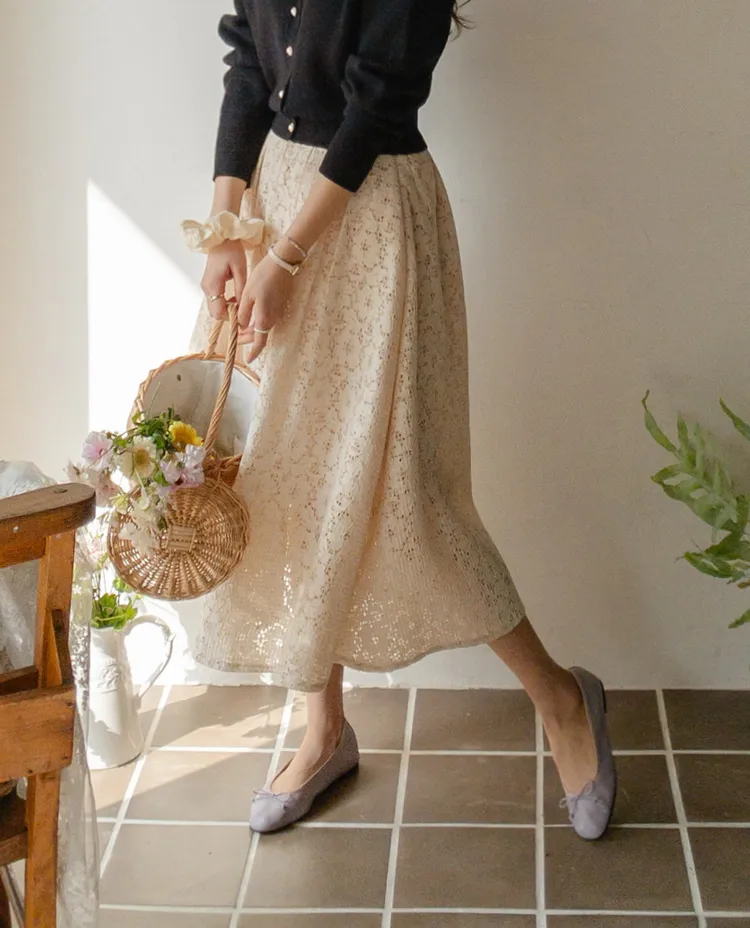 浪漫蕾絲花朵腰線針褶傘擺中長裙