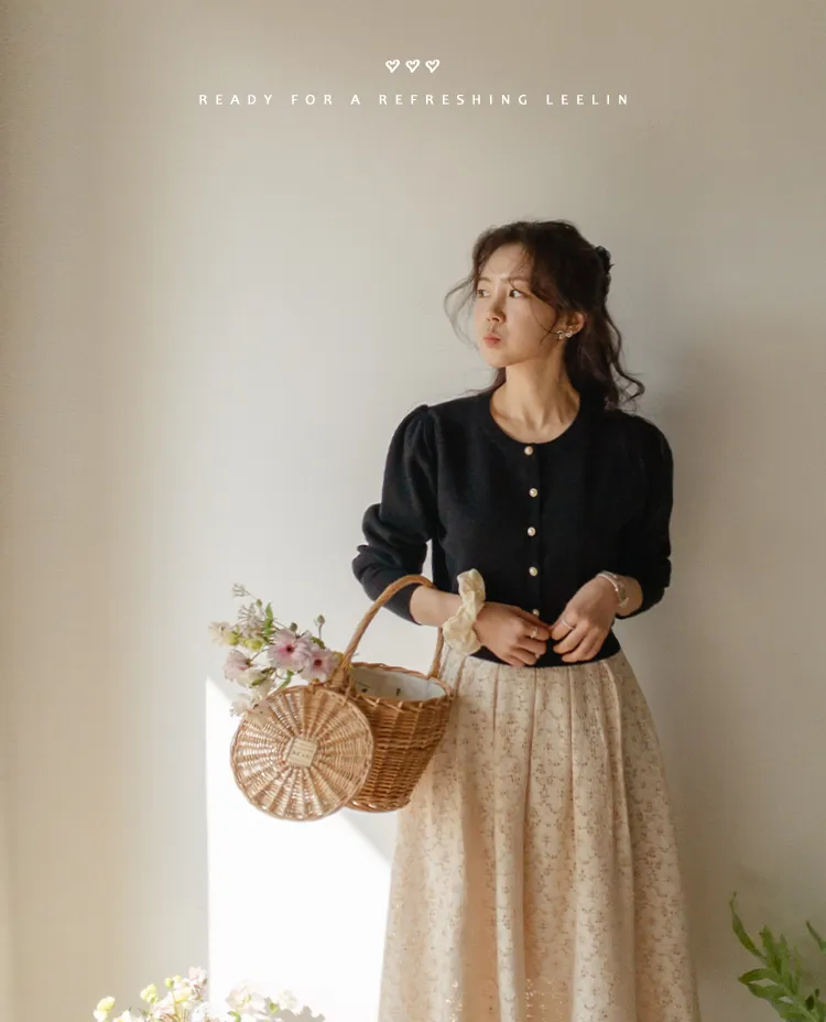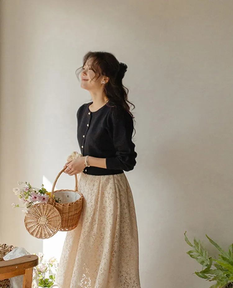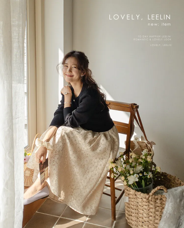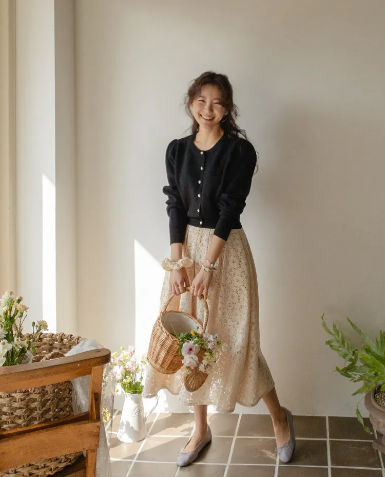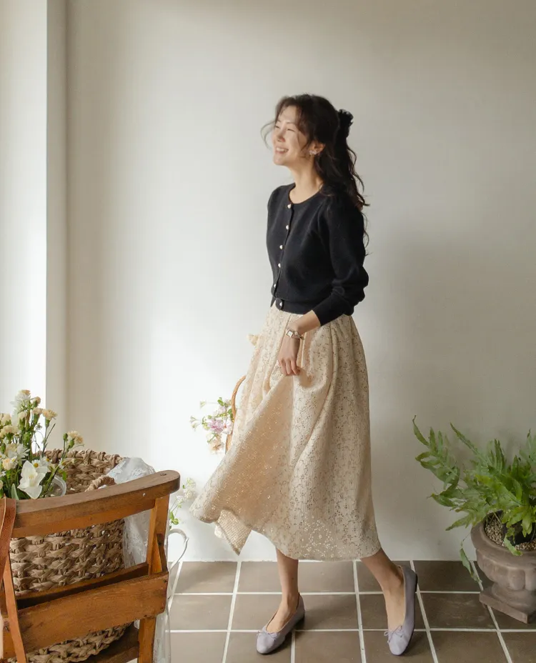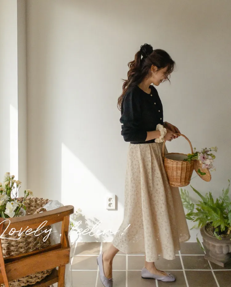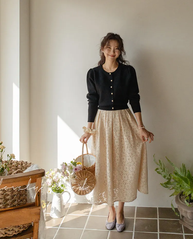 浪漫蕾絲花朵腰線針褶傘擺中長裙