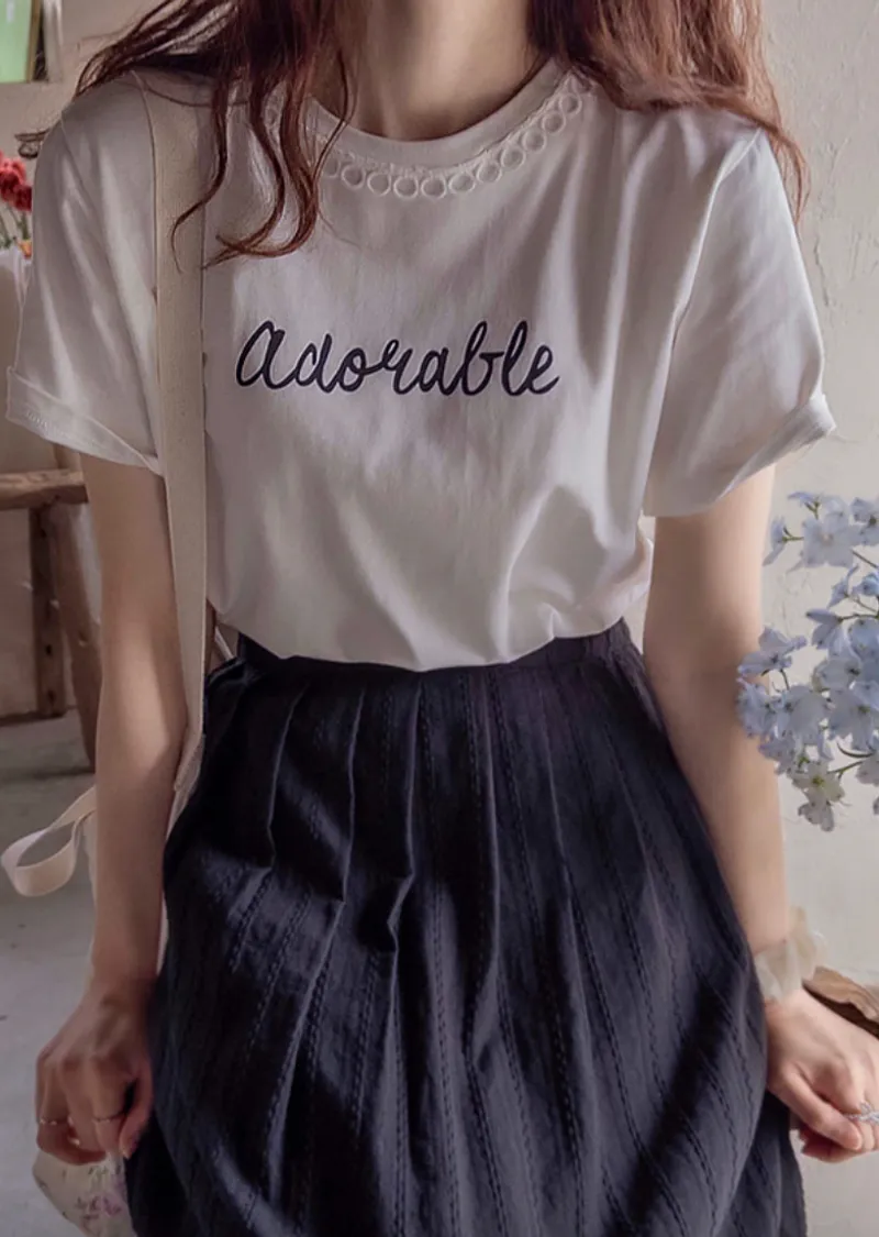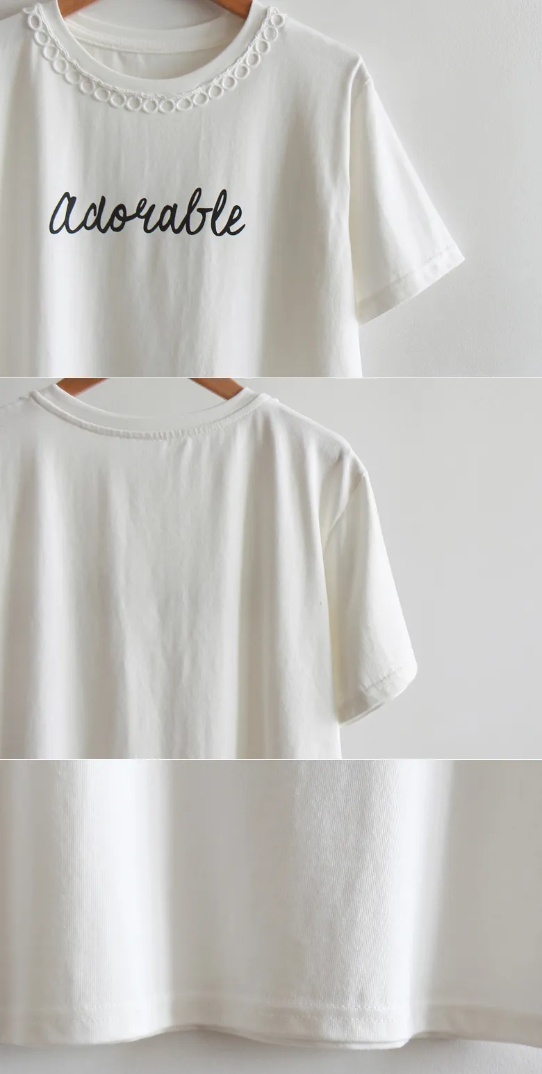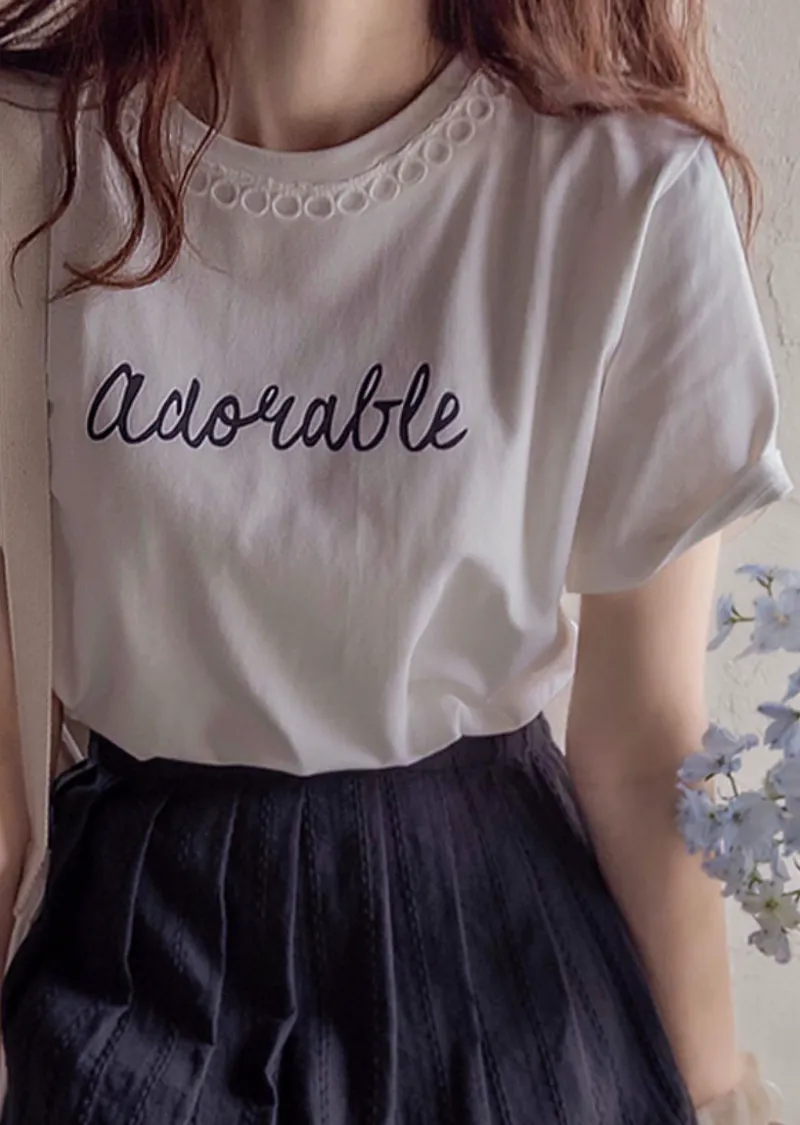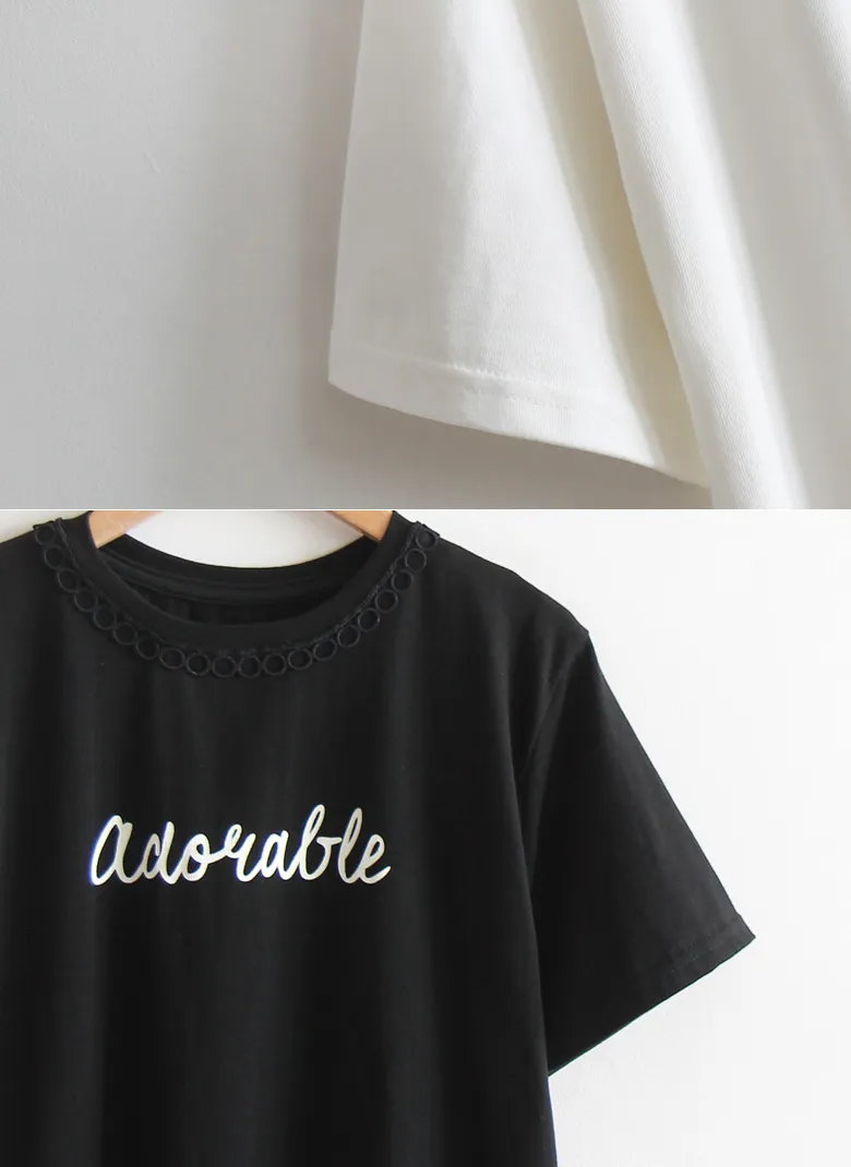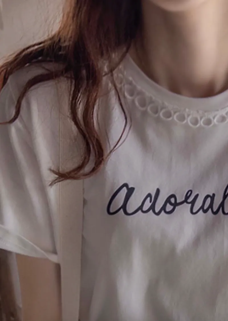 點綴圓形蕾絲領口字母印花短袖上衣