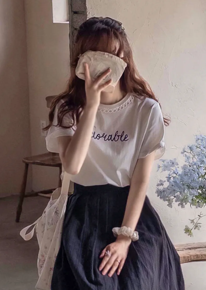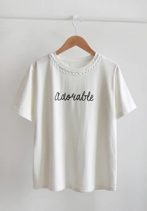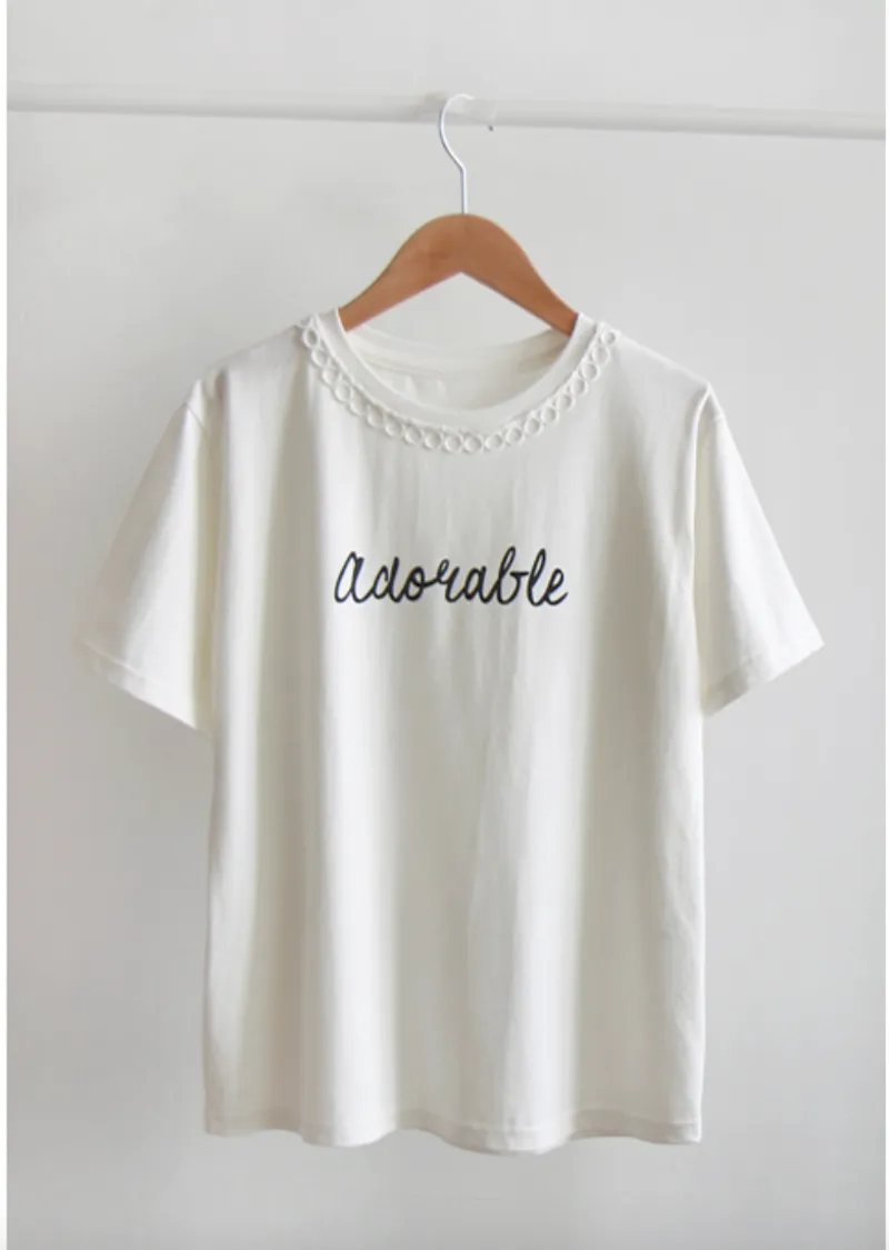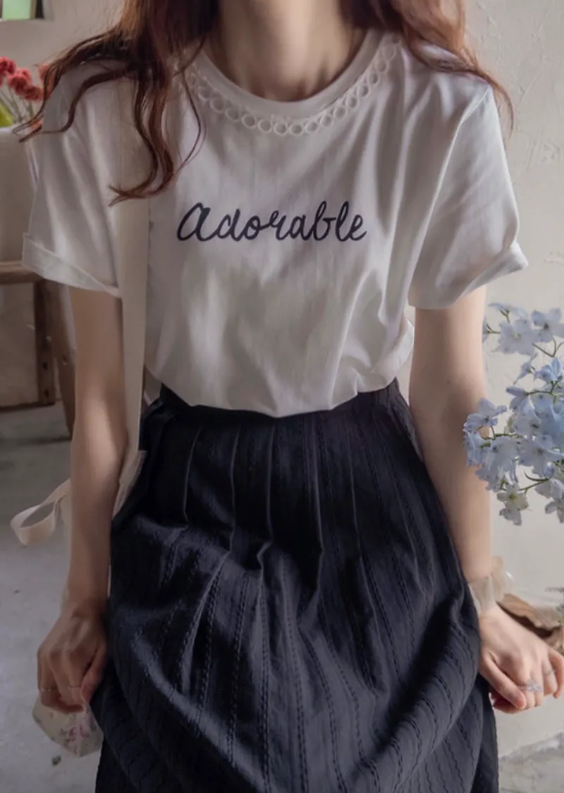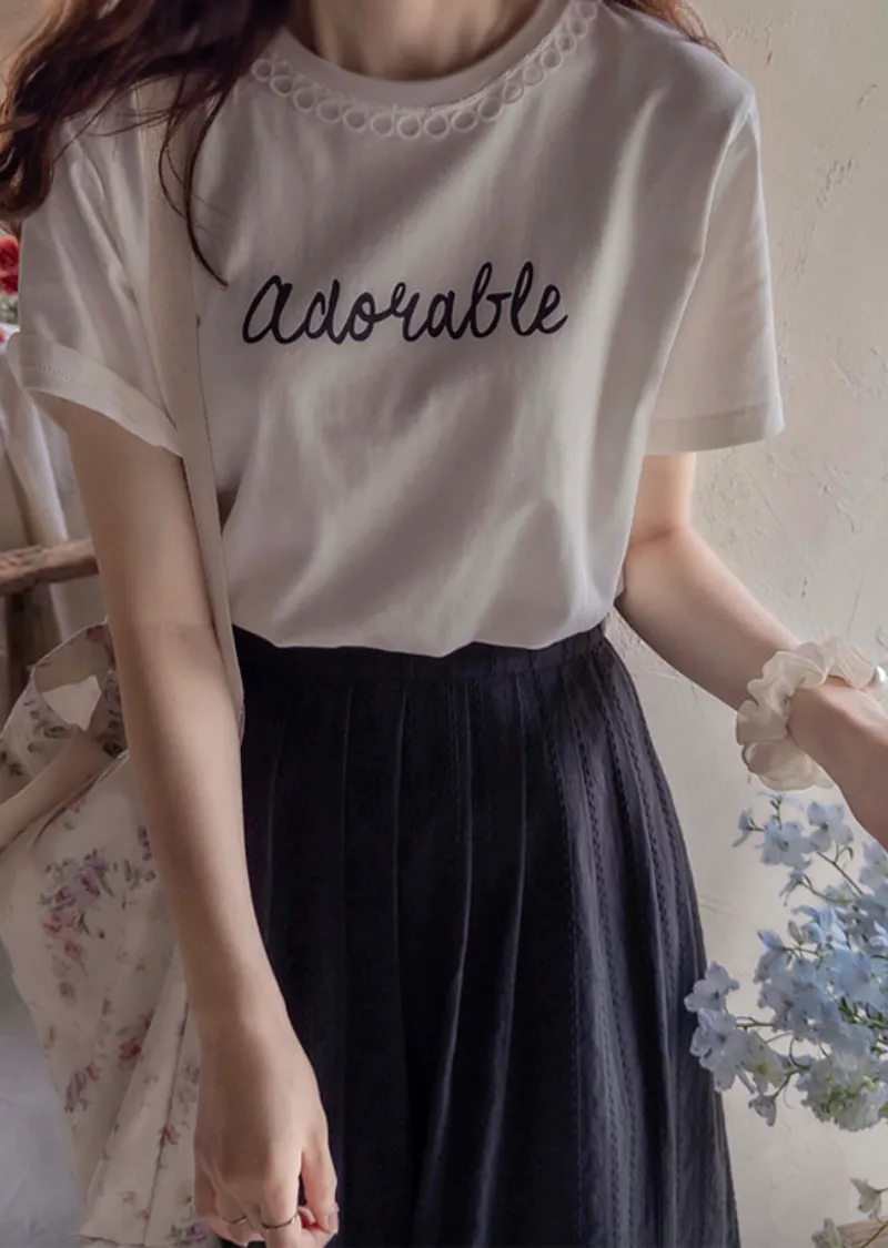 點綴圓形蕾絲領口字母印花短袖上衣