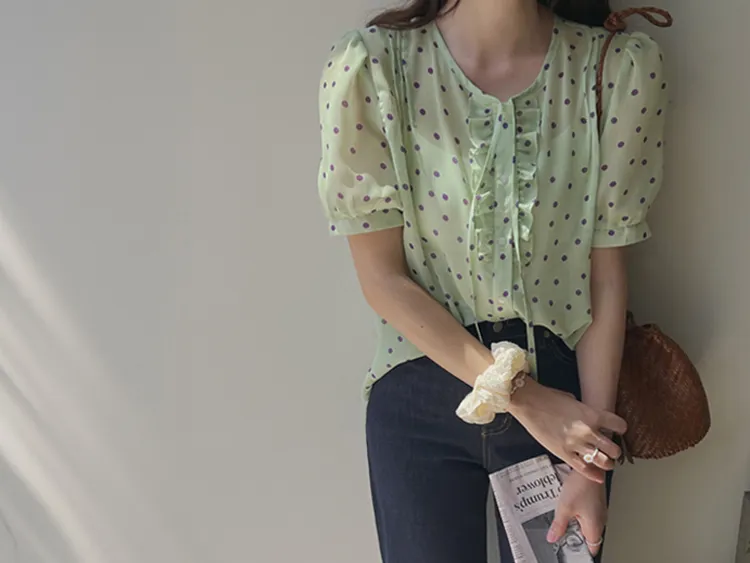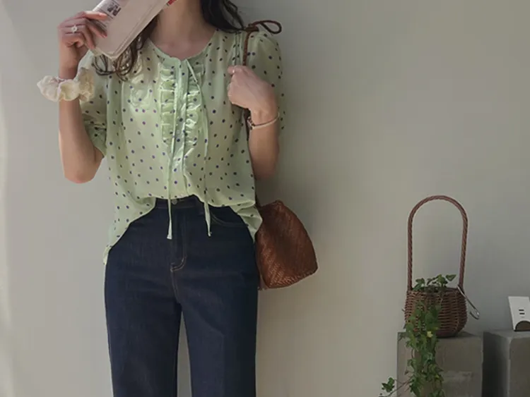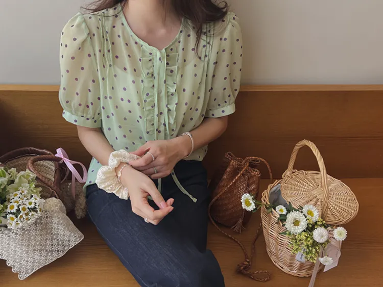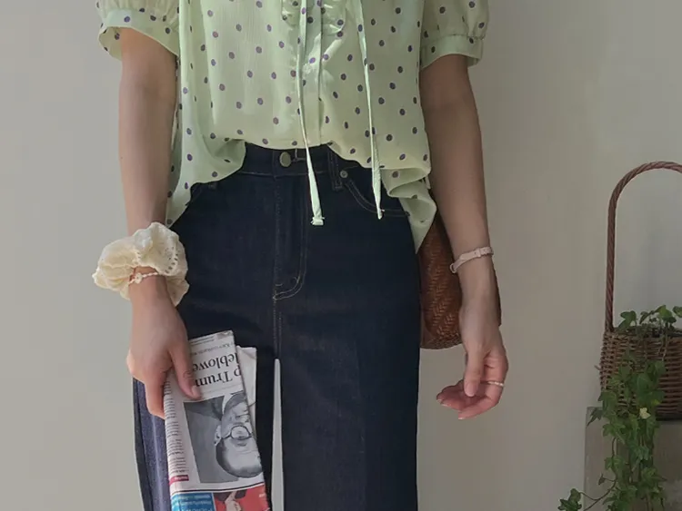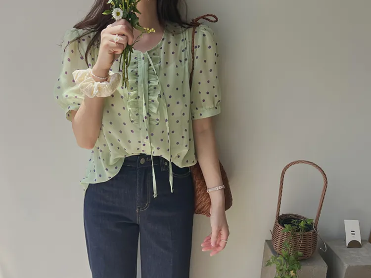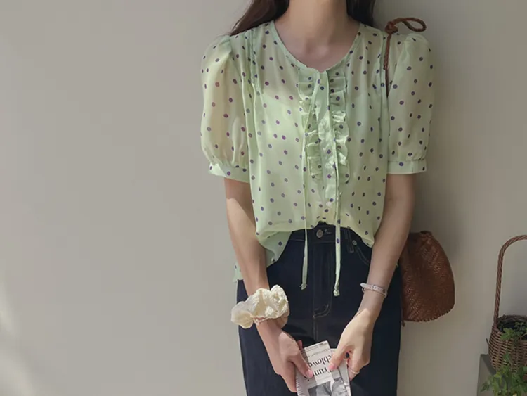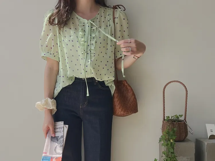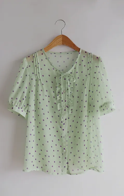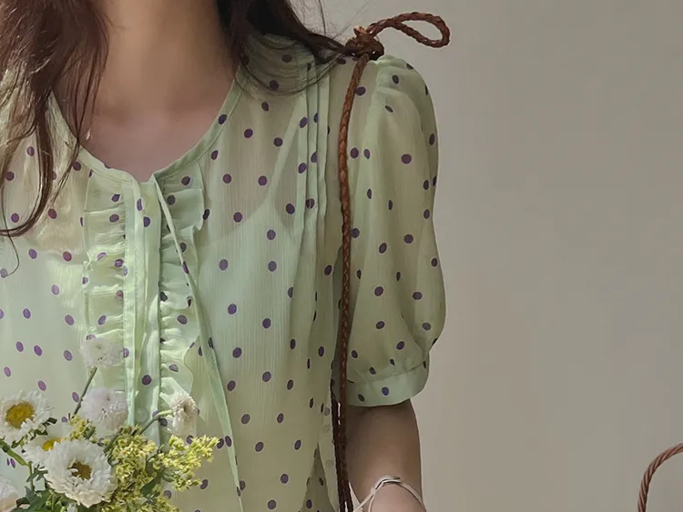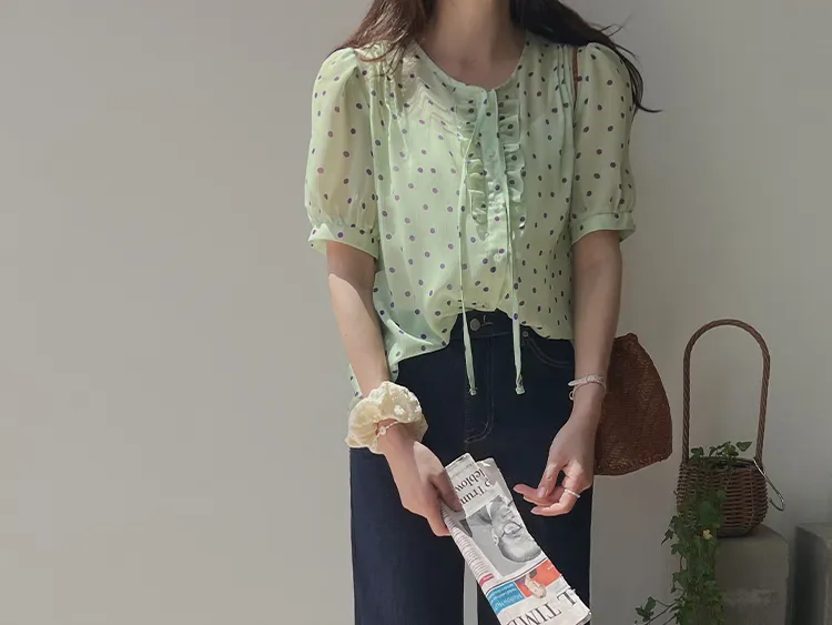 獨特配色點點摺邊綁帶雪紡排扣上衣
