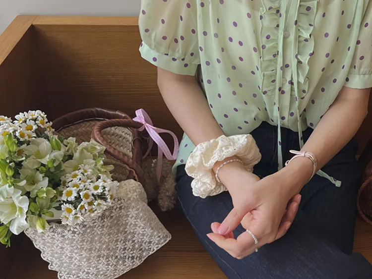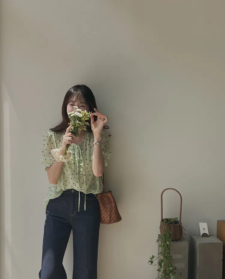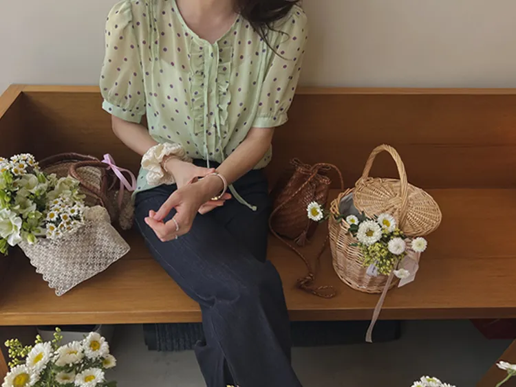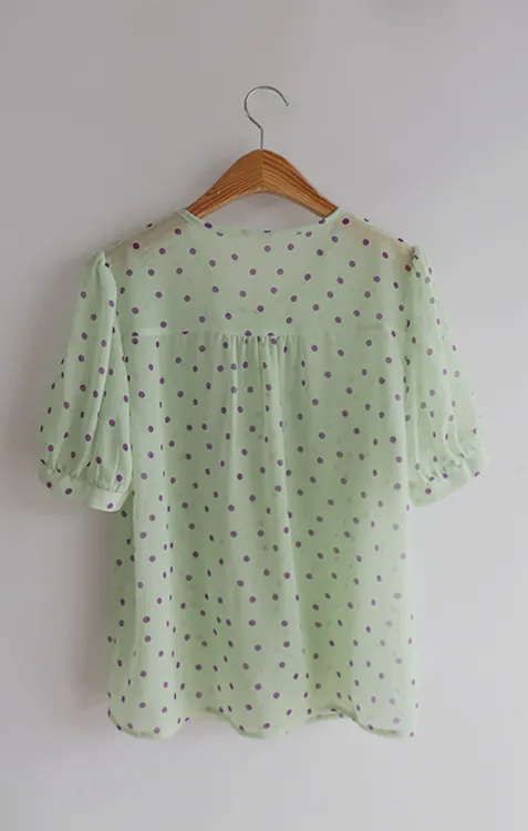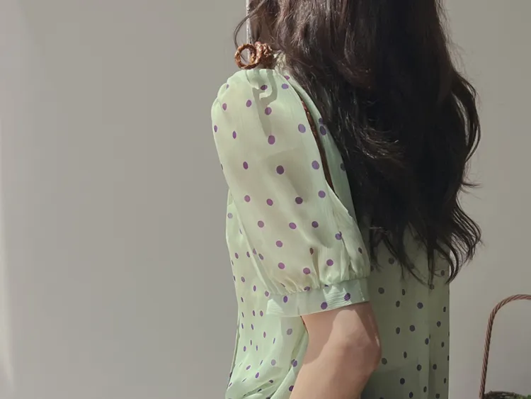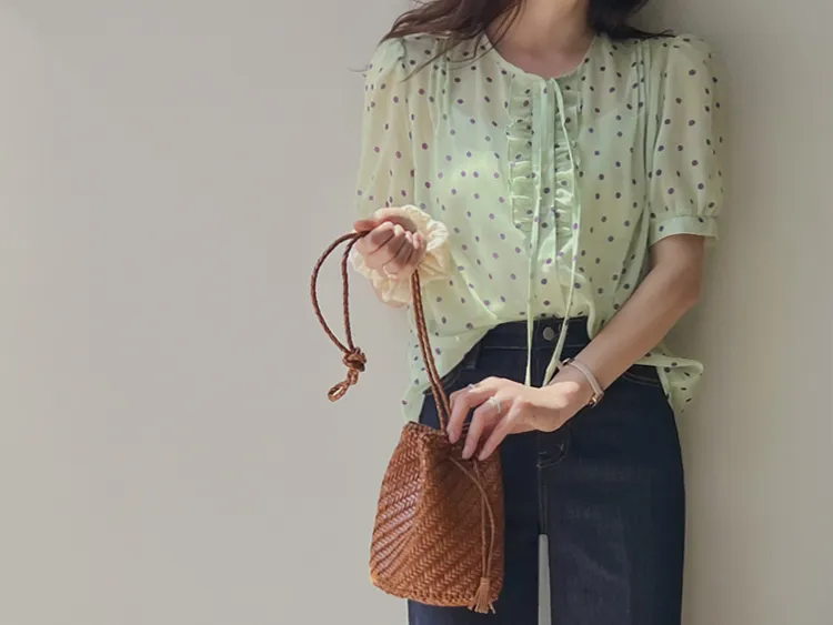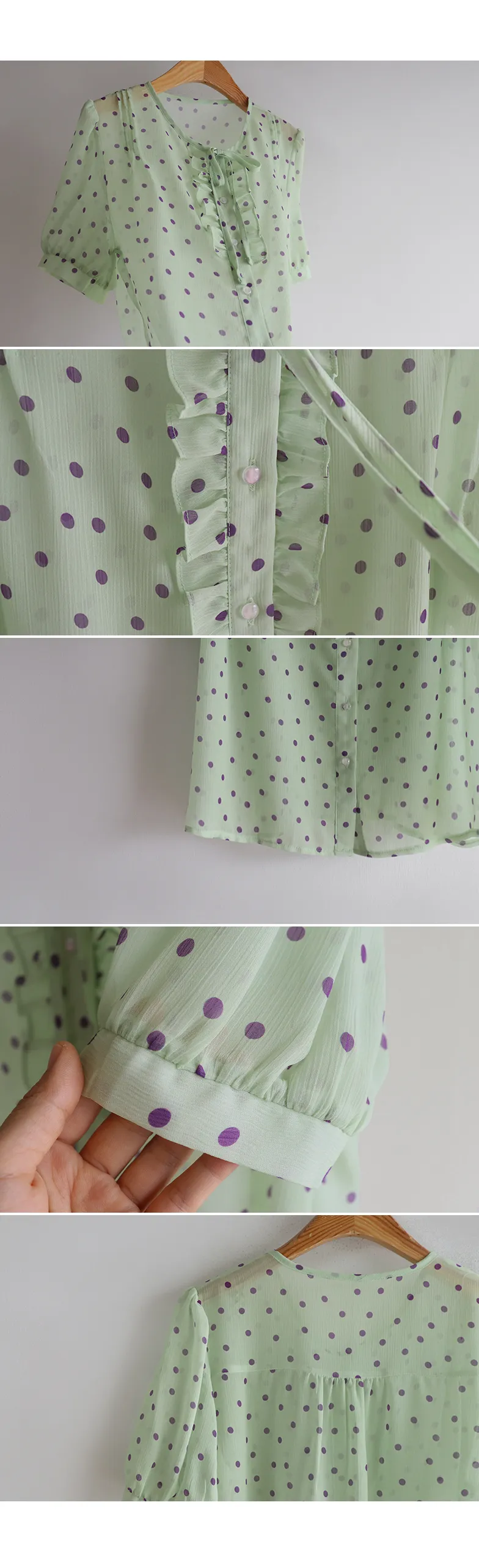 獨特配色點點摺邊綁帶雪紡排扣上衣