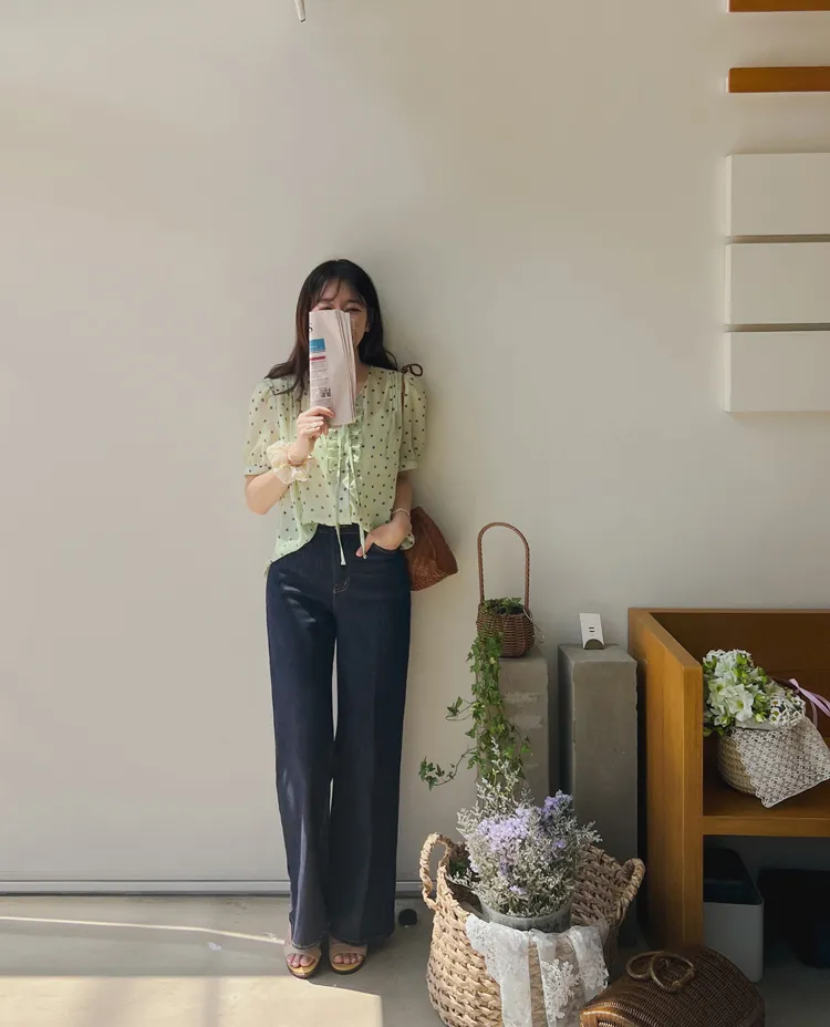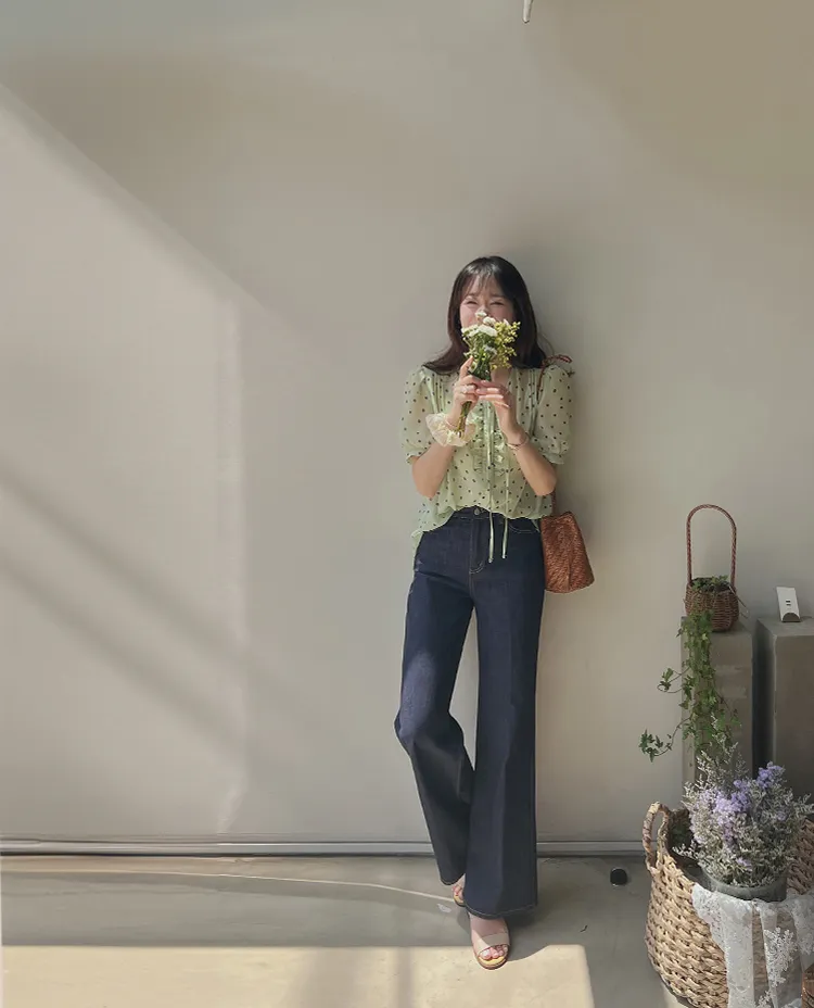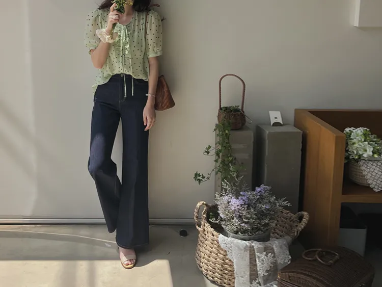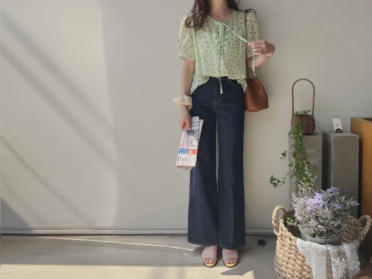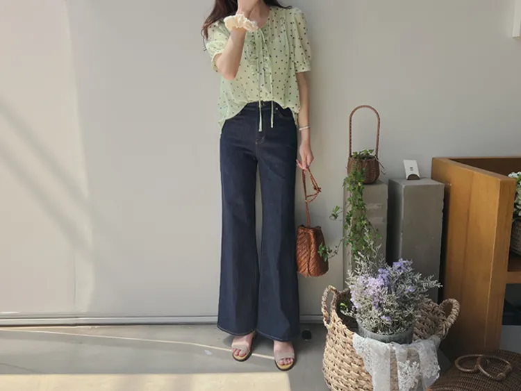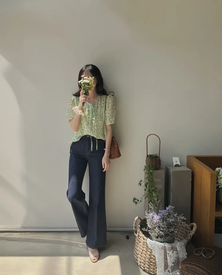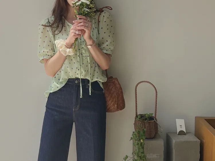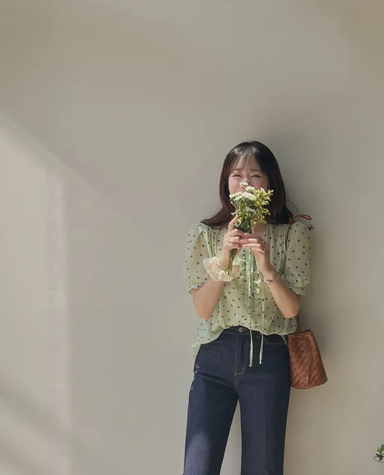 獨特配色點點摺邊綁帶雪紡排扣上衣