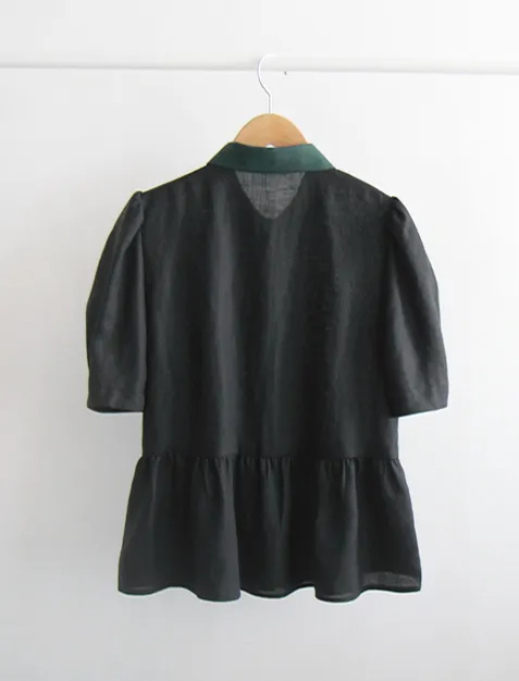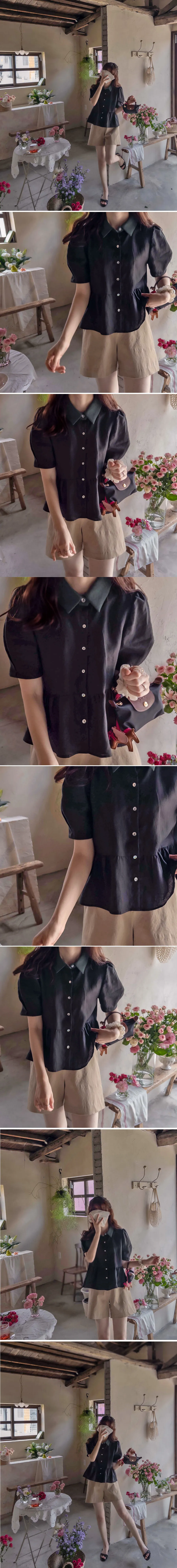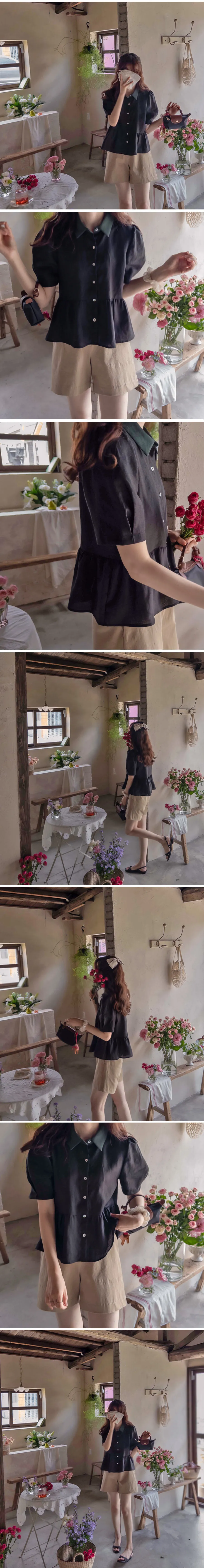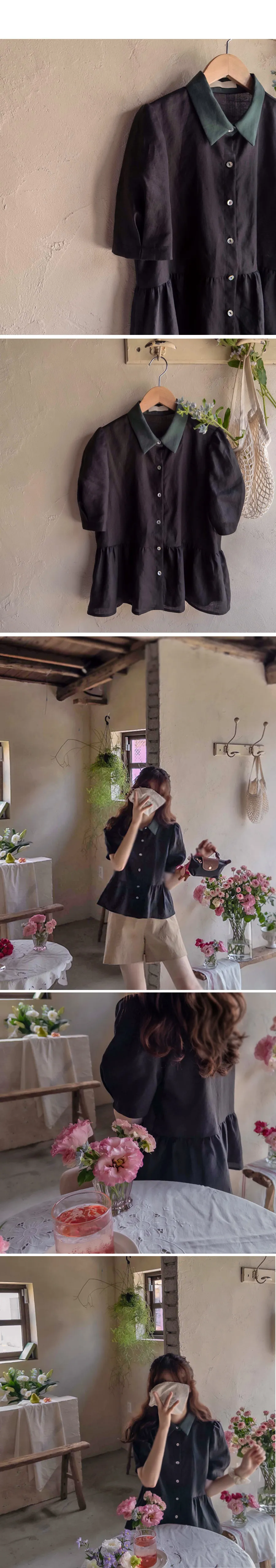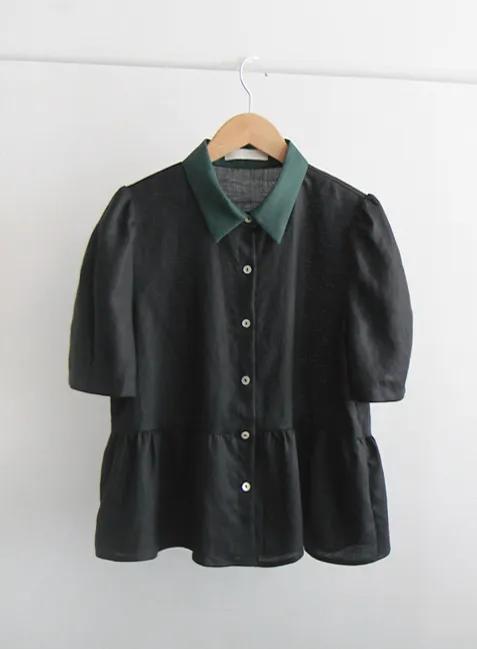 [漂亮的頸部領口顏色組合][夏季穿著涼爽的亞麻材質][底部波浪形狀的可愛設計][以精緻的顏色呈現適合季節的感覺][泡泡袖的優雅外觀,適當的體積與別針][可愛的夏季襯衫]