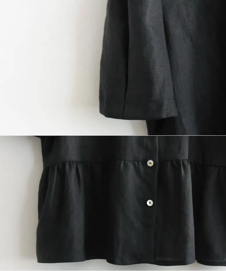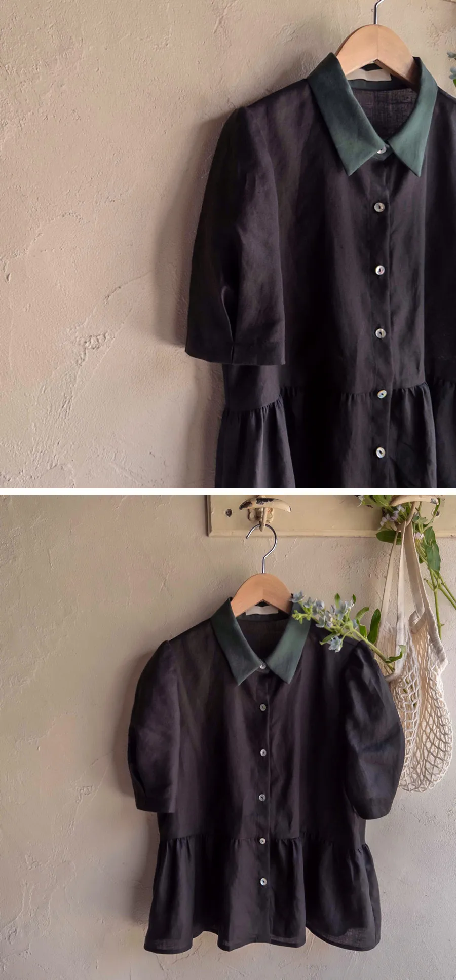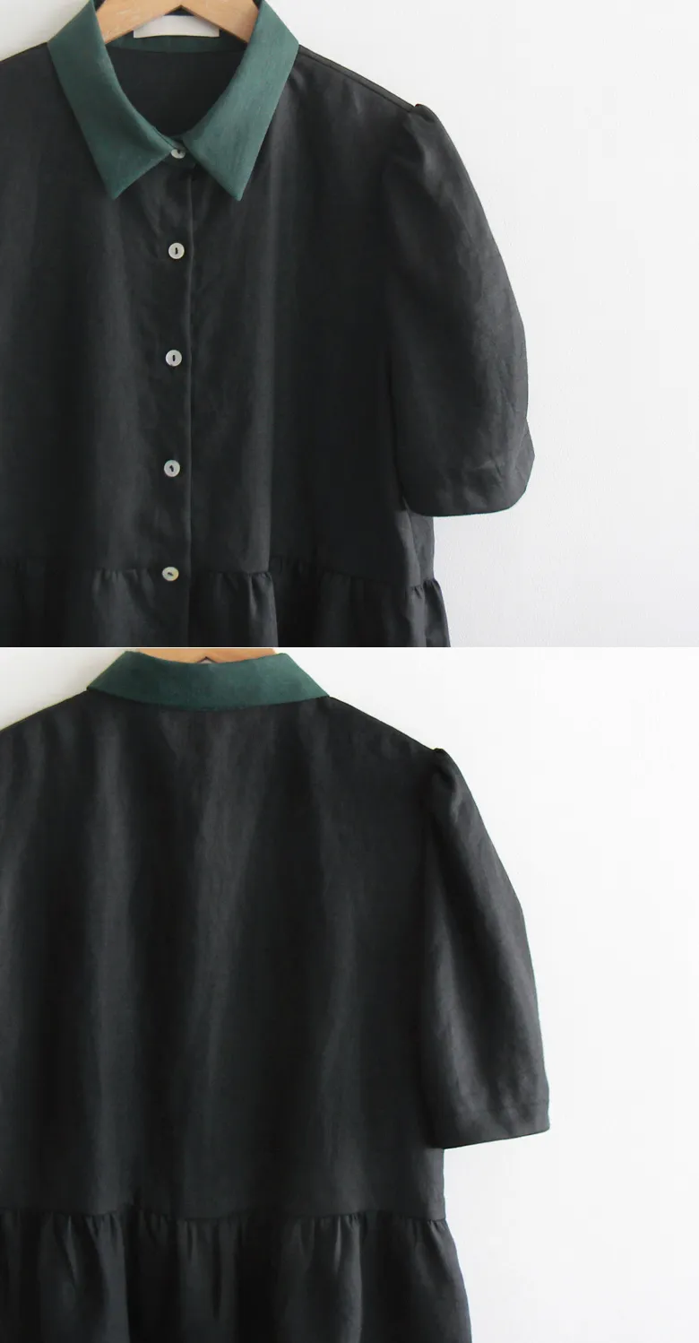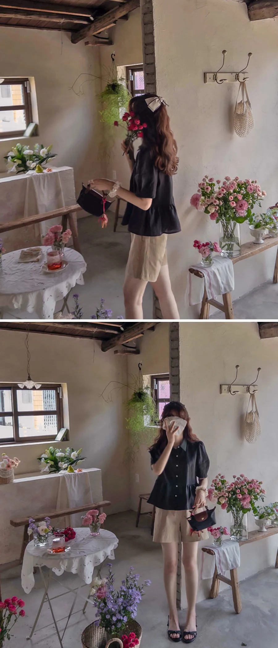 [漂亮的頸部領口顏色組合][夏季穿著涼爽的亞麻材質][底部波浪形狀的可愛設計][以精緻的顏色呈現適合季節的感覺][泡泡袖的優雅外觀,適當的體積與別針][可愛的夏季襯衫]
