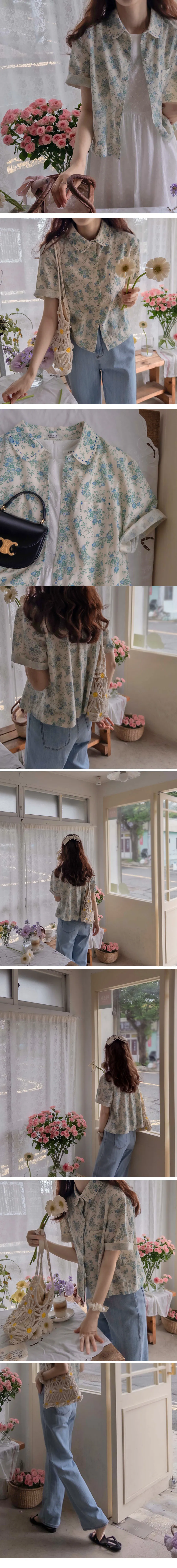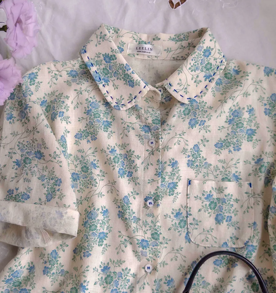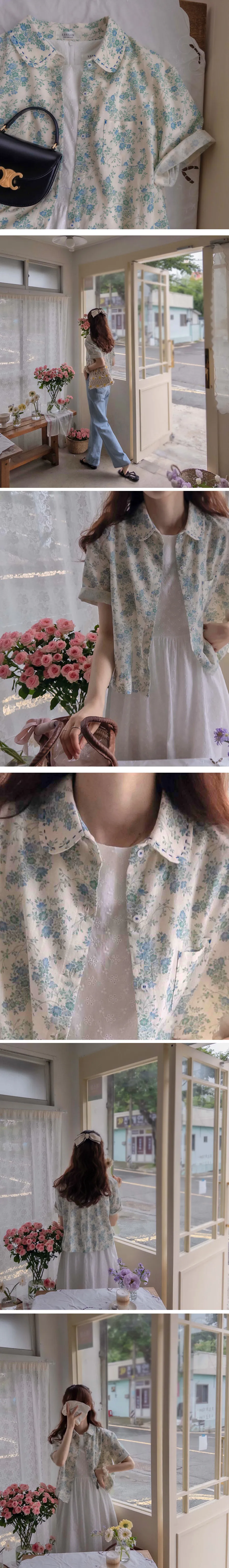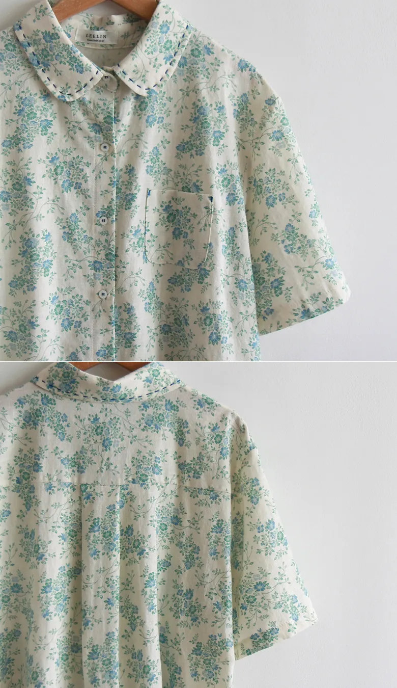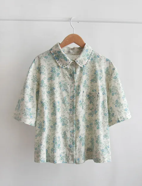 [夏天涼爽的面料][花朵夏季襯衫][亮點是可愛的縫線圓領][有吸引力的口袋設計][[推薦作為優雅的夏季襯衫,設計可愛]