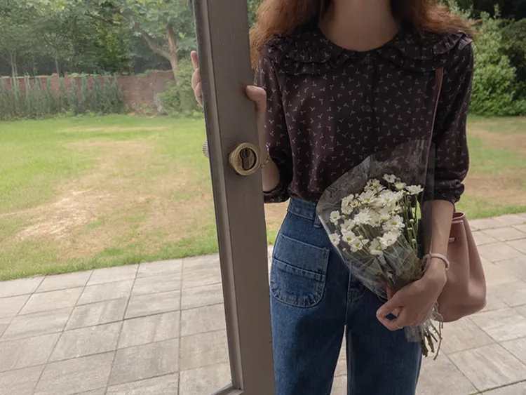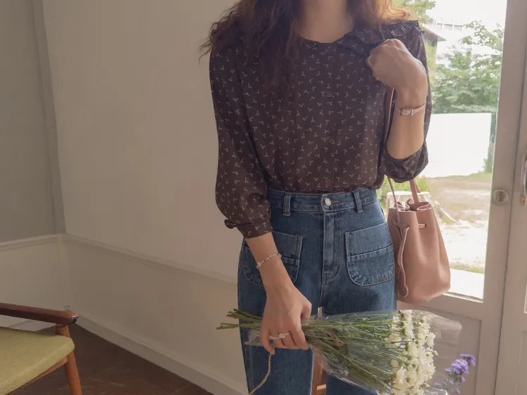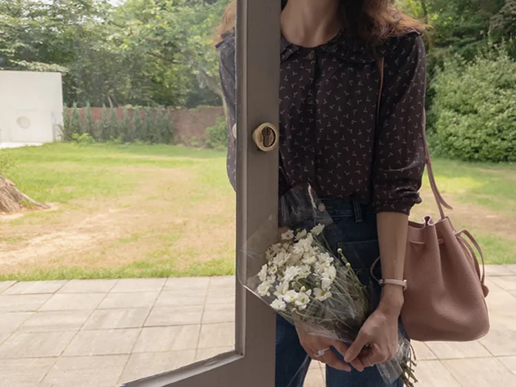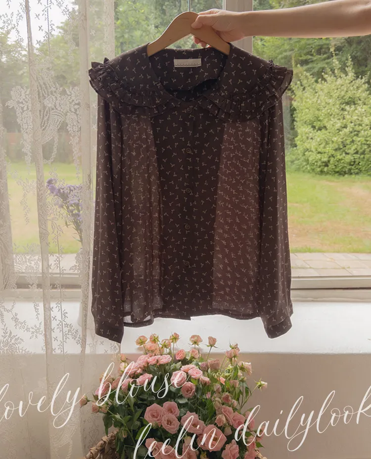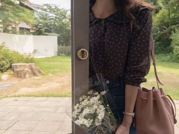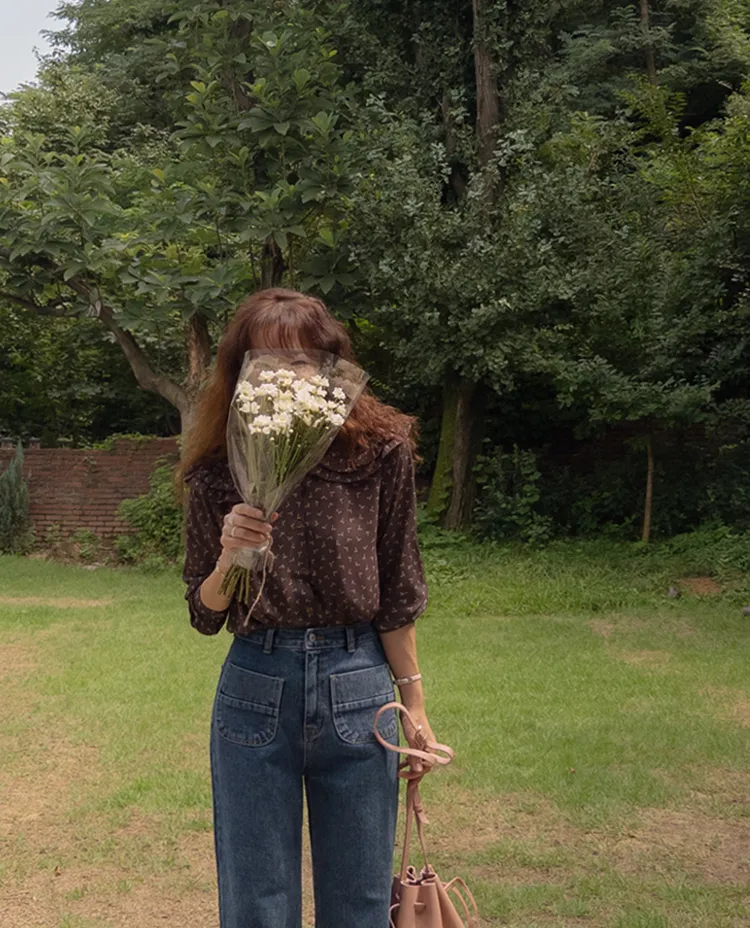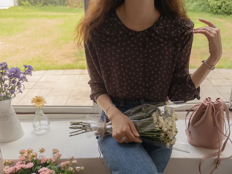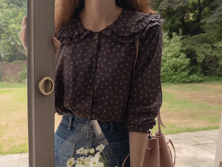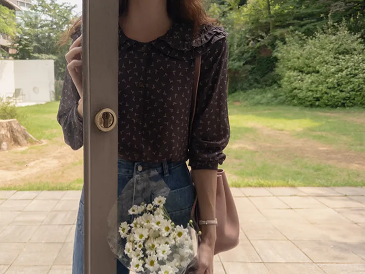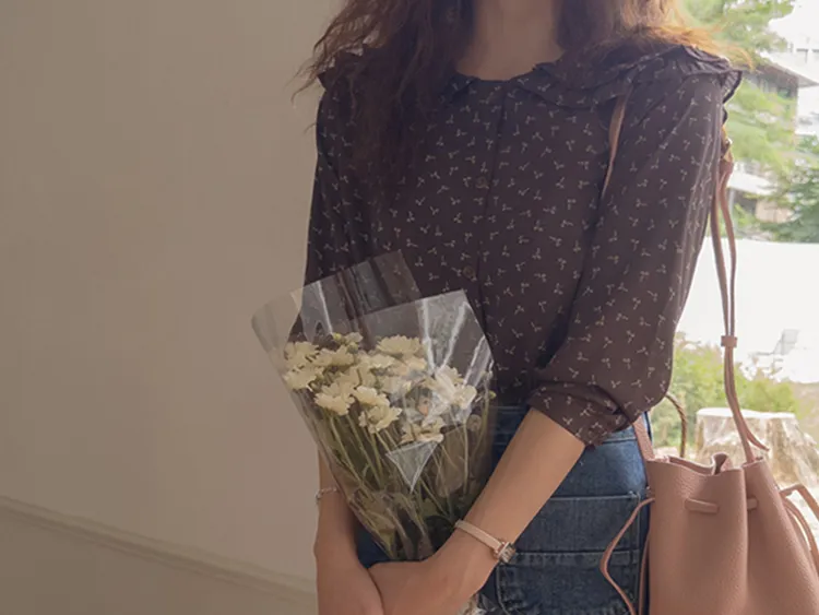 [雙褶邊領子細節充滿少女感][覆蓋肩線的披肩領設計,簡約的心情~][在季節之間也能穿搭的迷人花朵排扣上衣~可用性UP! ]