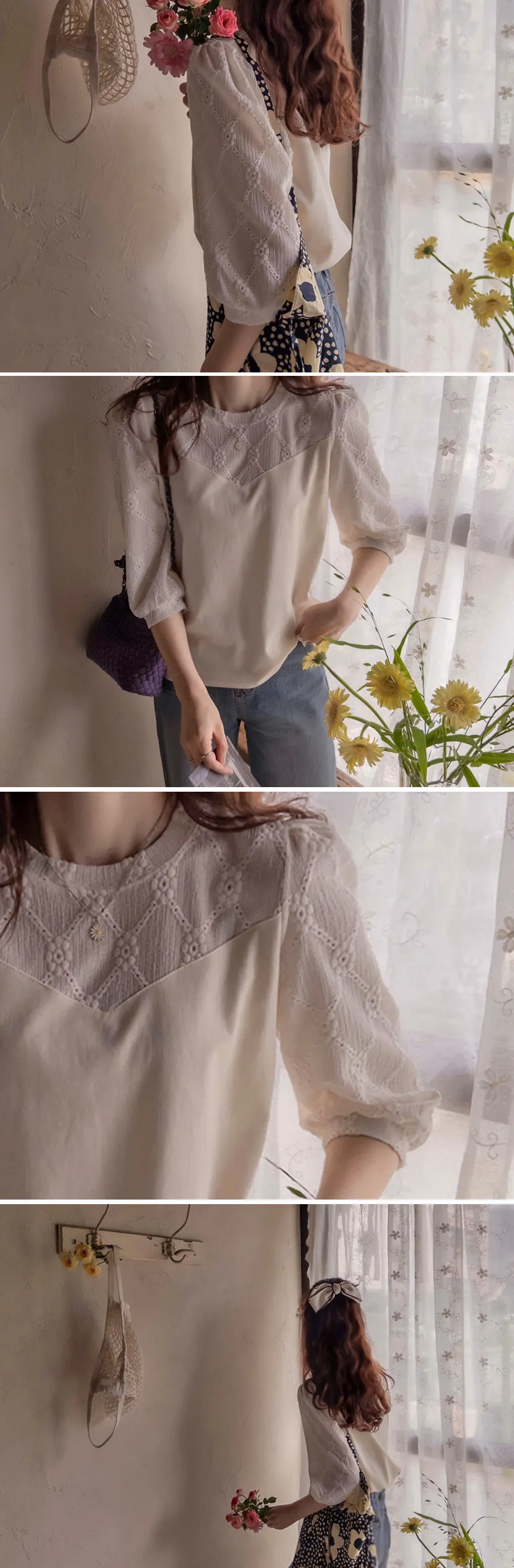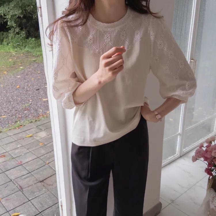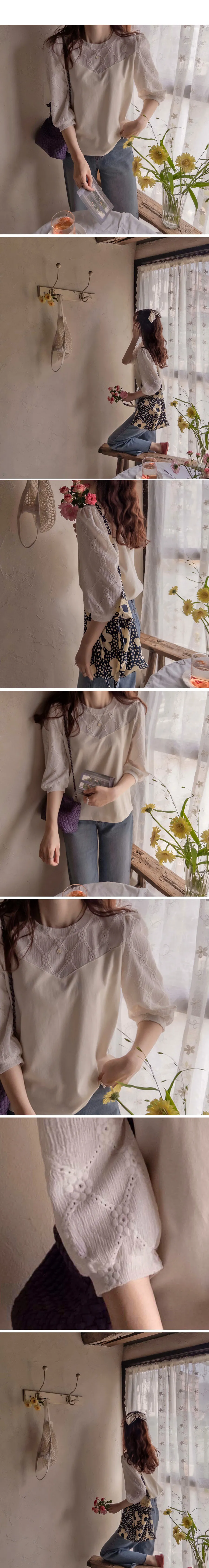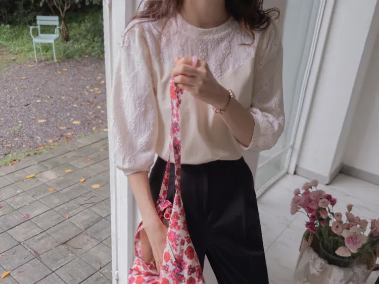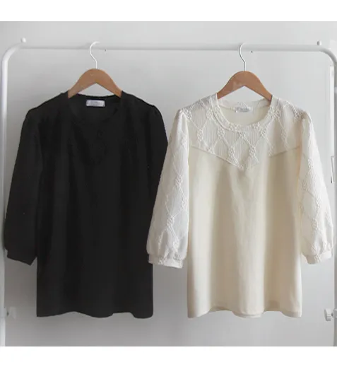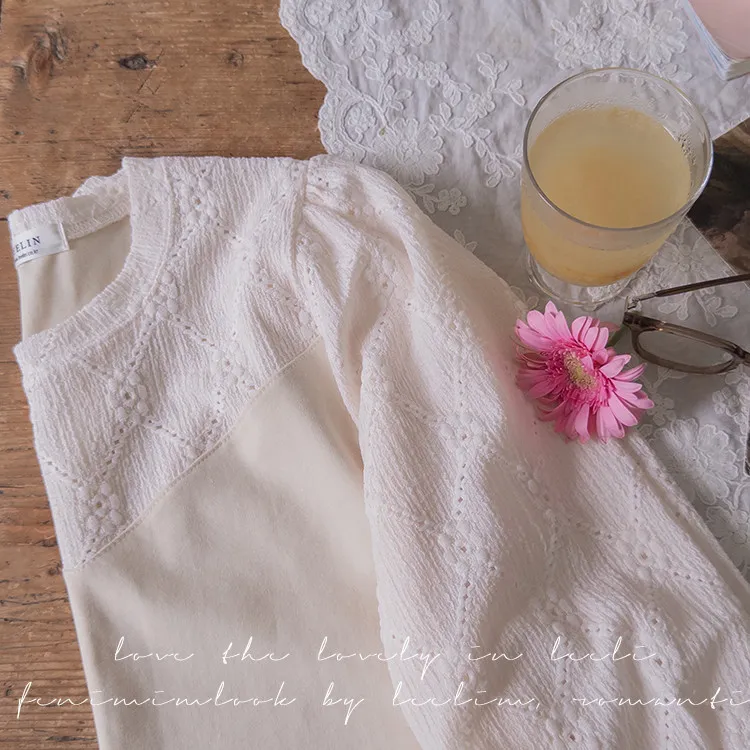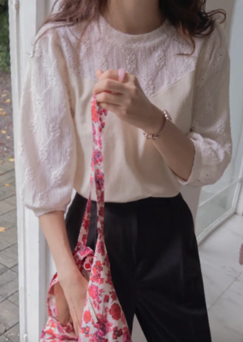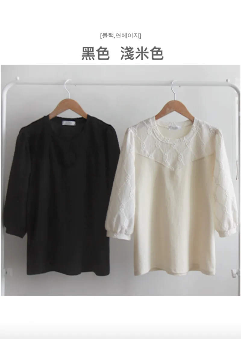 跨季][布料彈性強][袖子可愛的設計,立體花朵刺繡和蕾絲配色][鏤空也很漂亮][蕾絲袖子和衣身都有彈性][肩部剪裁設計]