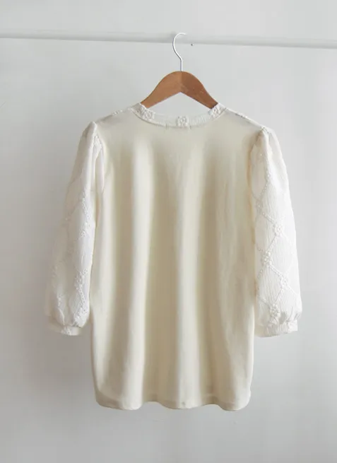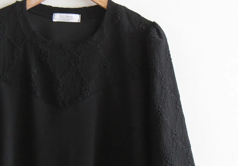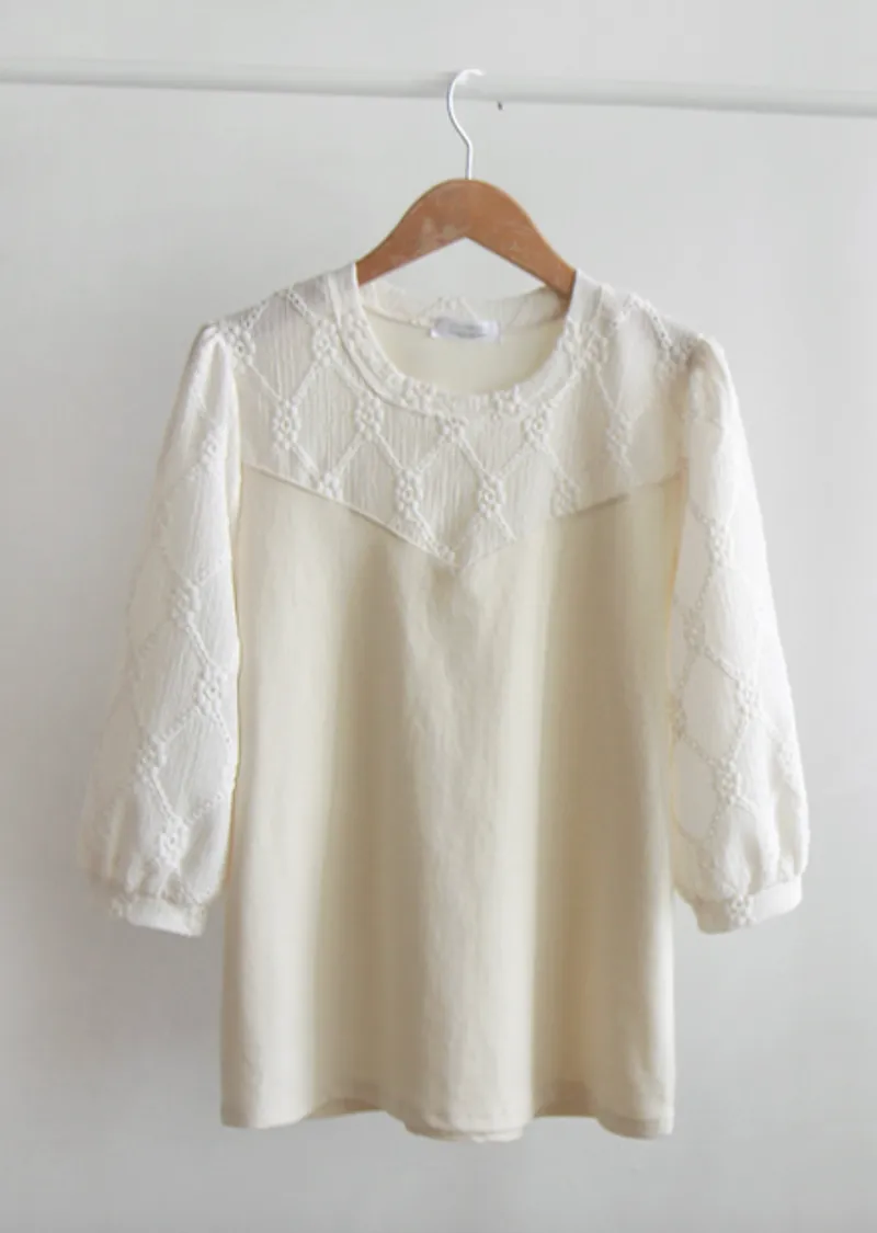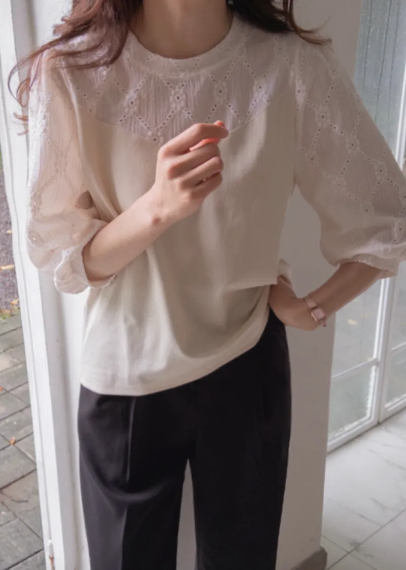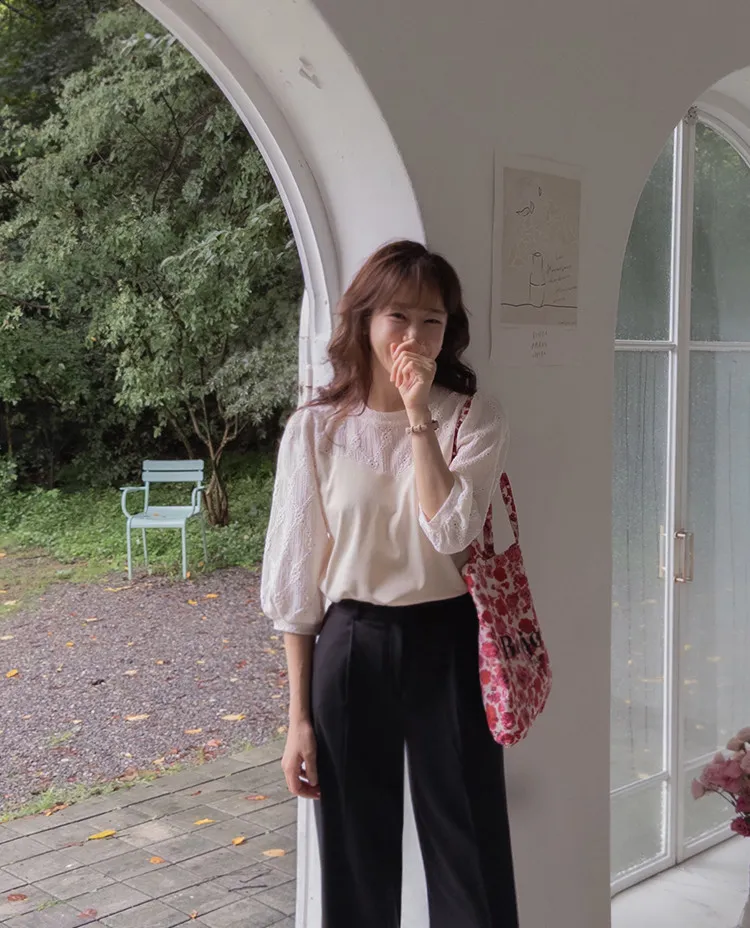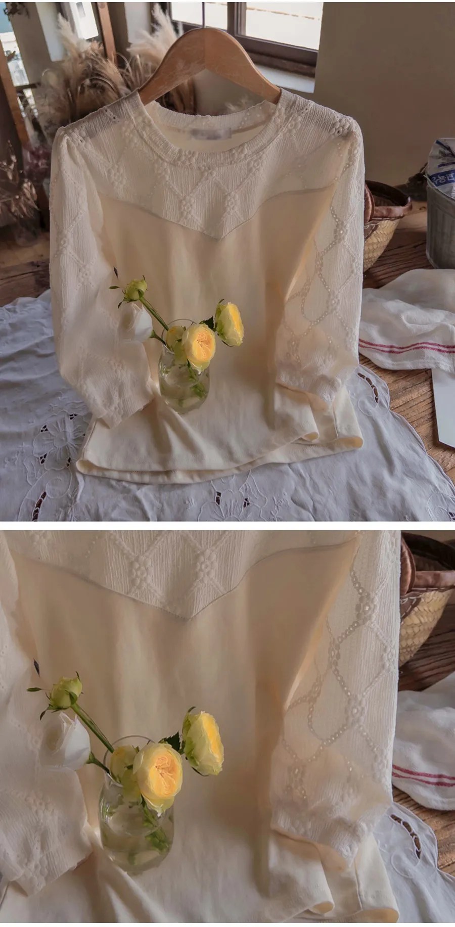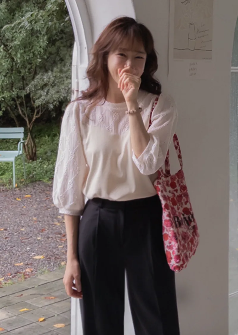 跨季][布料彈性強][袖子可愛的設計,立體花朵刺繡和蕾絲配色][鏤空也很漂亮][蕾絲袖子和衣身都有彈性][肩部剪裁設計]