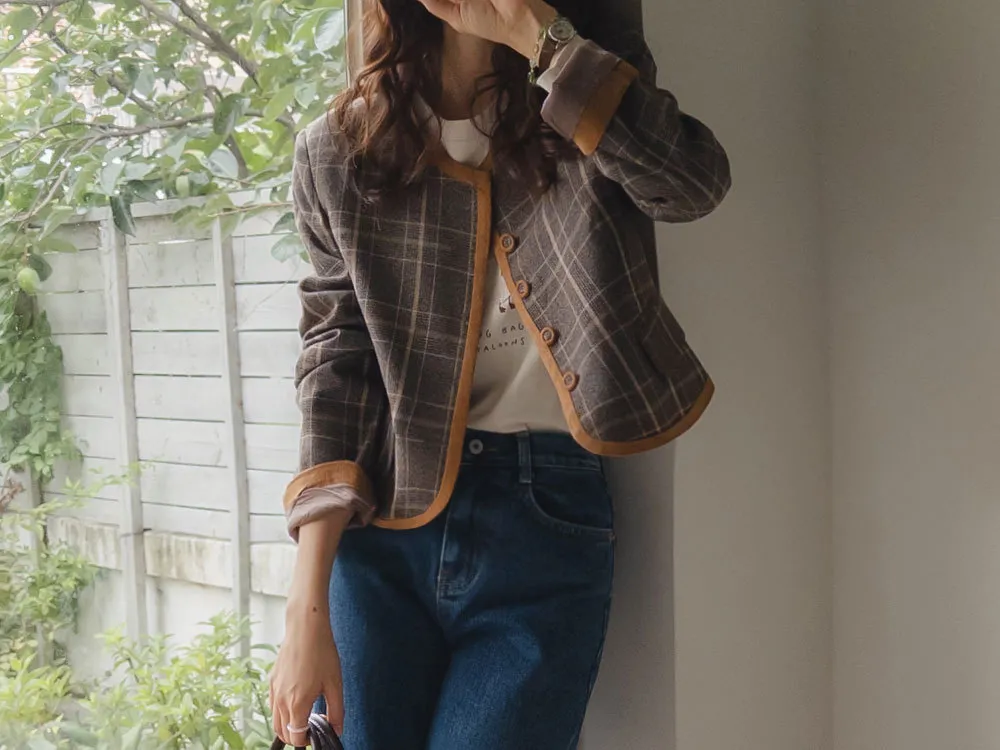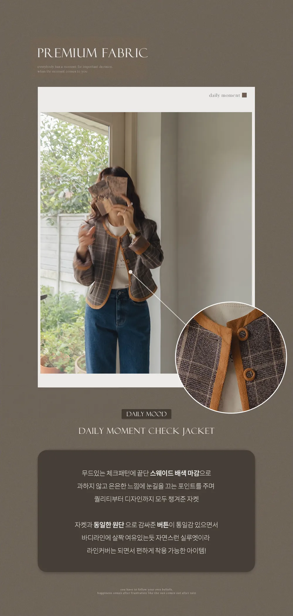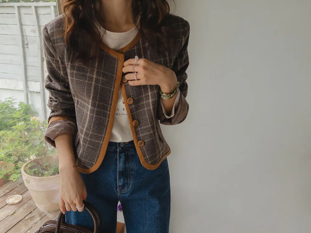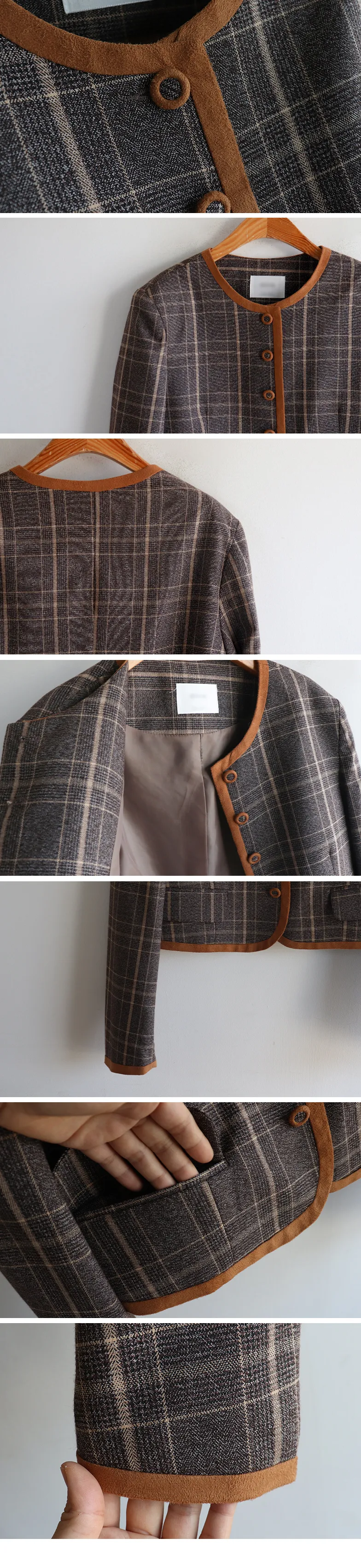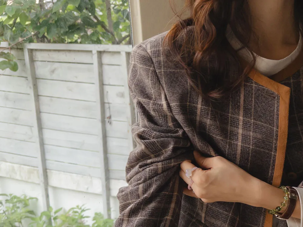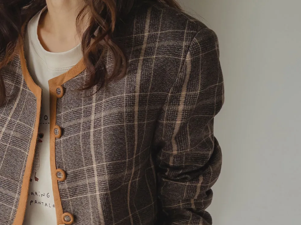 【時尚格紋+麂皮配色的外套】【雖然是含有天絲和氨綸面料的外套,但是輕薄舒適~】【獨特的鈕扣提升細節品質!