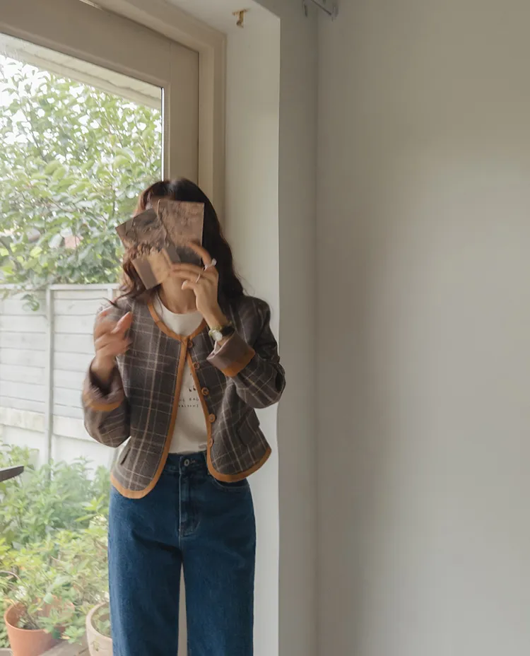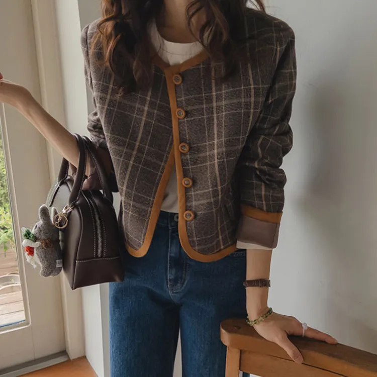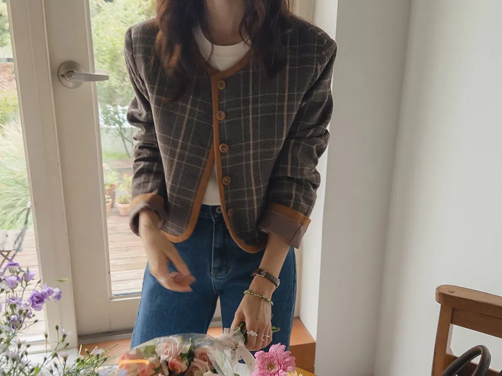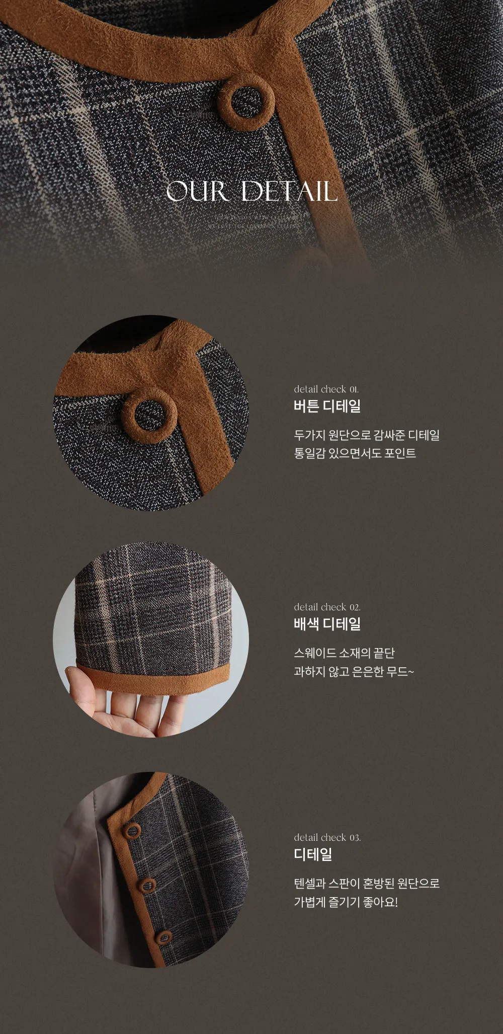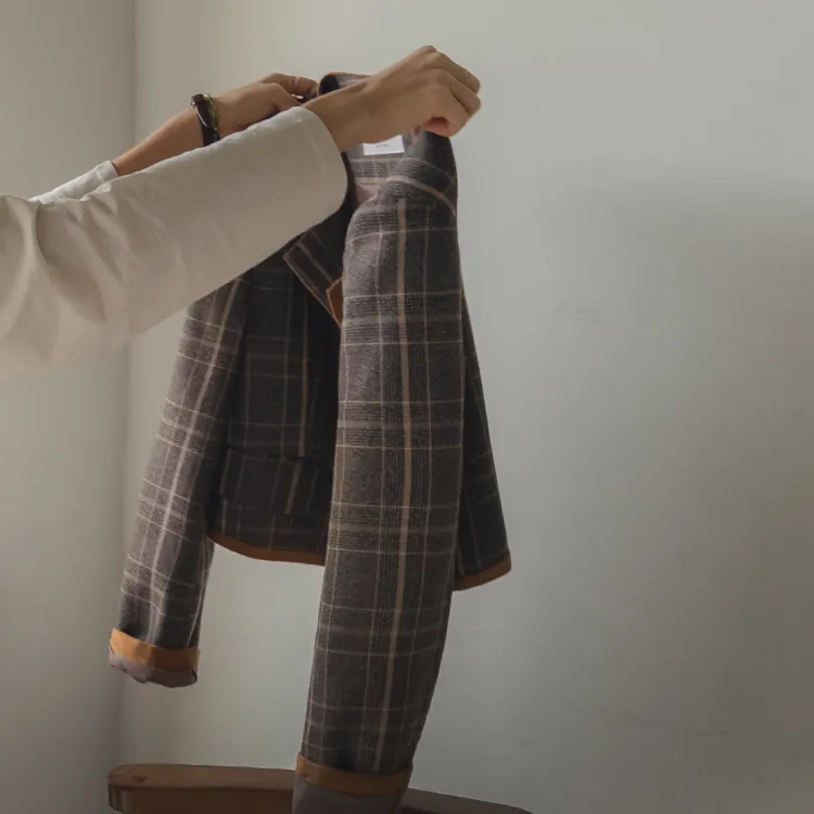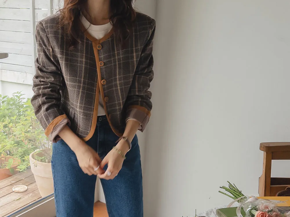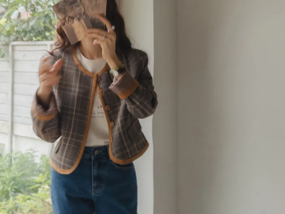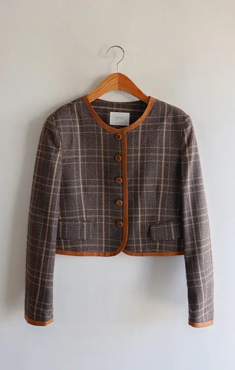 【時尚格紋+麂皮配色的外套】【雖然是含有天絲和氨綸面料的外套,但是輕薄舒適~】【獨特的鈕扣提升細節品質!