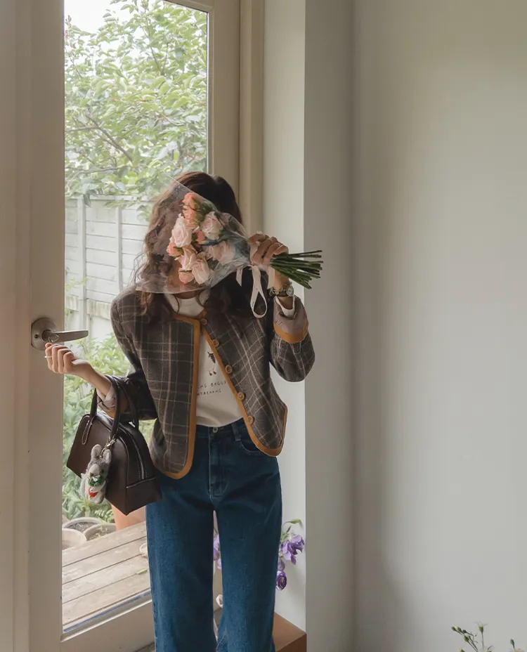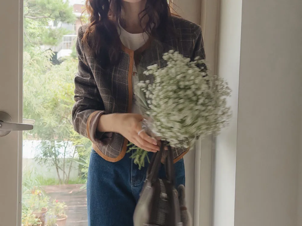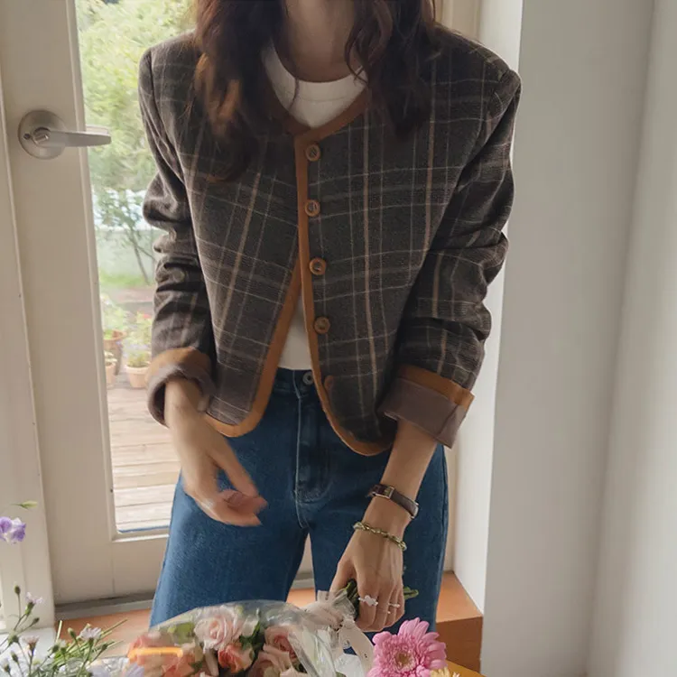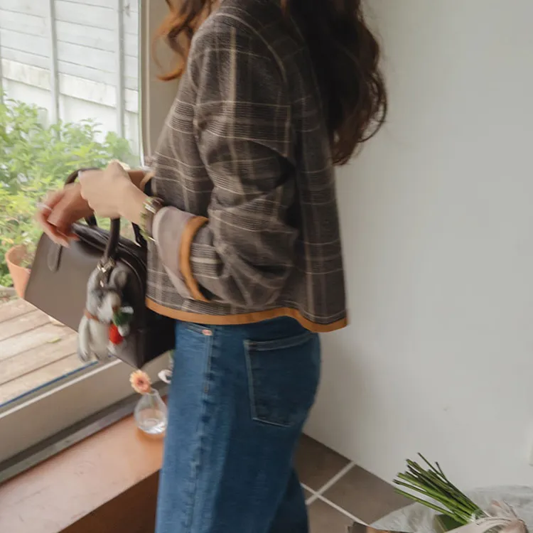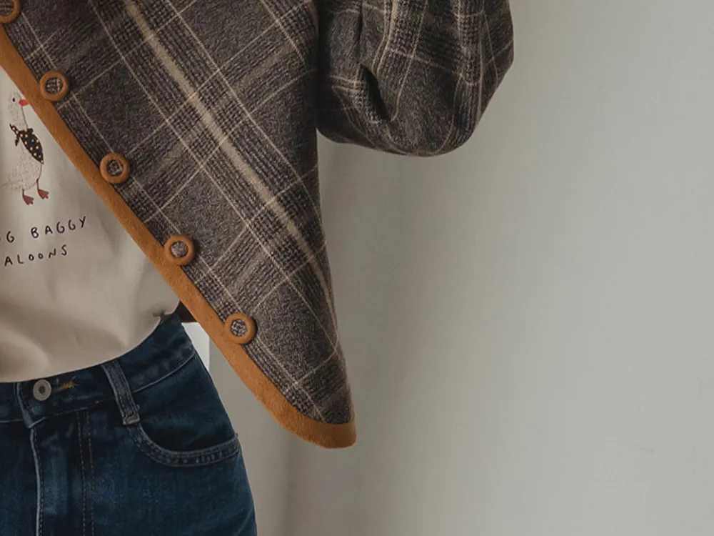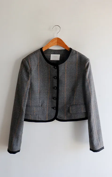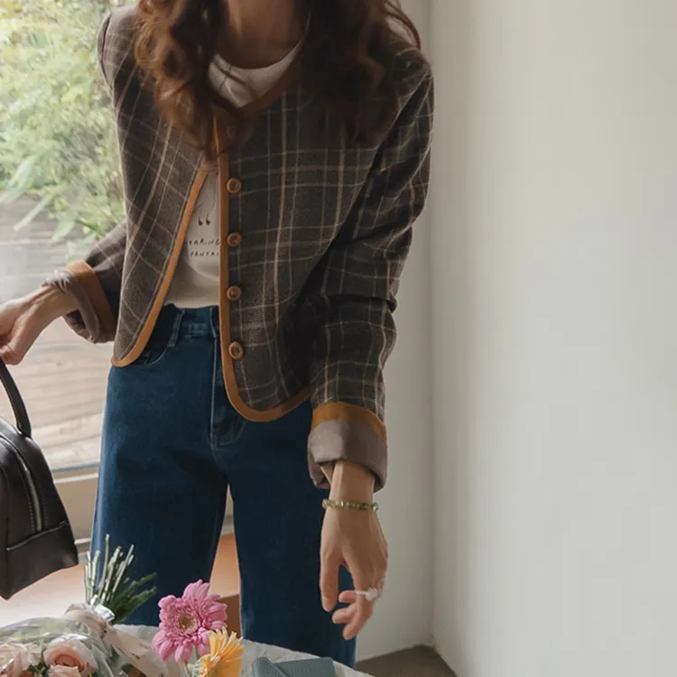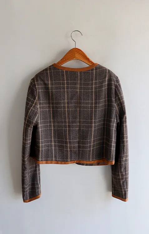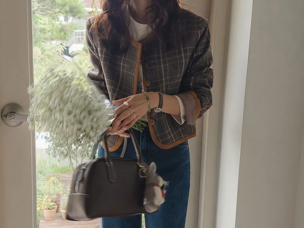 【時尚格紋+麂皮配色的外套】【雖然是含有天絲和氨綸面料的外套,但是輕薄舒適~】【獨特的鈕扣提升細節品質!