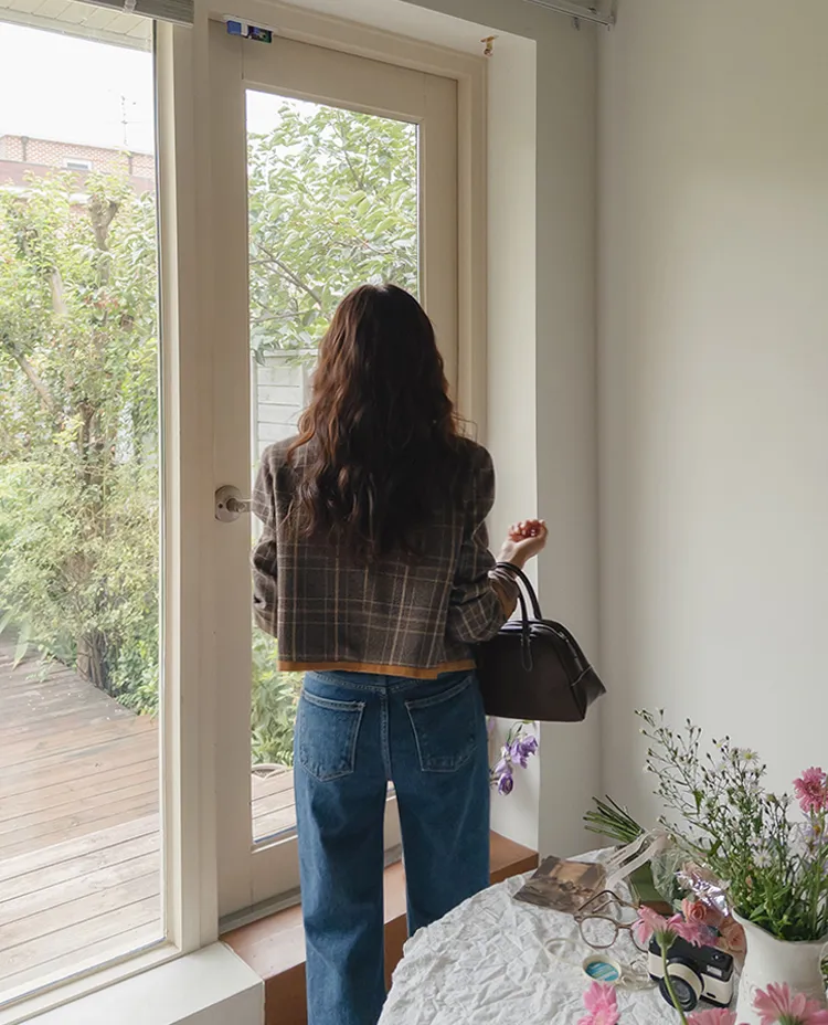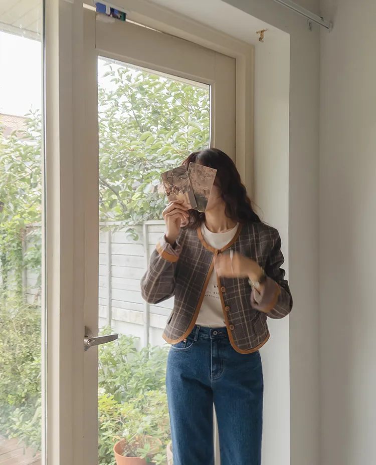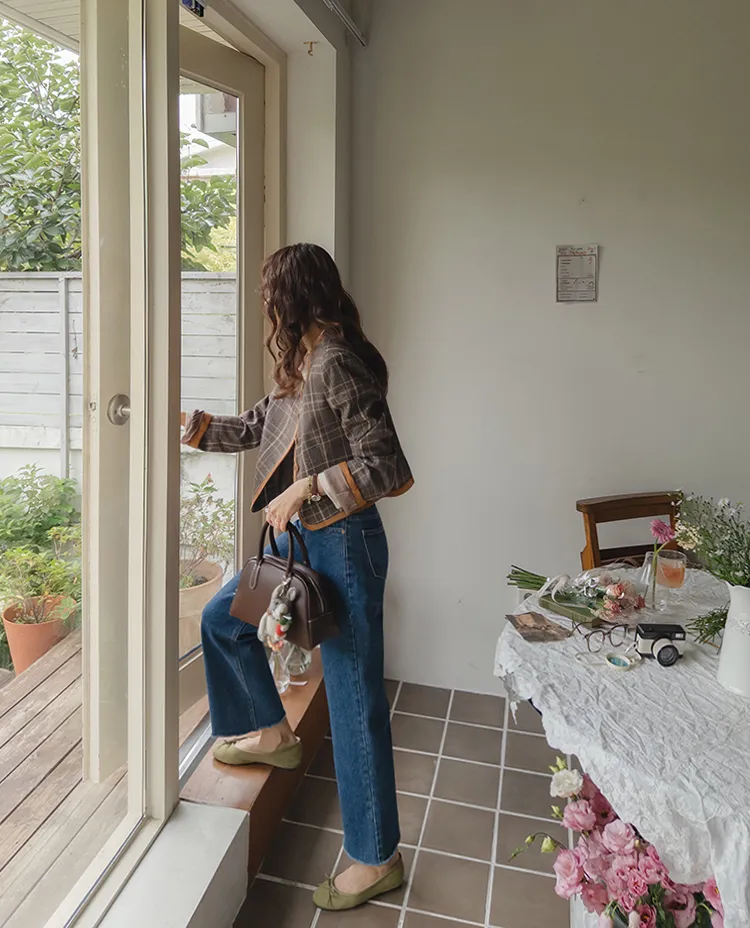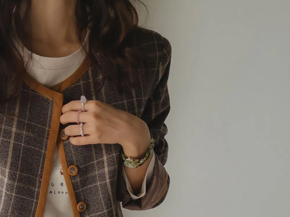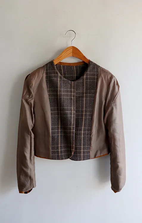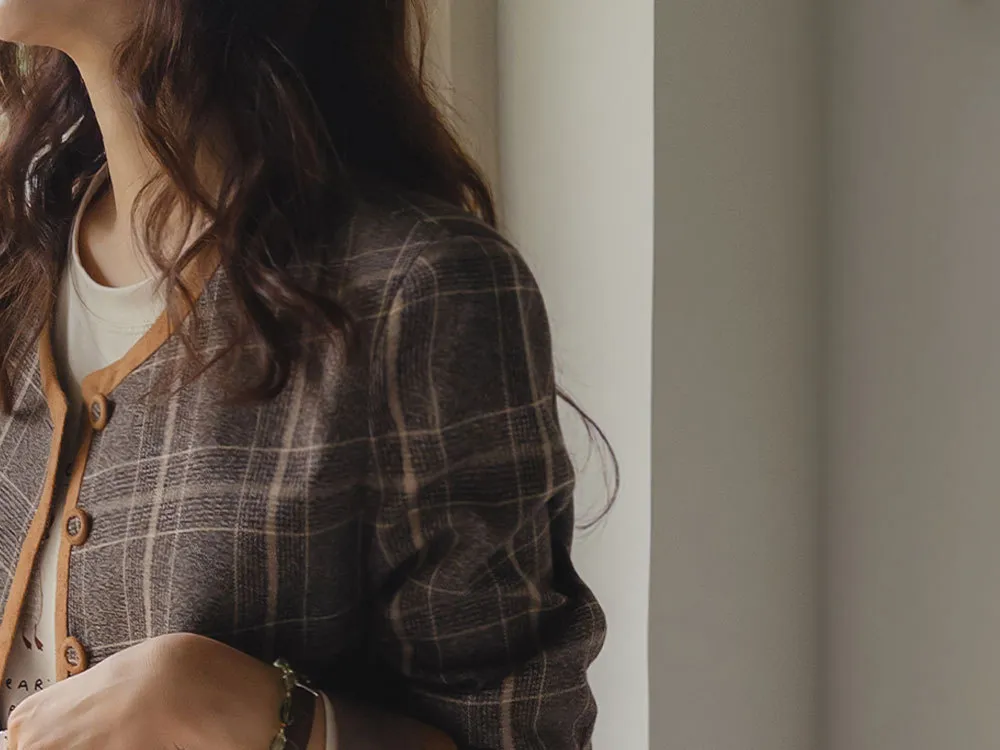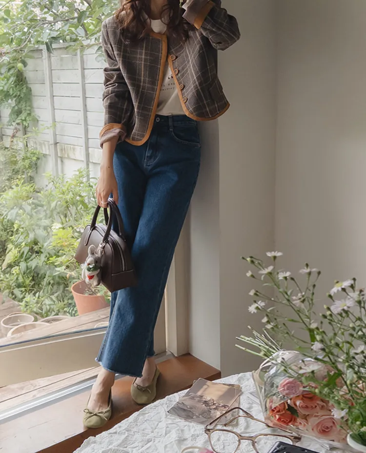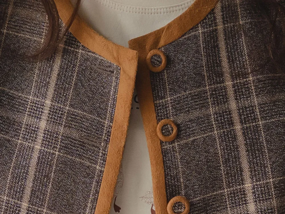 【時尚格紋+麂皮配色的外套】【雖然是含有天絲和氨綸面料的外套,但是輕薄舒適~】【獨特的鈕扣提升細節品質!