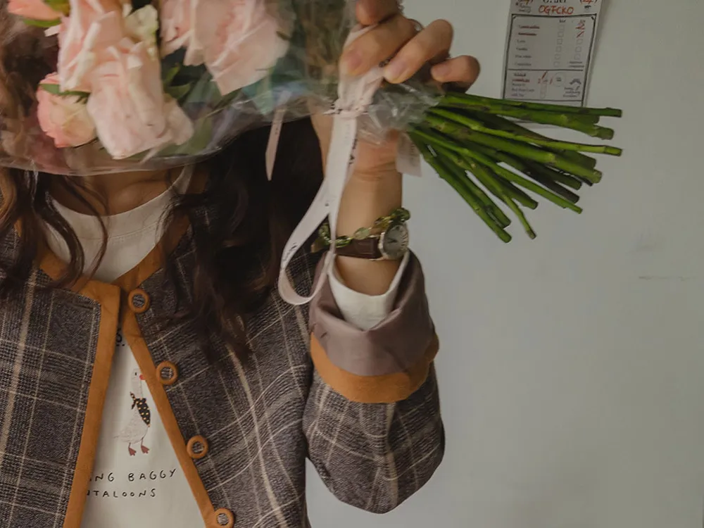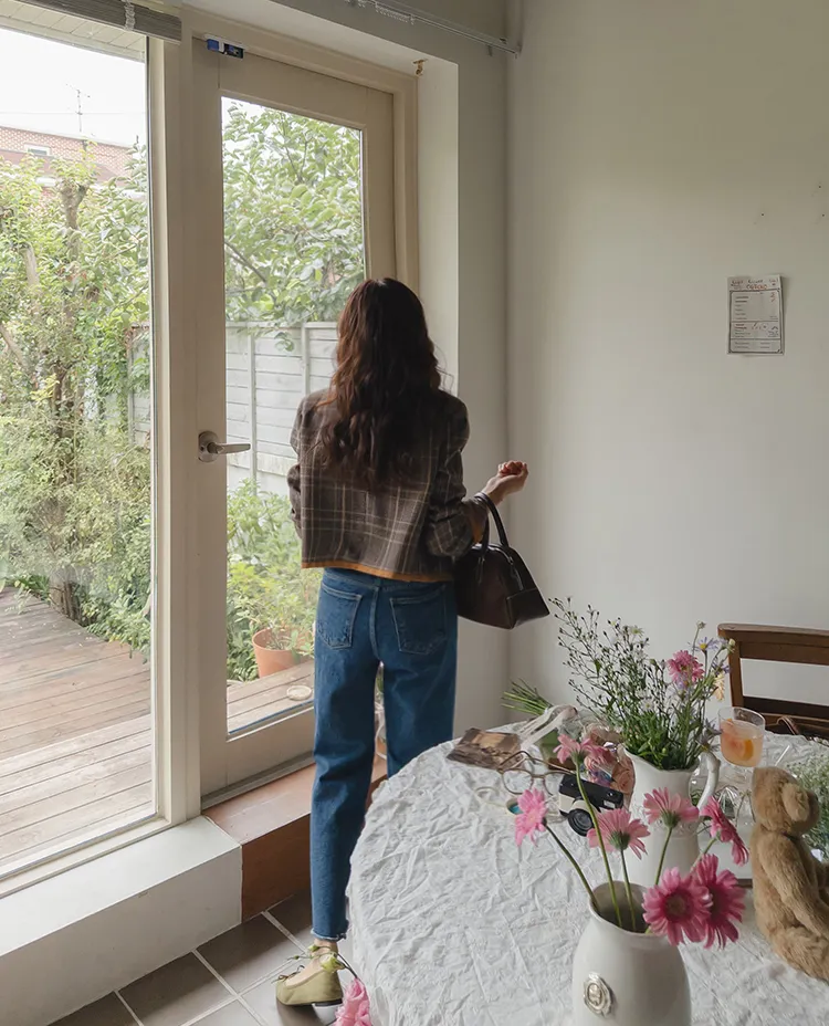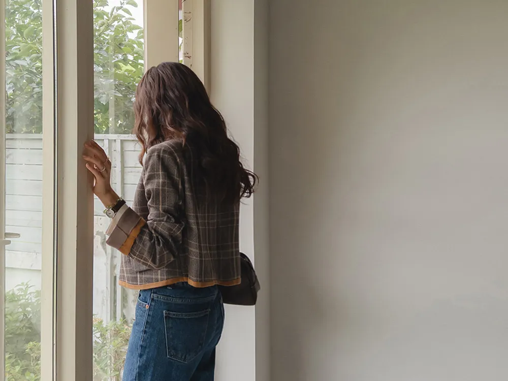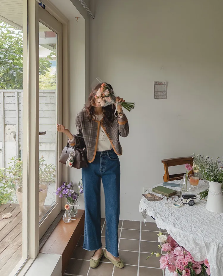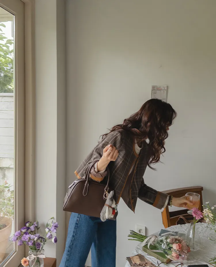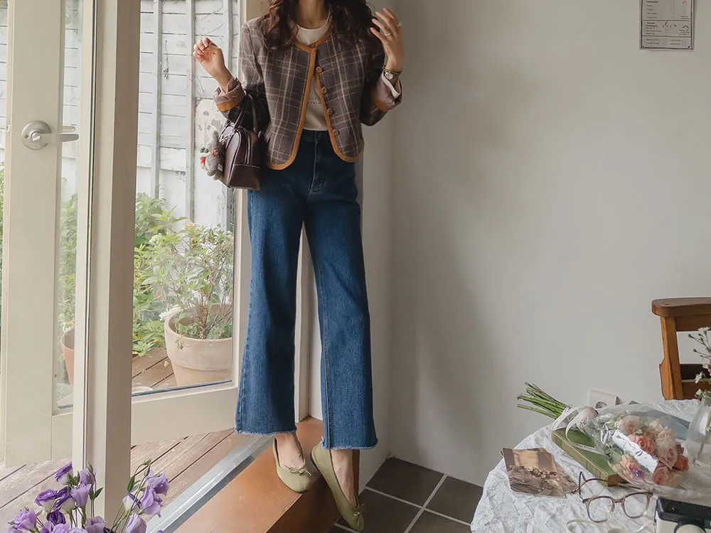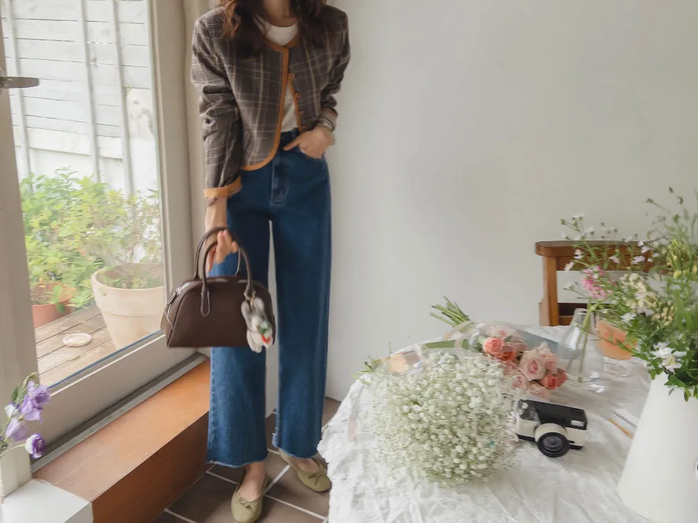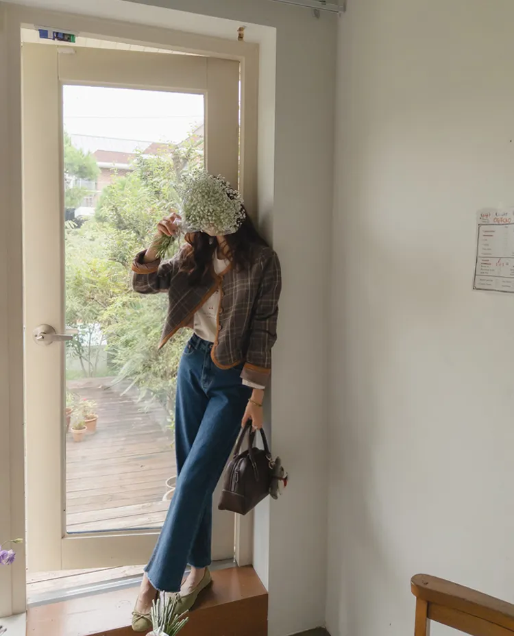 【時尚格紋+麂皮配色的外套】【雖然是含有天絲和氨綸面料的外套,但是輕薄舒適~】【獨特的鈕扣提升細節品質!