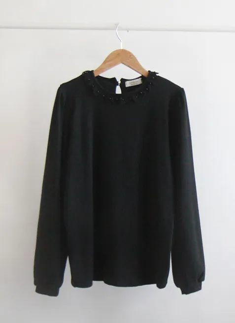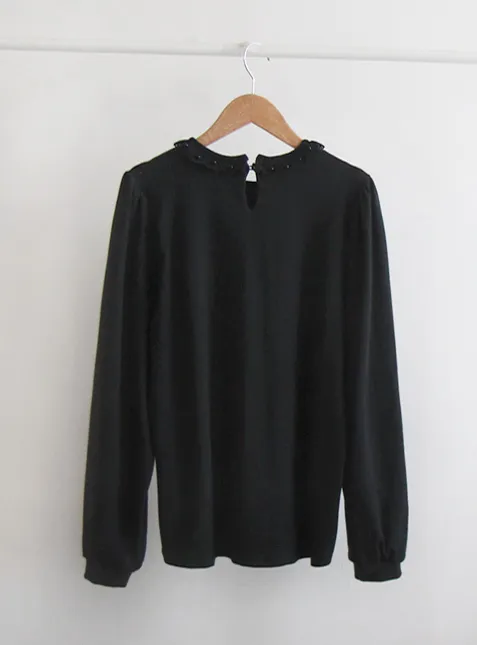 優雅蕾絲珍珠裝飾領口肩線剪裁絨質上衣