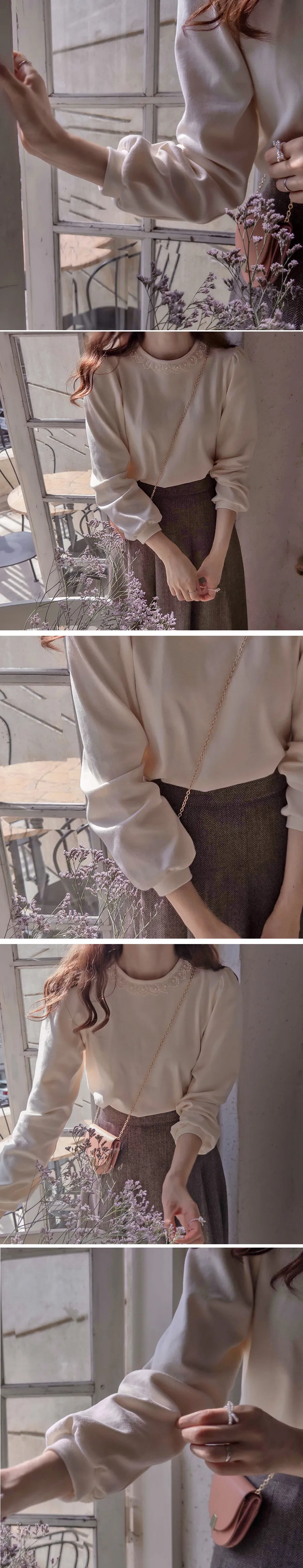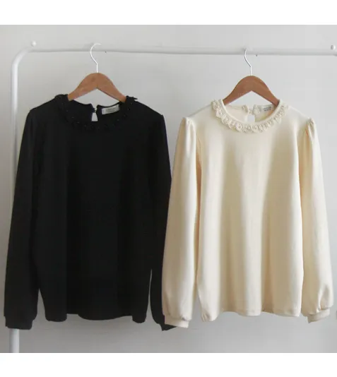 [適合即將到來的季節的拉絨上衣][明亮或精緻的彩色上衣][領口採用珍珠和蕾絲製成,營造出可愛的心情][肩部和袖子的剪裁也很漂亮][濃密有彈性穿著舒適彈性好]