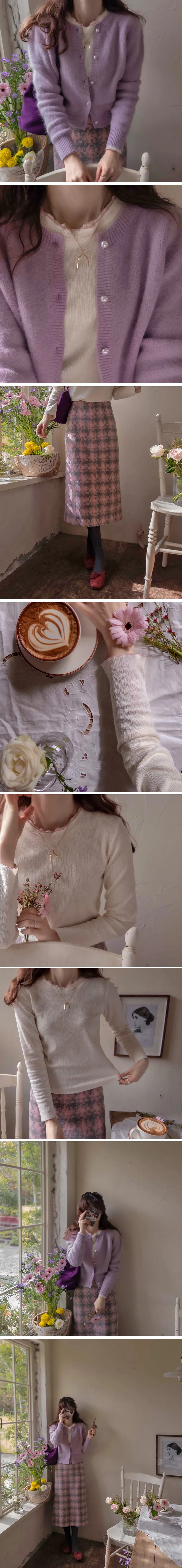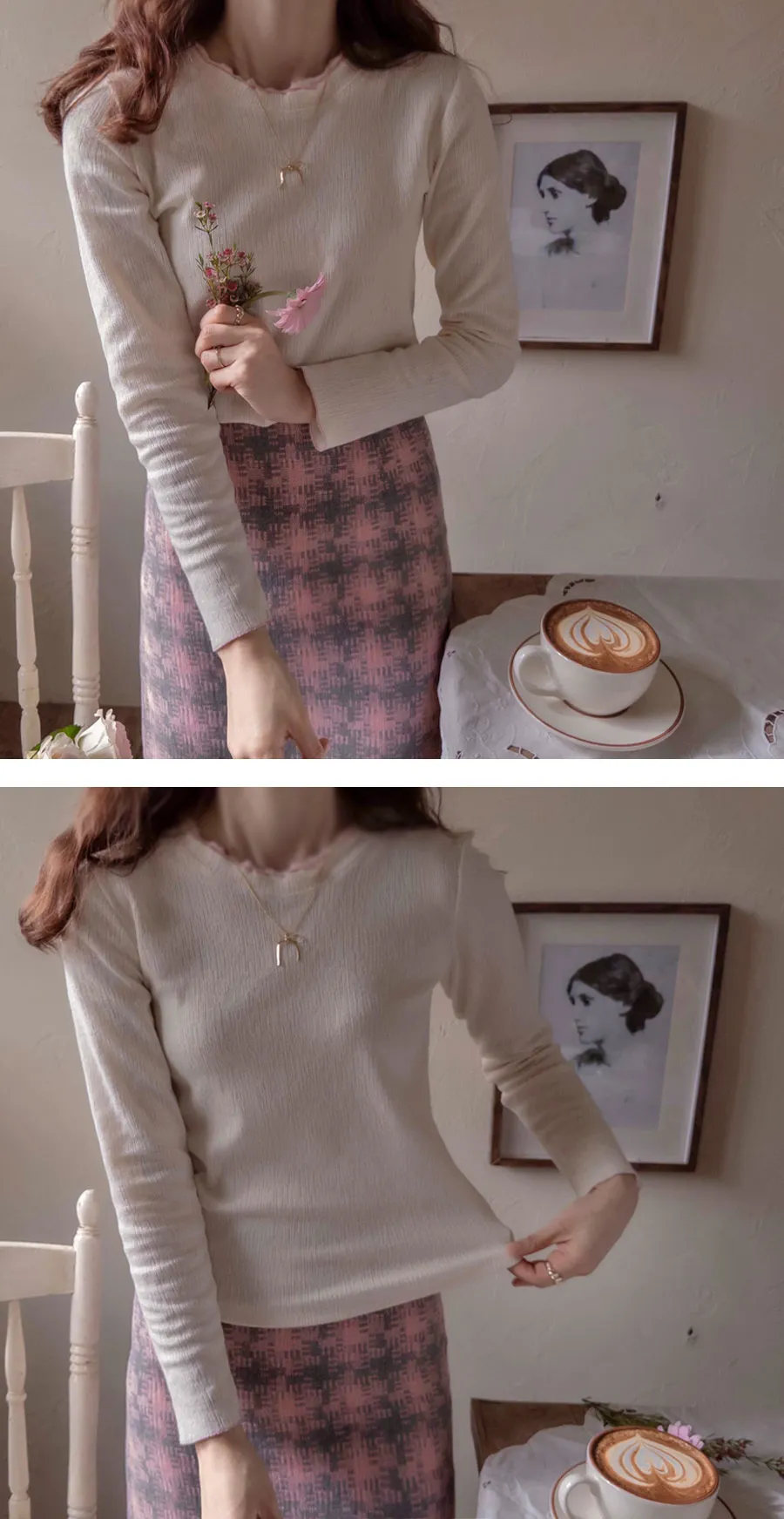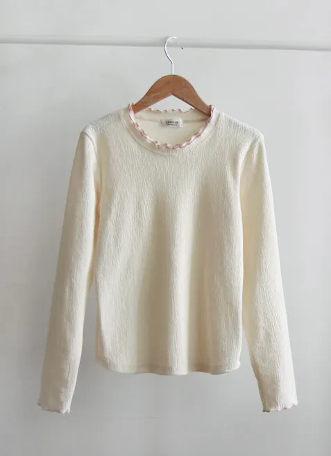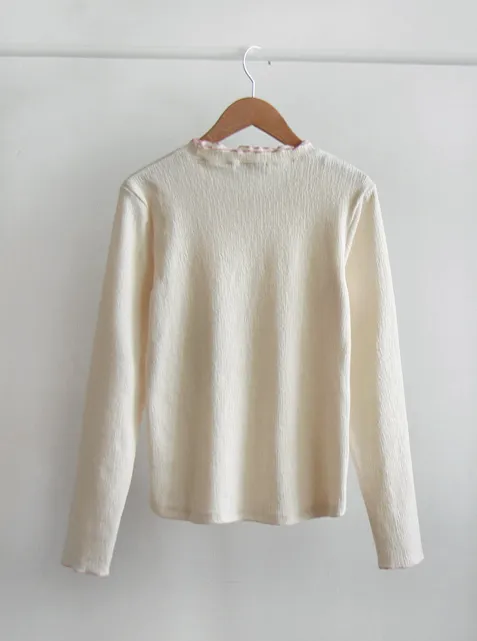 【領口:雙波浪上衣】【兩端的色彩組合營造出可愛的心情】【3%氨綸的耐嚼彈性】【可以單獨穿著或穿著搭配開衫】【實用又好穿搭的上衣】【寬鬆的修身上衣】