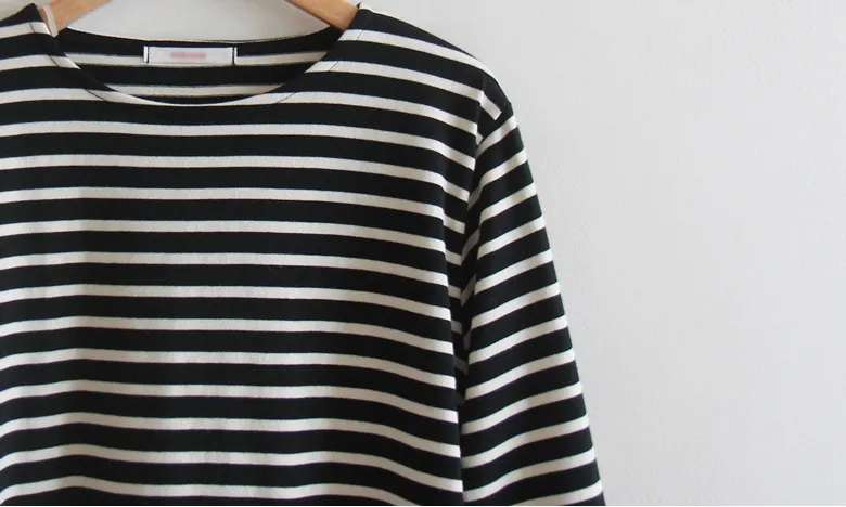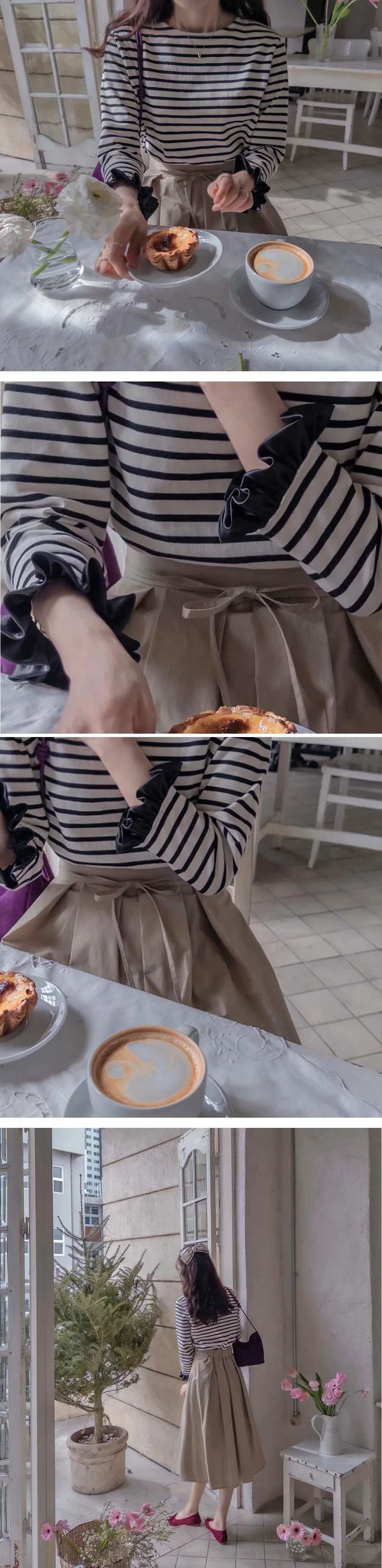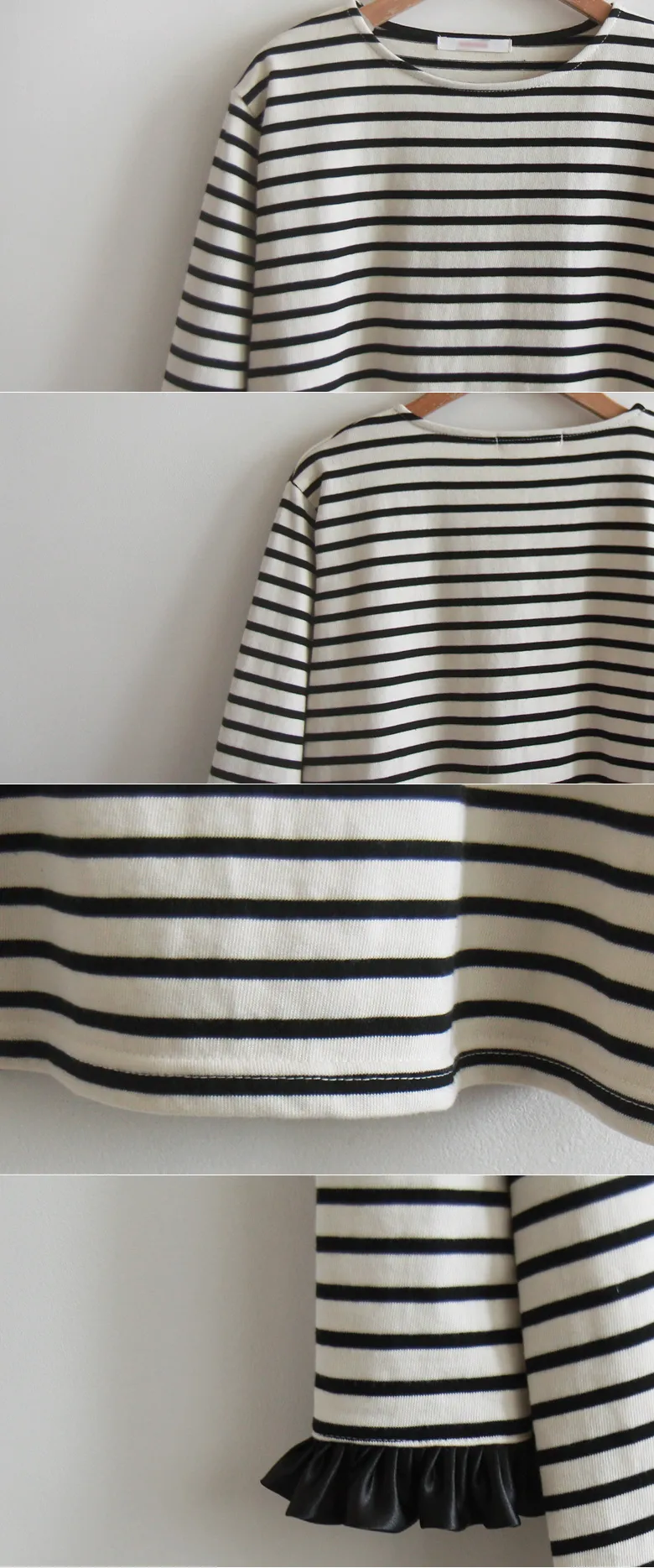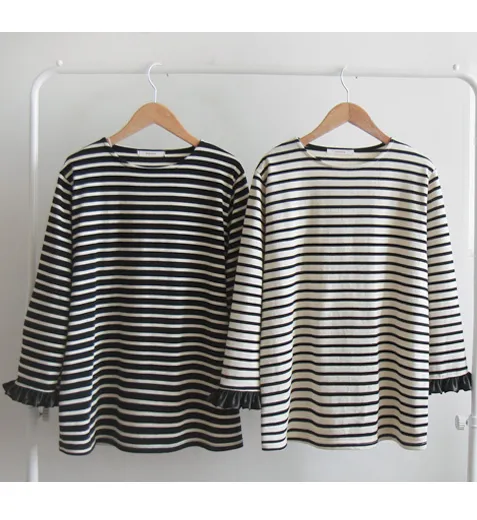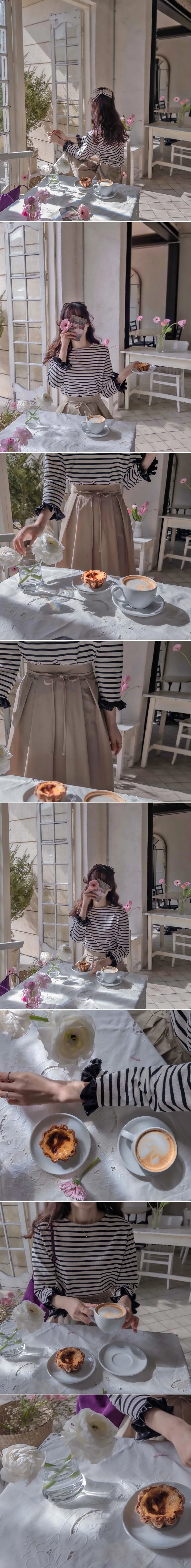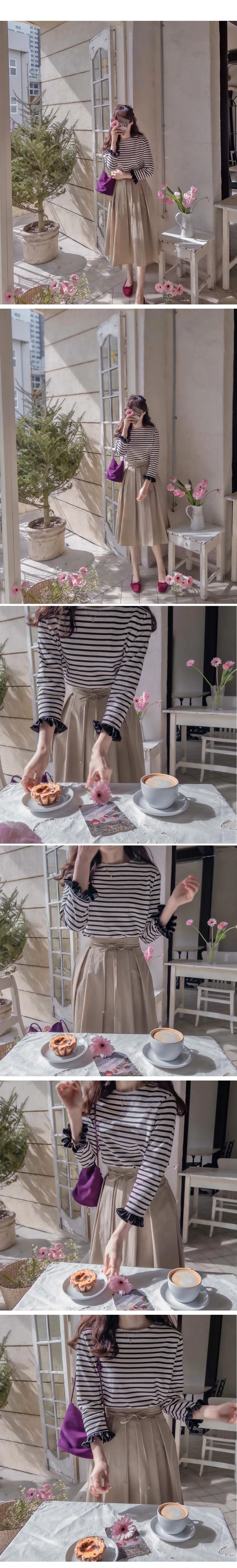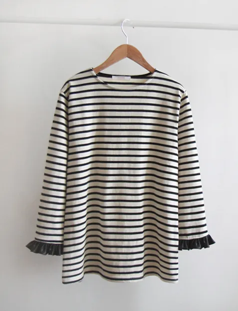 漂亮袖末摺邊裝飾條紋上衣