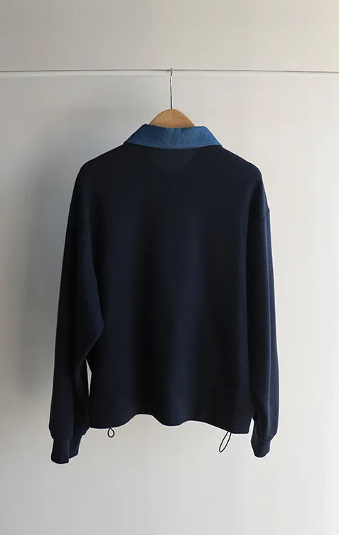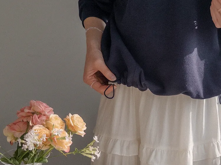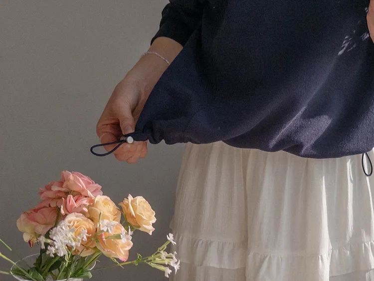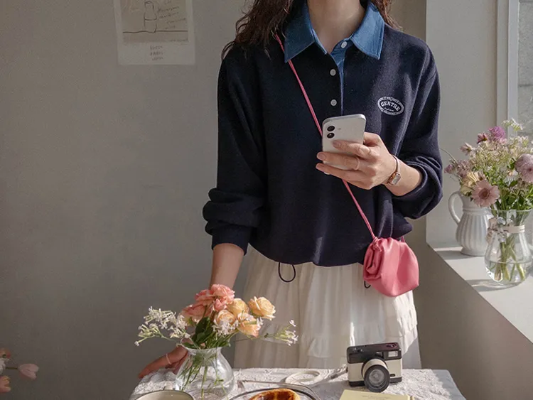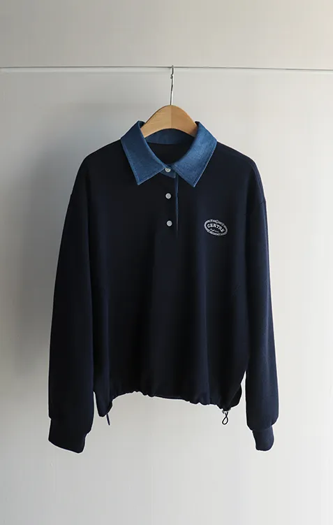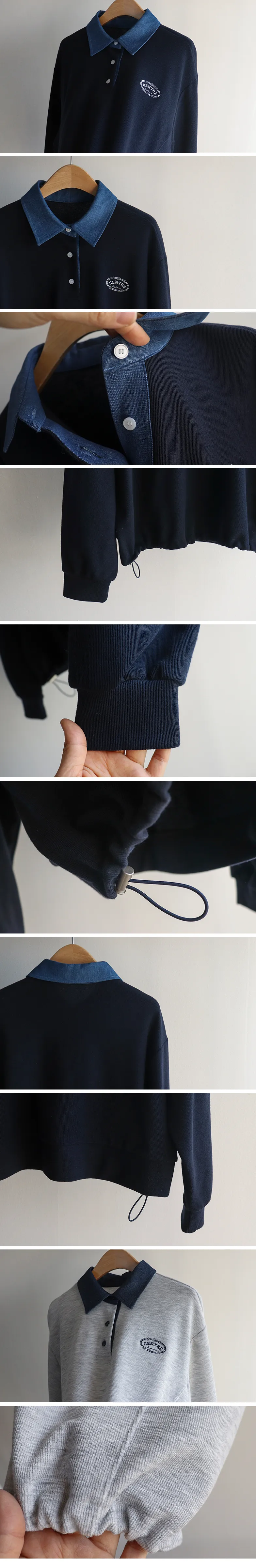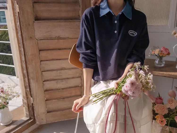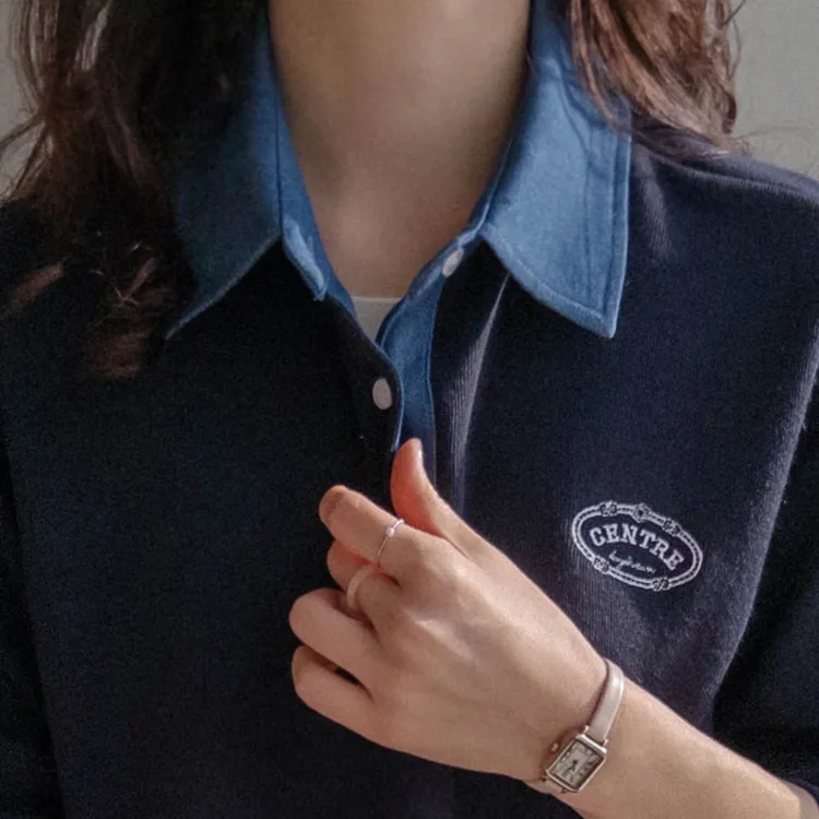 獨特配色翻領下擺抽繩收腰點綴刺繡上衣