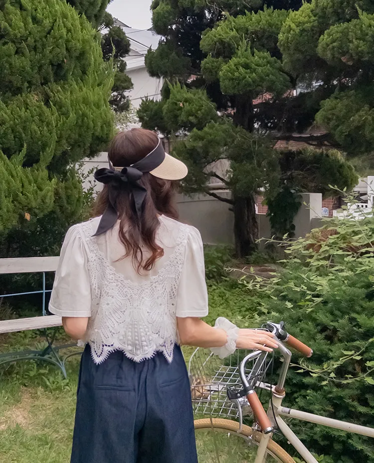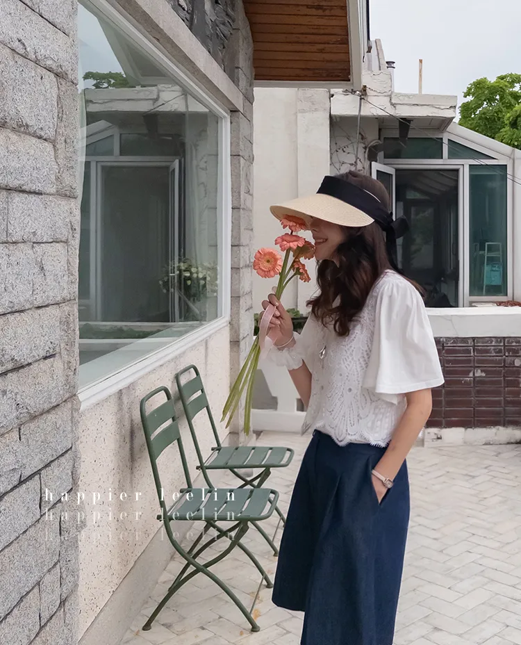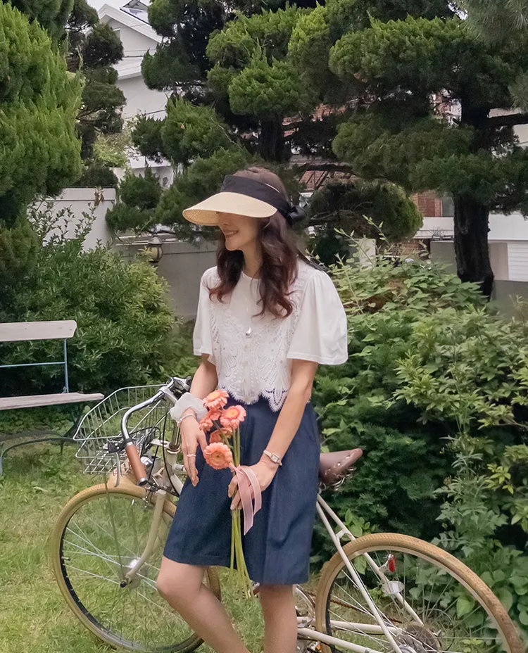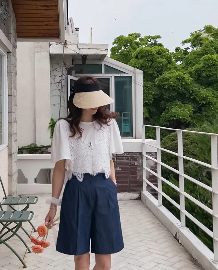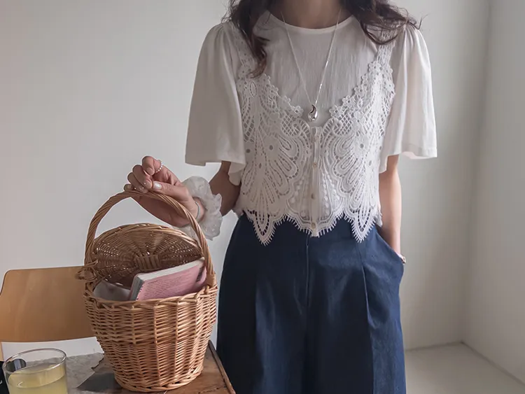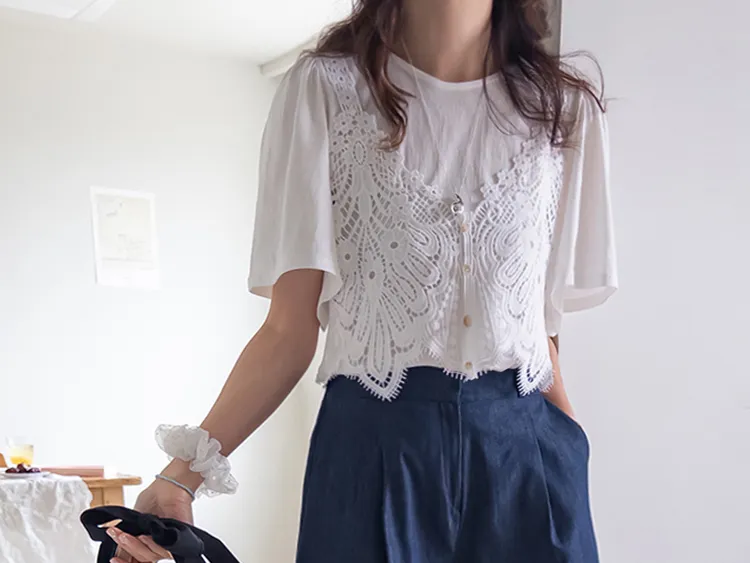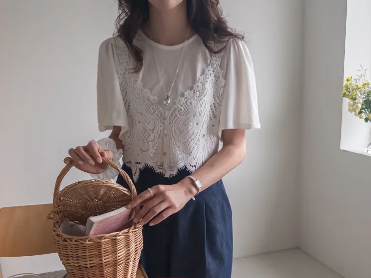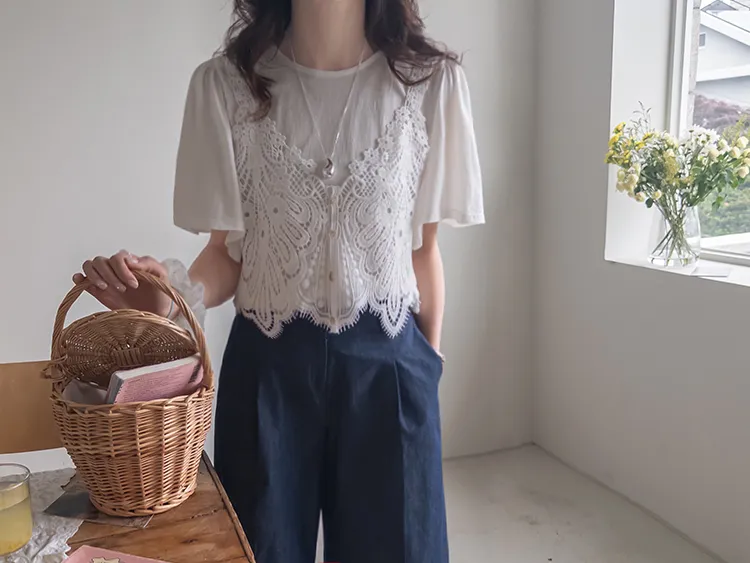 純色上衣和蝴蝶蕾絲背心的套裝