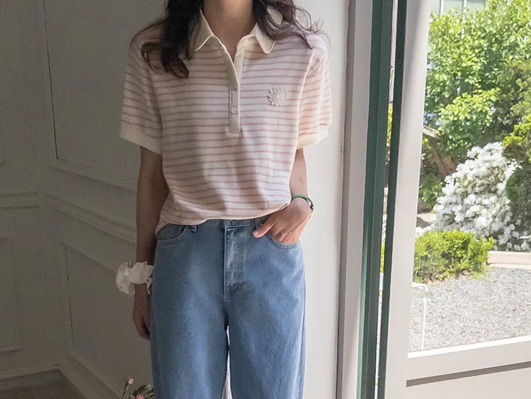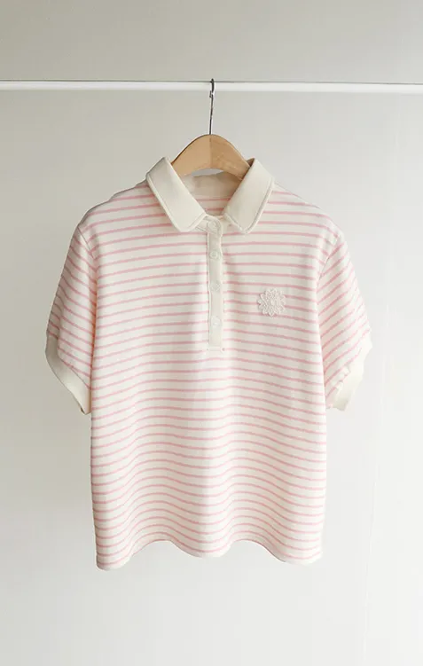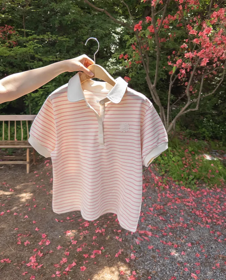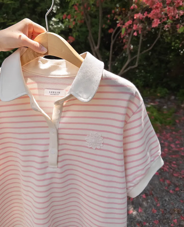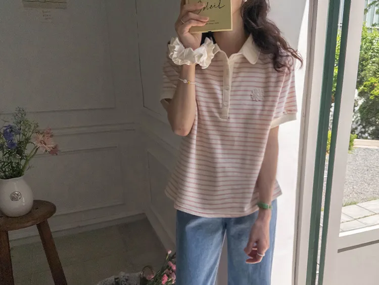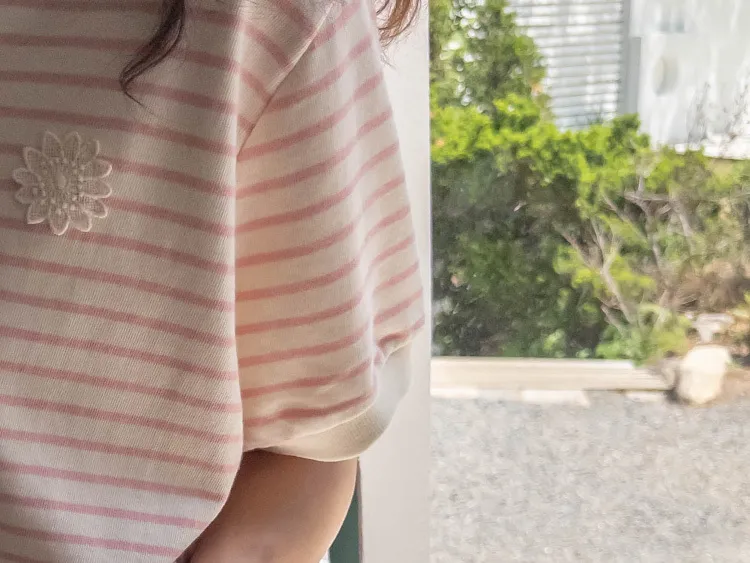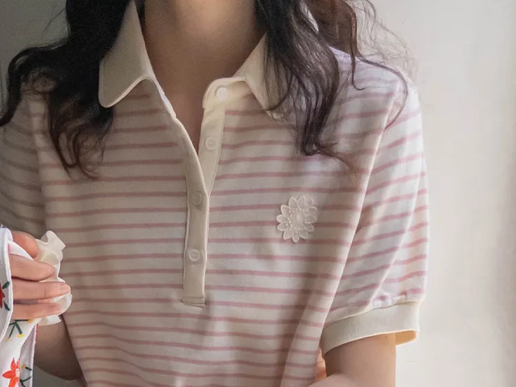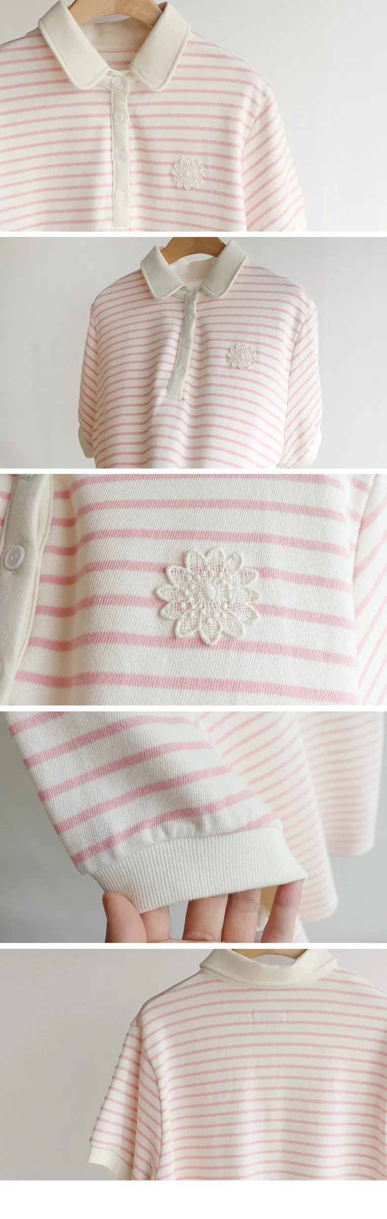 [可愛的粉紅配色條紋] [極簡花朵刺繡貼片點綴! ] [半開領設計,營造自然氛圍] [寬鬆的廓形,穿著舒適~]