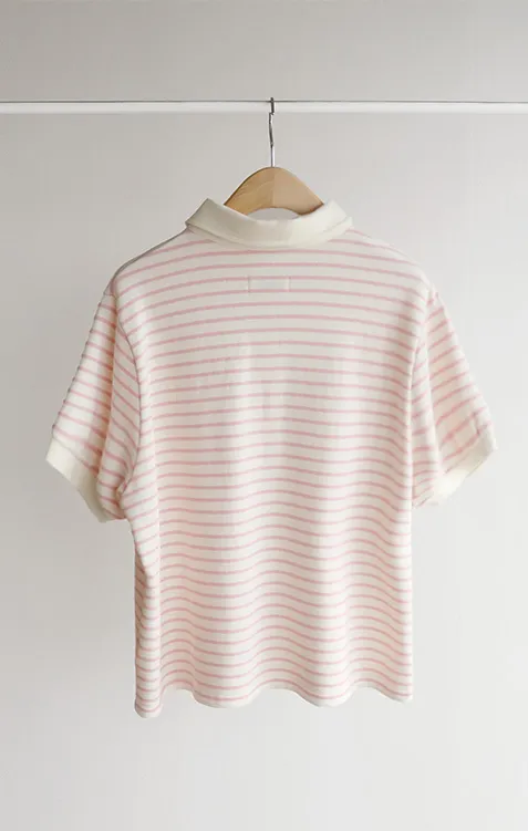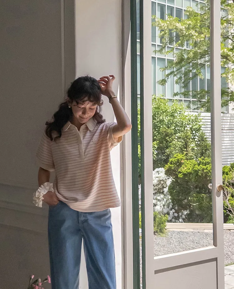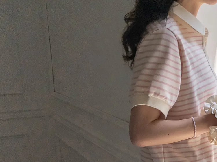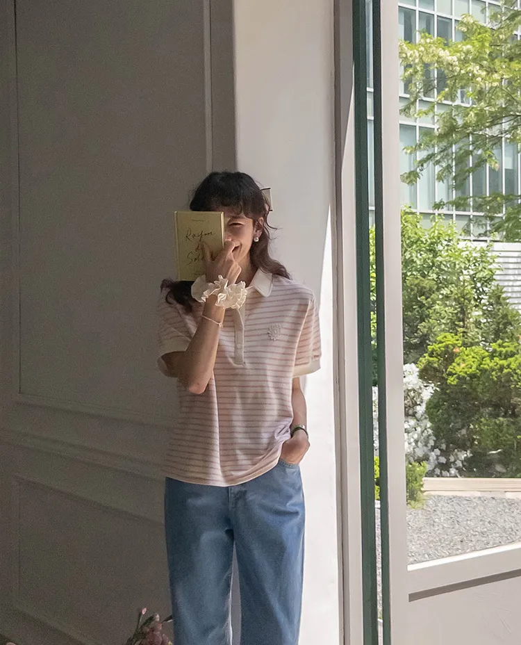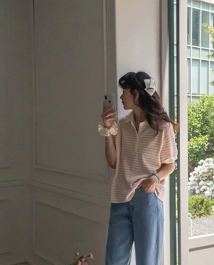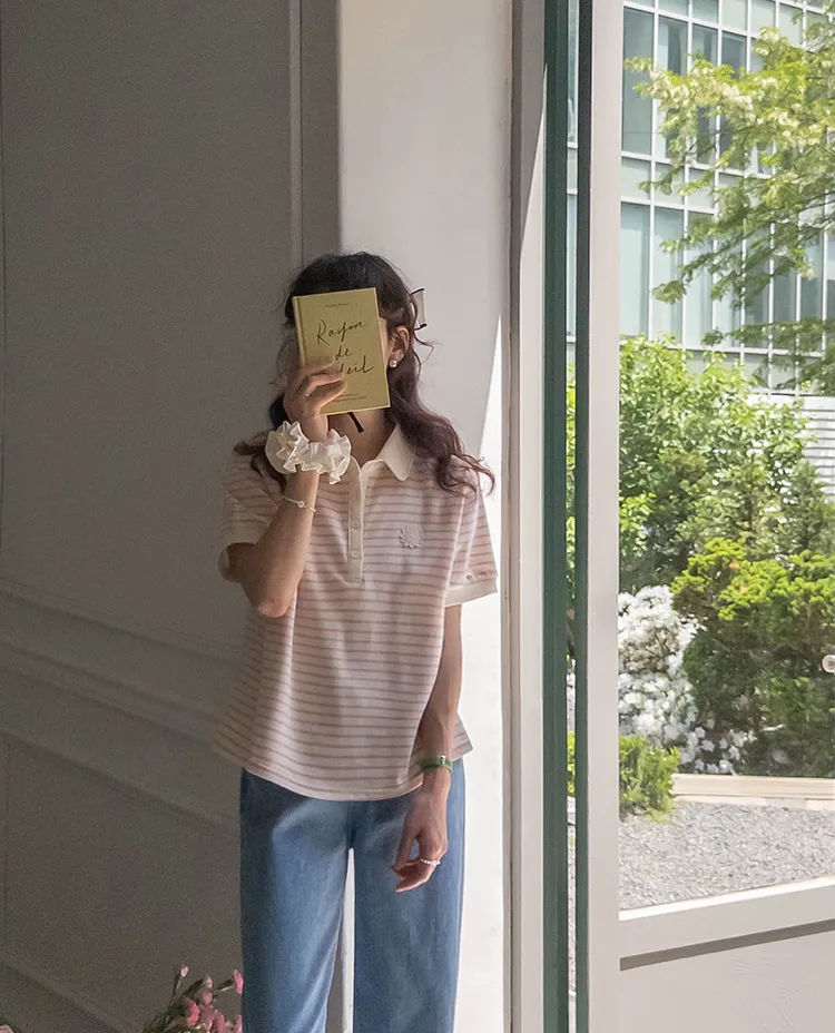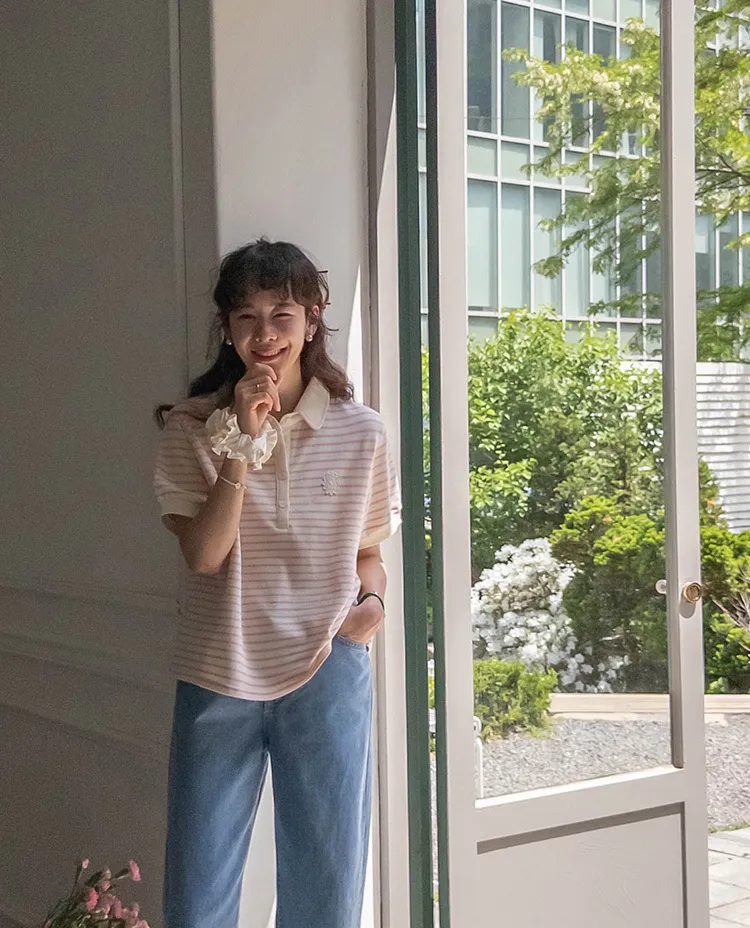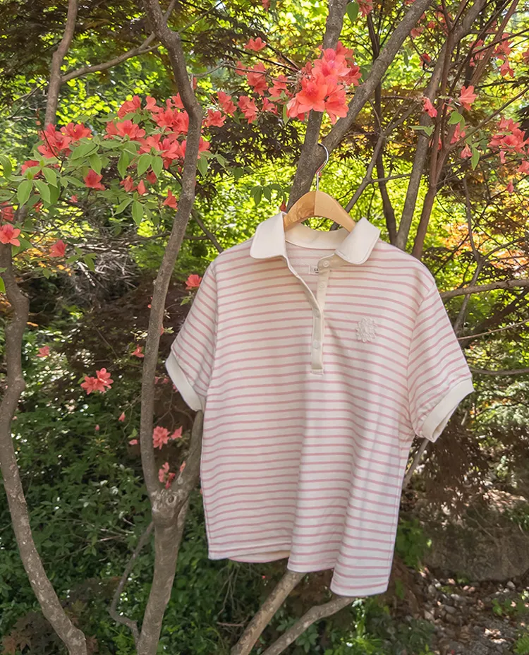 [可愛的粉紅配色條紋] [極簡花朵刺繡貼片點綴! ] [半開領設計,營造自然氛圍] [寬鬆的廓形,穿著舒適~]
