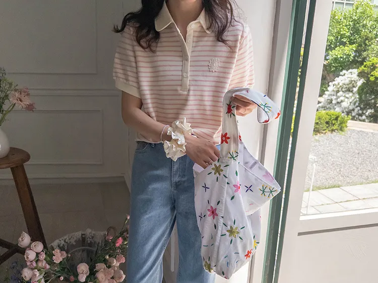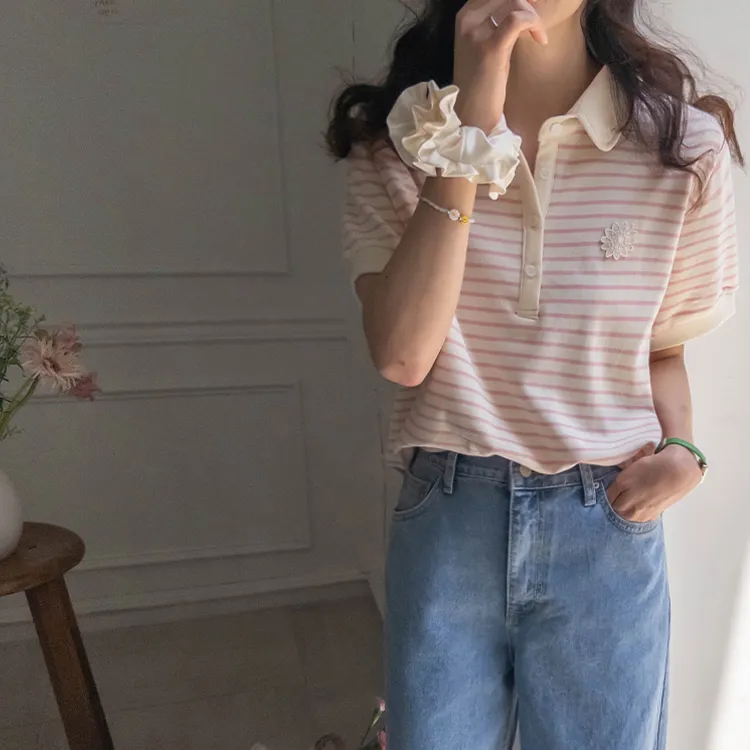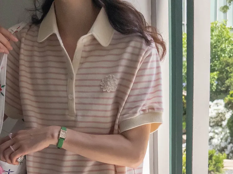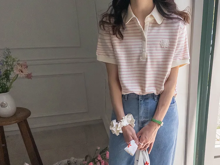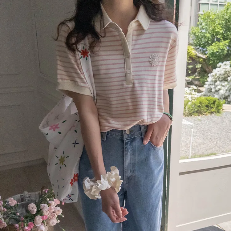 點綴花朵刺繡貼片翻領粉色條紋上衣