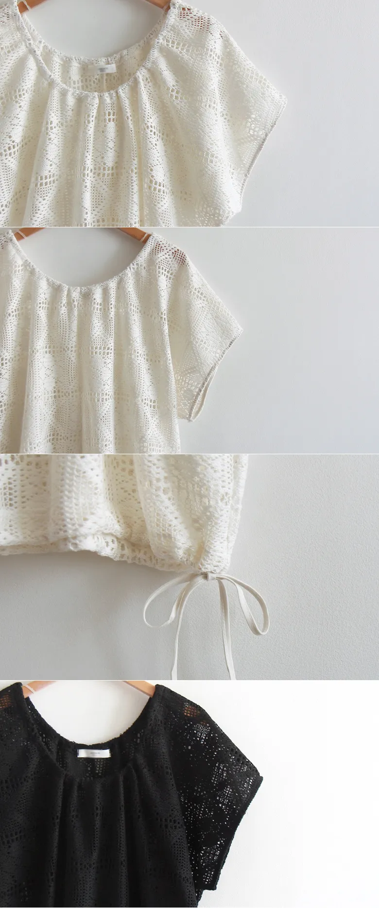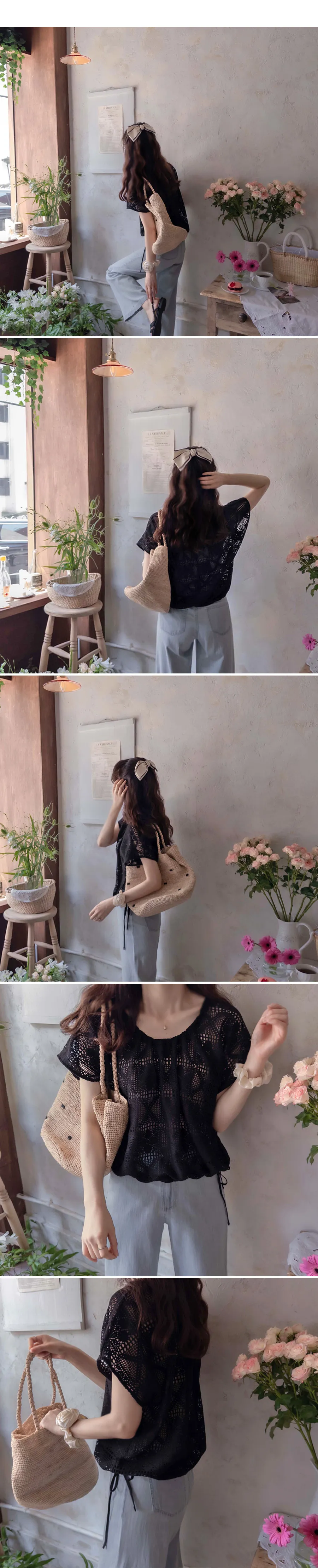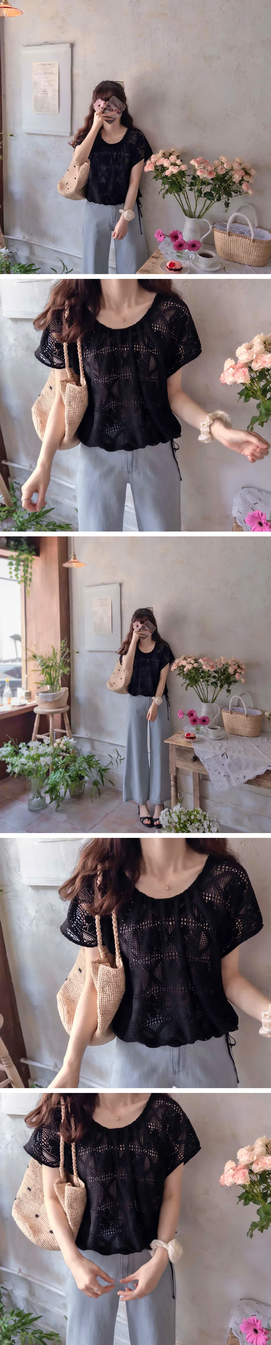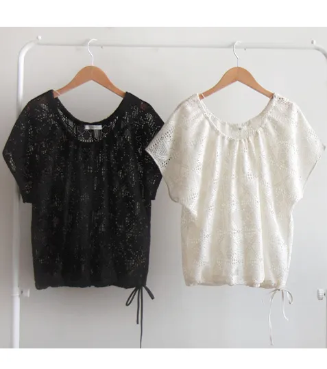 [領口:帶狀處理] [可調節腰帶:連接] [鉤編感覺的可愛情調上衣] [透視設計非常適合夏季] [將腰帶調整到合適的尺寸,用蝴蝶結繫起來,看起來更可愛] [非常適合以明亮精緻的方式穿著]