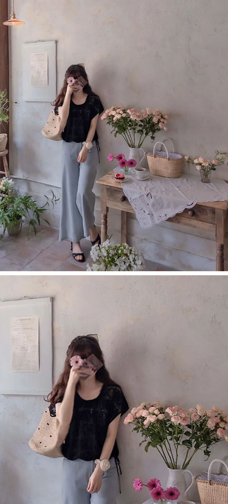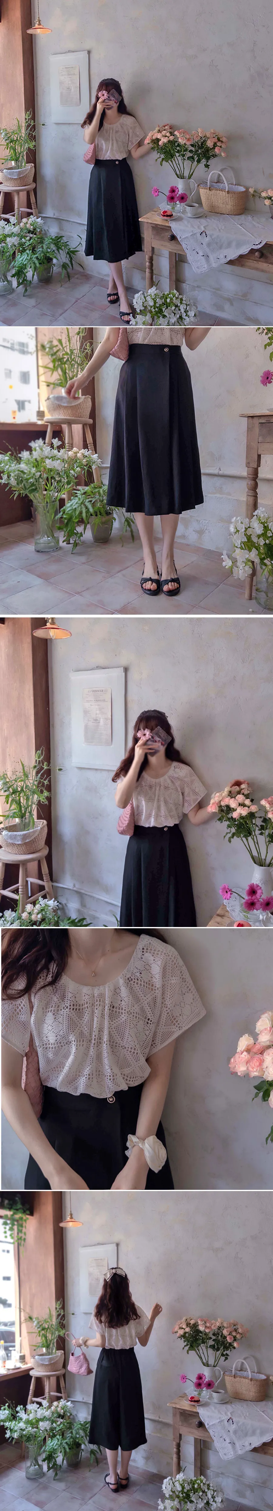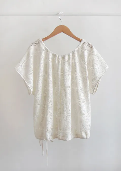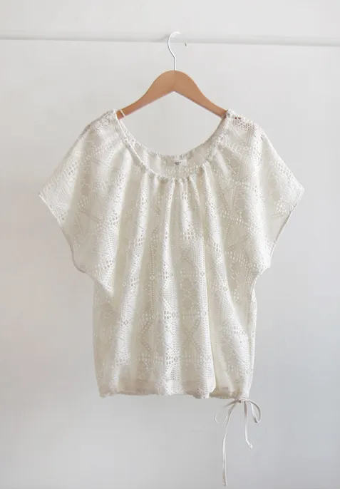 [領口:帶狀處理] [可調節腰帶:連接] [鉤編感覺的可愛情調上衣] [透視設計非常適合夏季] [將腰帶調整到合適的尺寸,用蝴蝶結繫起來,看起來更可愛] [非常適合以明亮精緻的方式穿著]