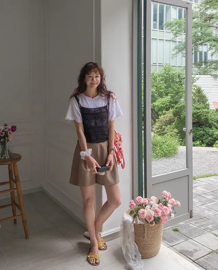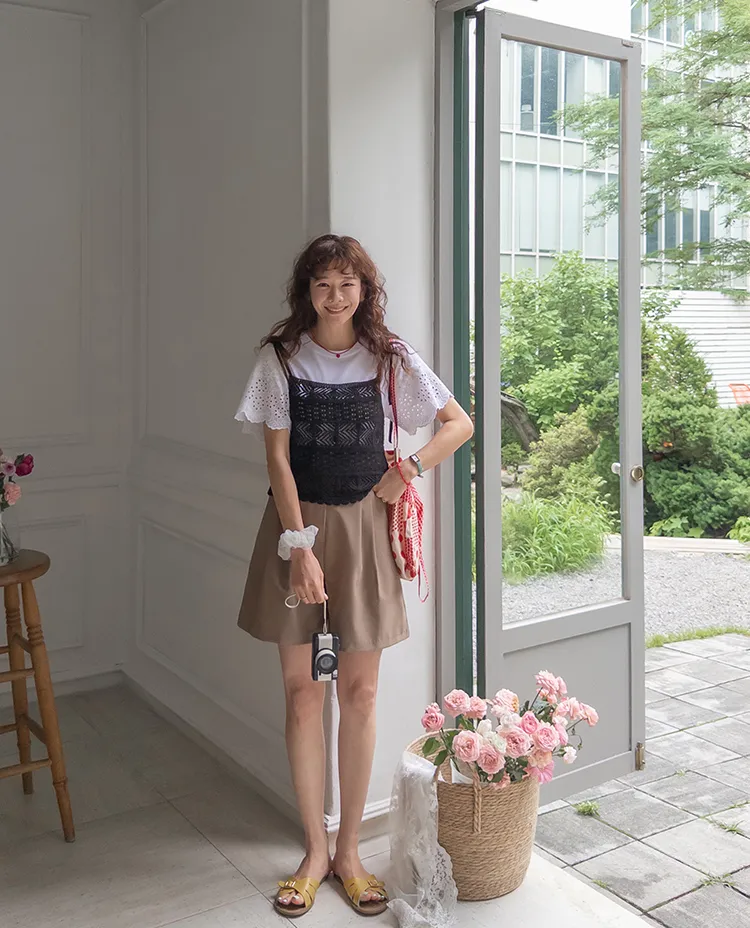 可愛斜紋編織下擺波浪邊肩綁帶穿搭背心